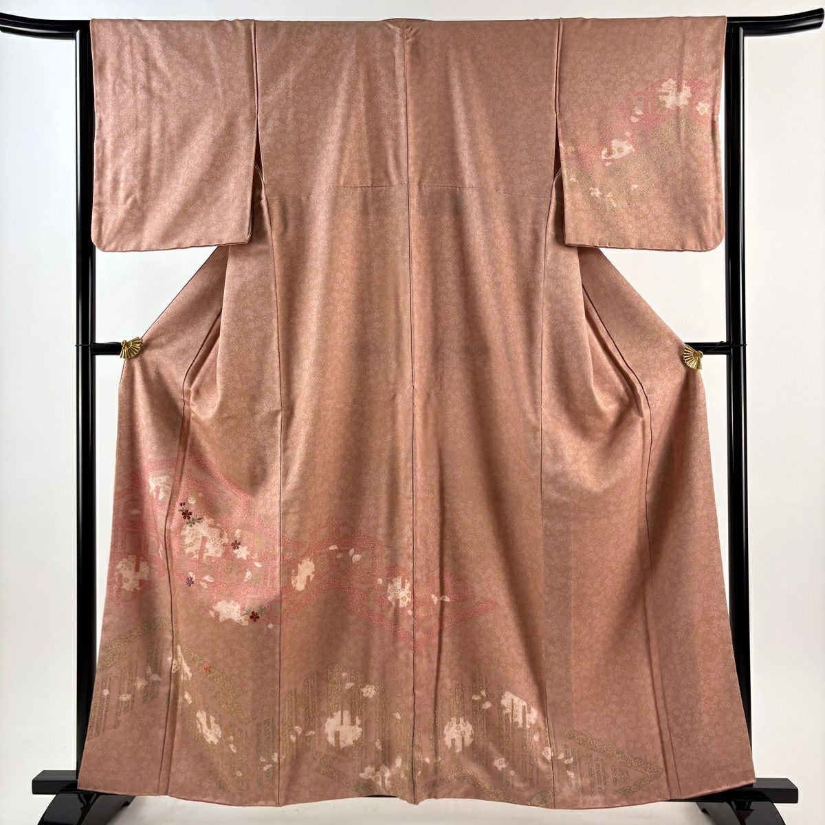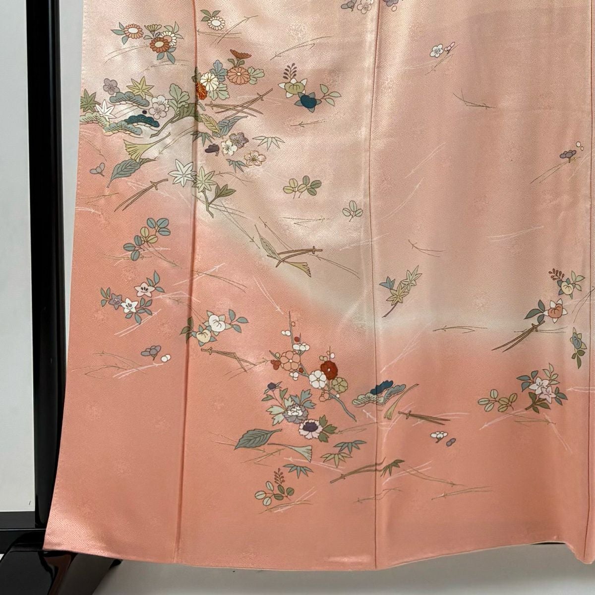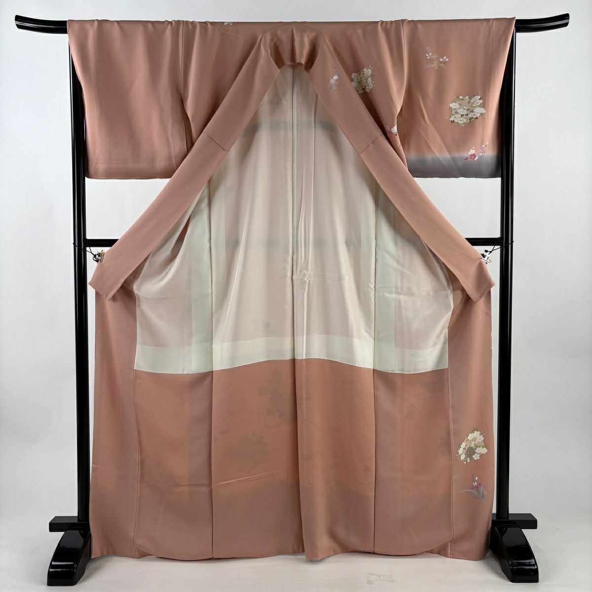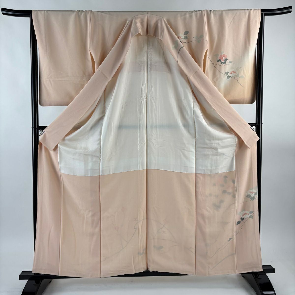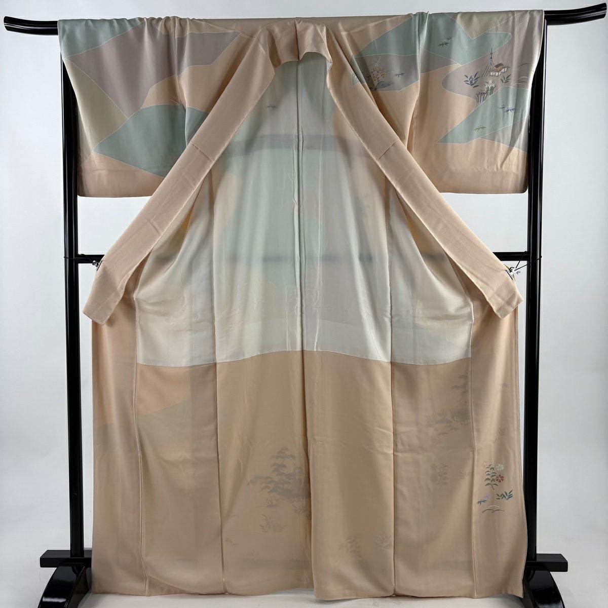 訪問着 身丈156cm 裄丈64cm M 袷 道長取 草花 ぼかし 絞り ピンクベージュ 正絹 秀品