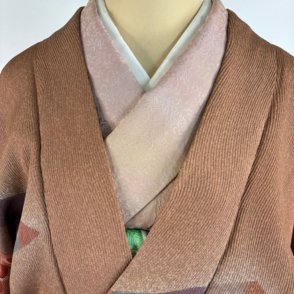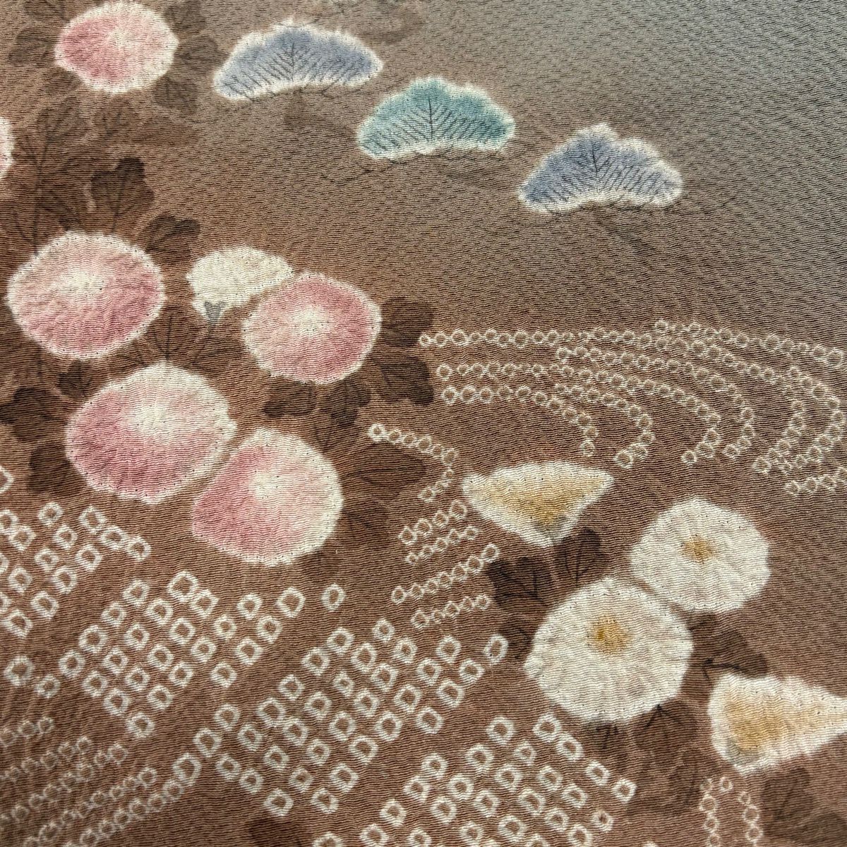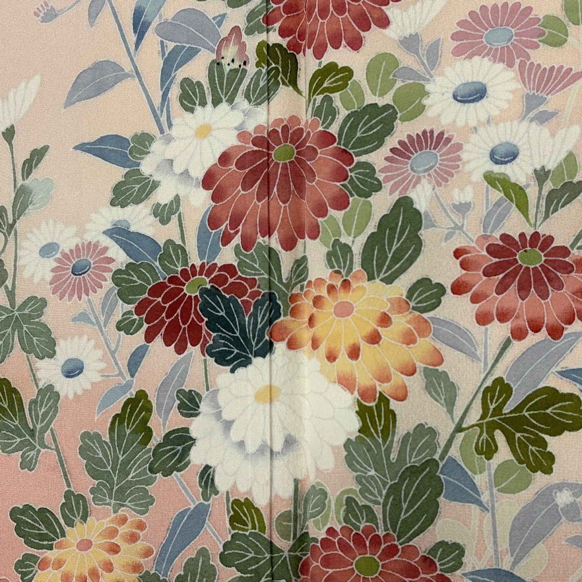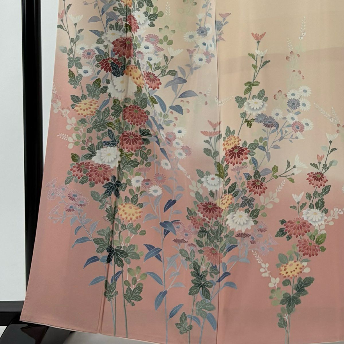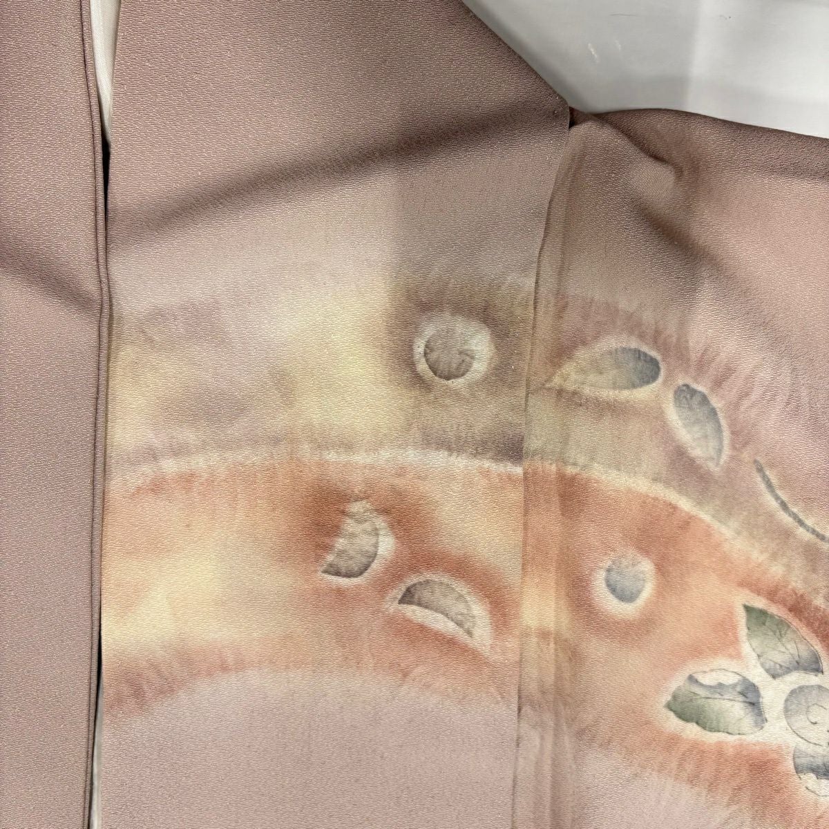 訪問着 身丈156cm 裄丈64cm M 袷 道長取 草花 ぼかし 絞り ピンクベージュ 正絹 秀品