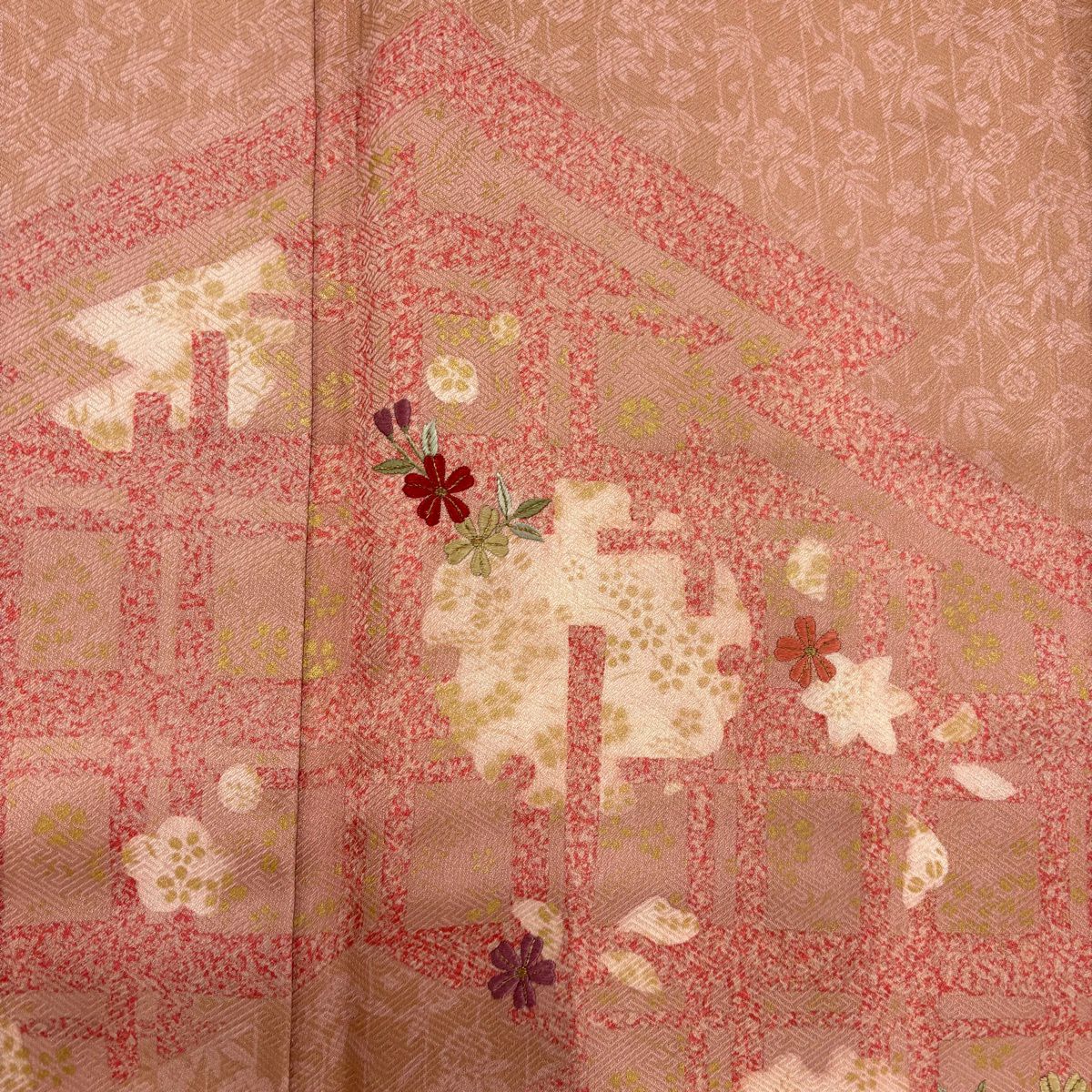 訪問着 身丈160.5cm 裄丈64cm M 袷 建物 雪輪 刺繍 金彩 ピンクベージュ 正絹 秀品