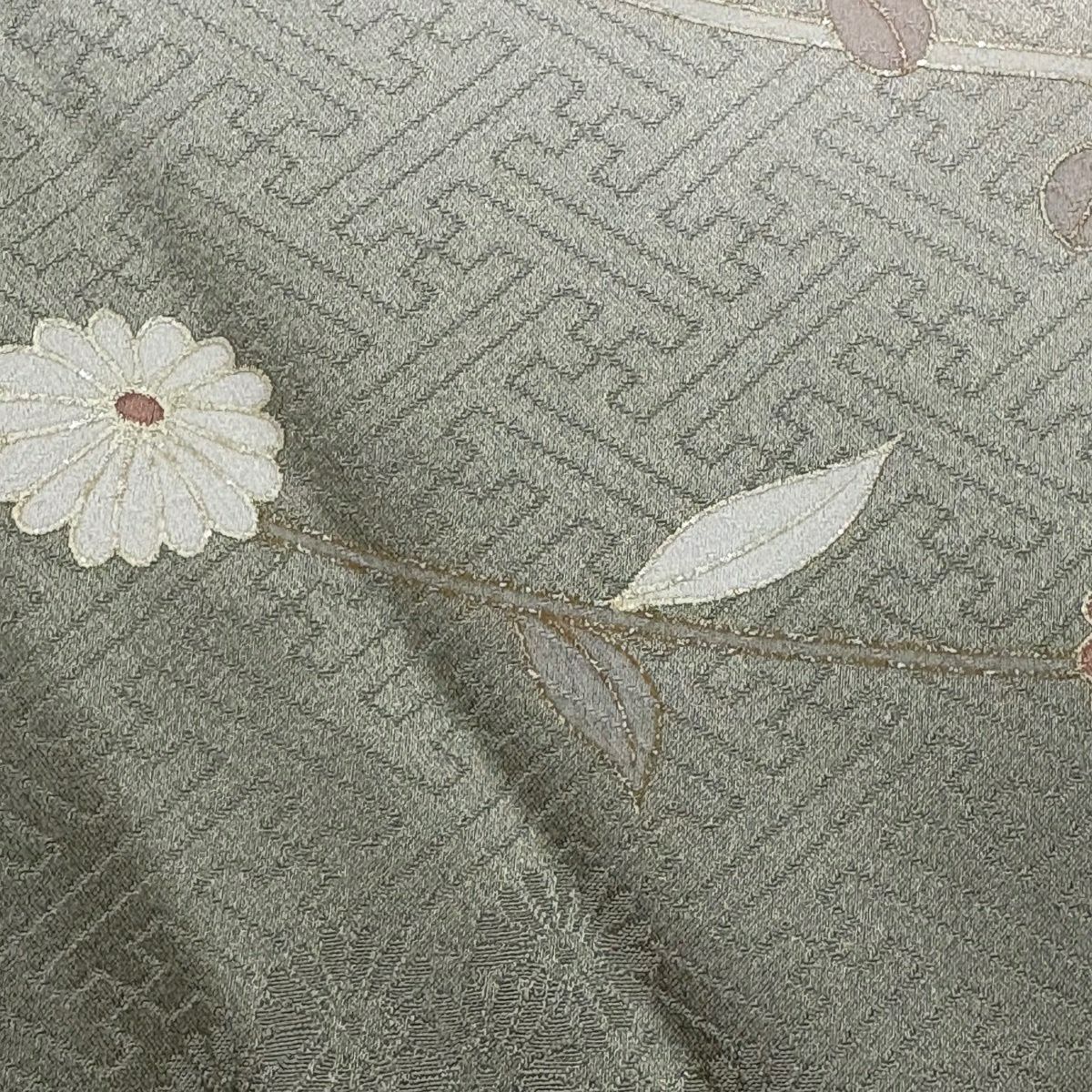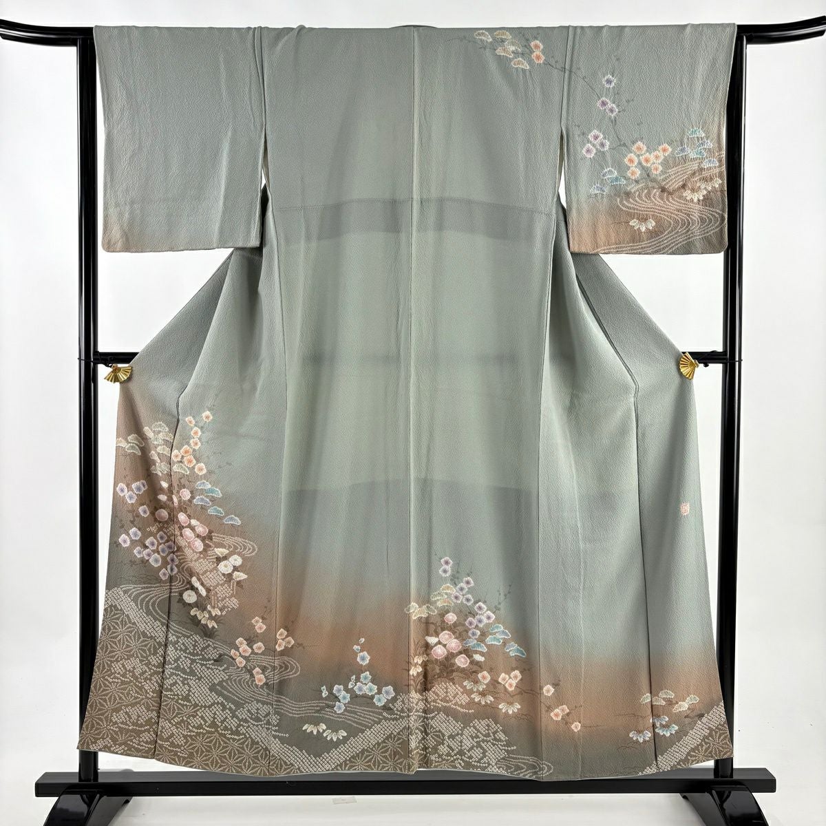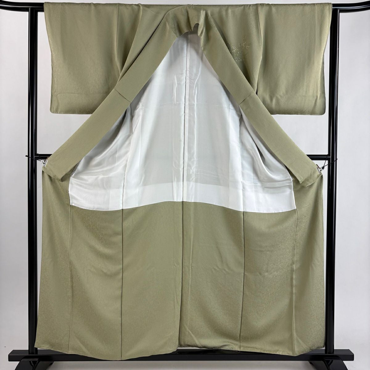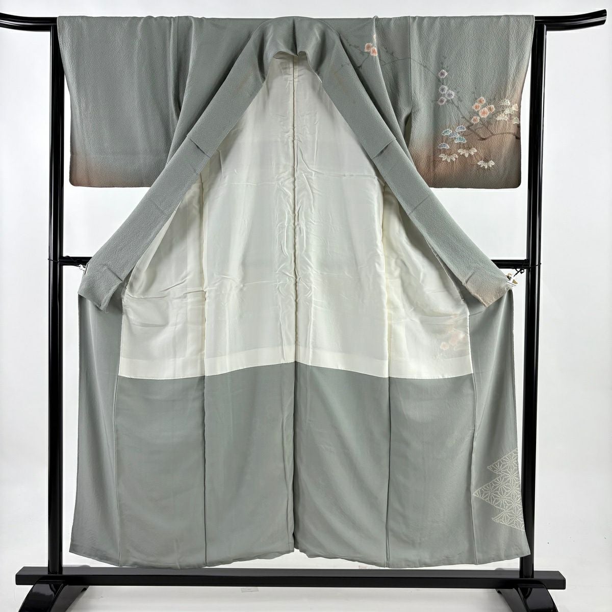 【美品】 付下げ 身丈159.5cm 裄丈62cm S 袷 松梅 菊 刺繍 金糸 灰緑 正絹 秀品 一つ紋