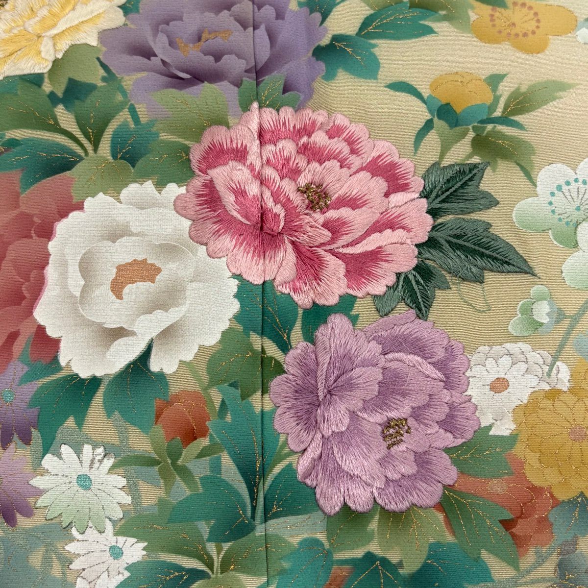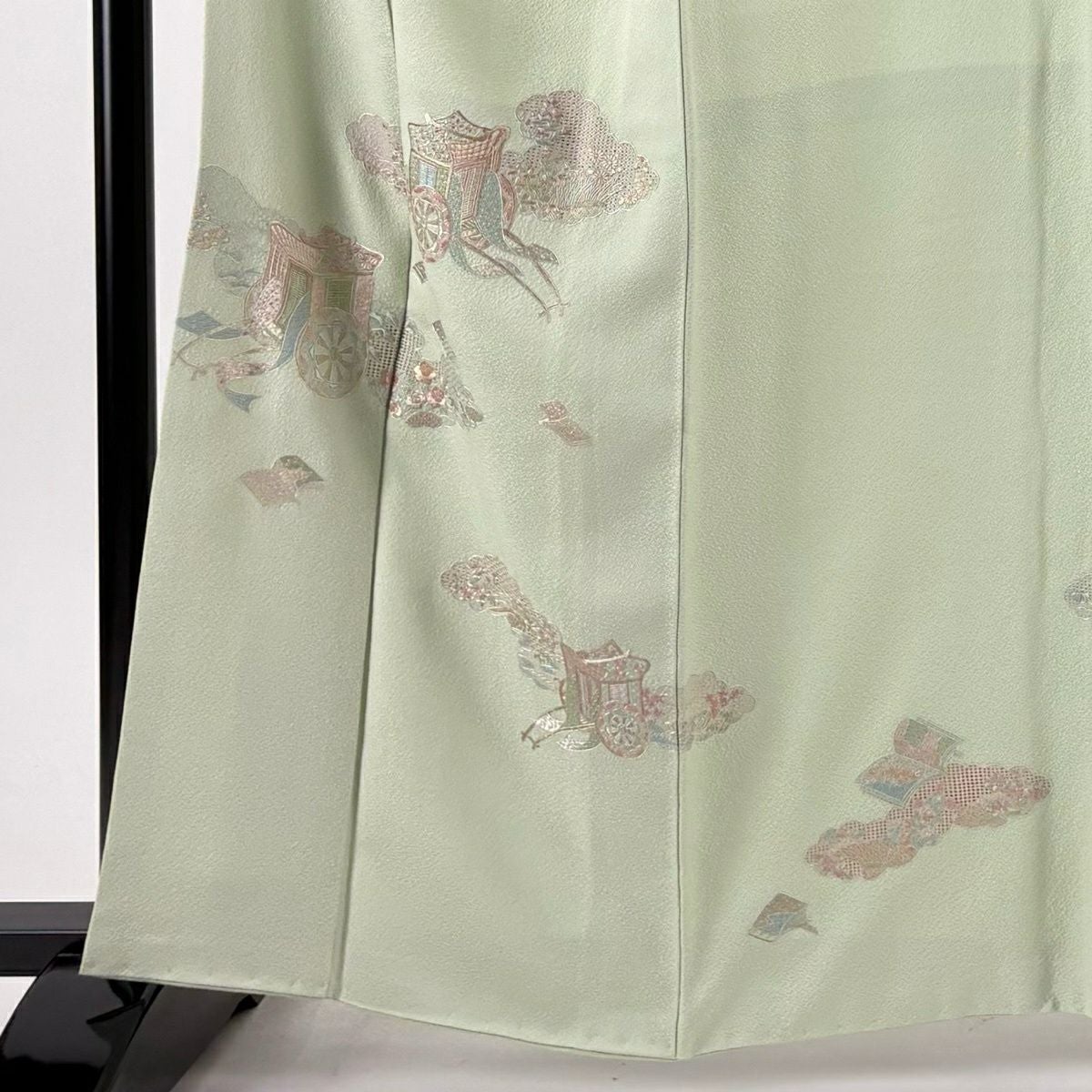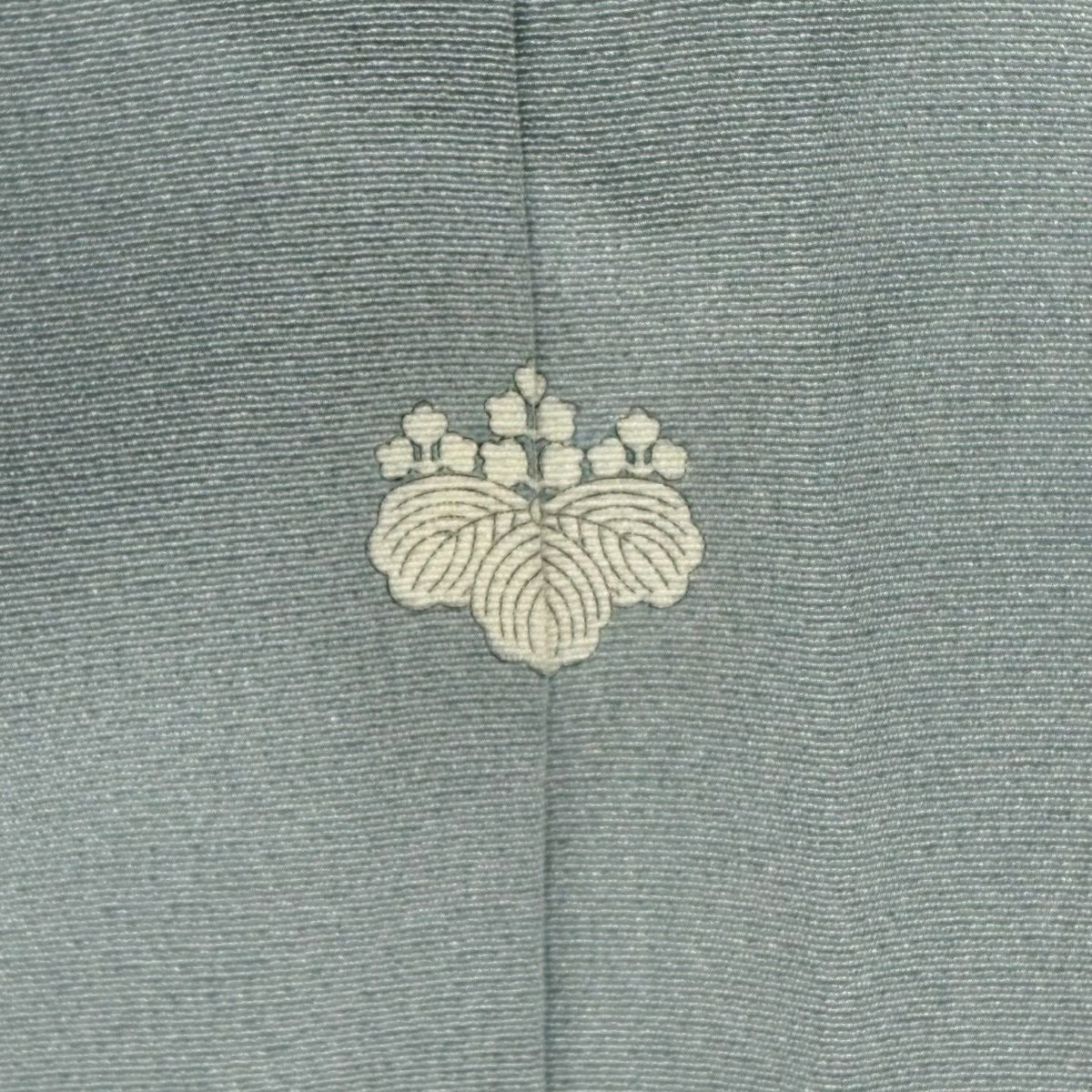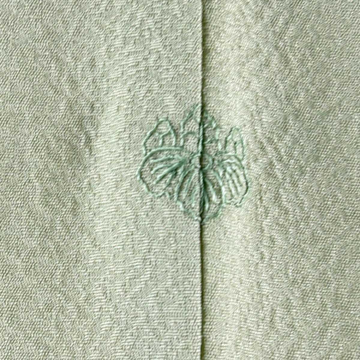 【美品】 付下げ 身丈159.5cm 裄丈62cm S 袷 松梅 菊 刺繍 金糸 灰緑 正絹 秀品 一つ紋