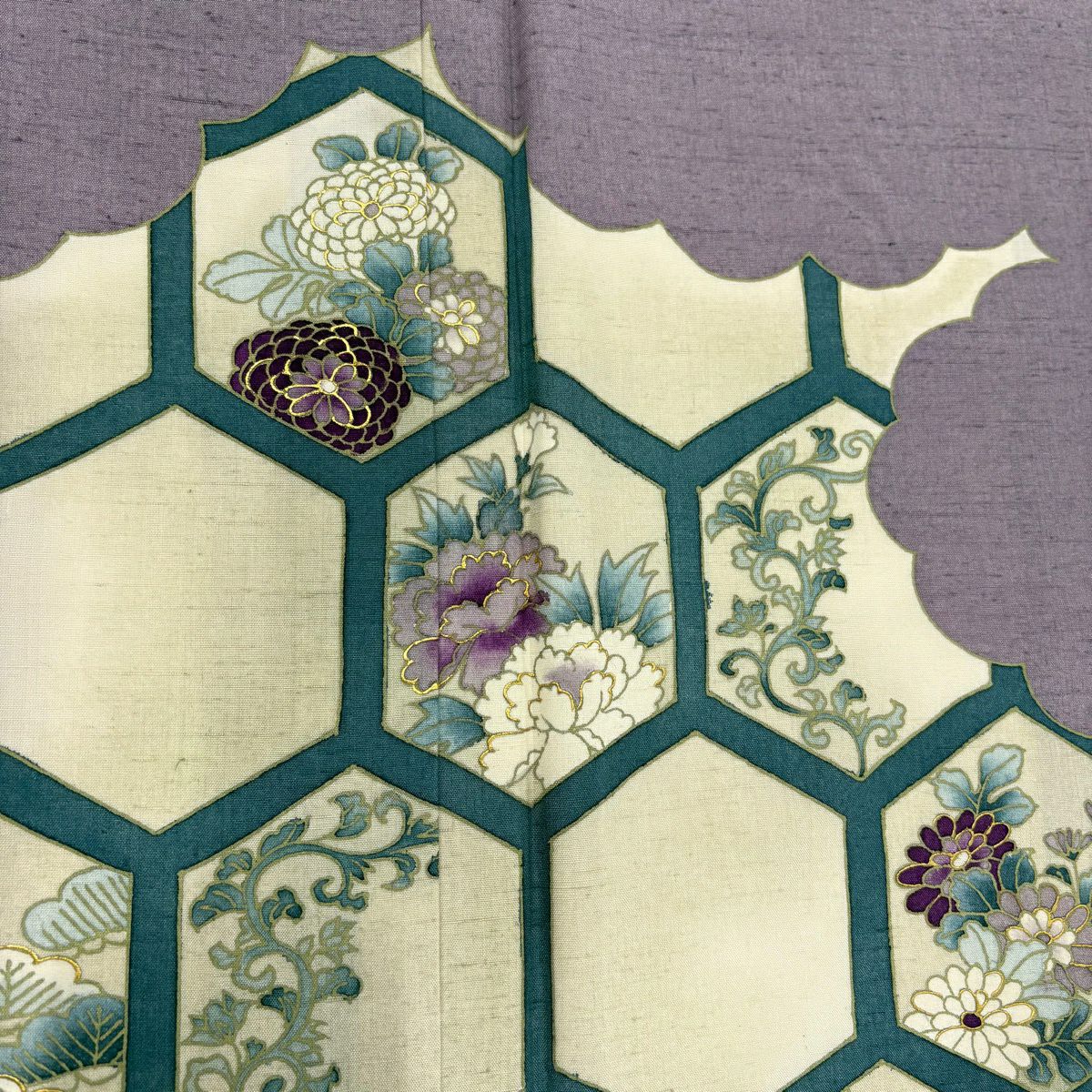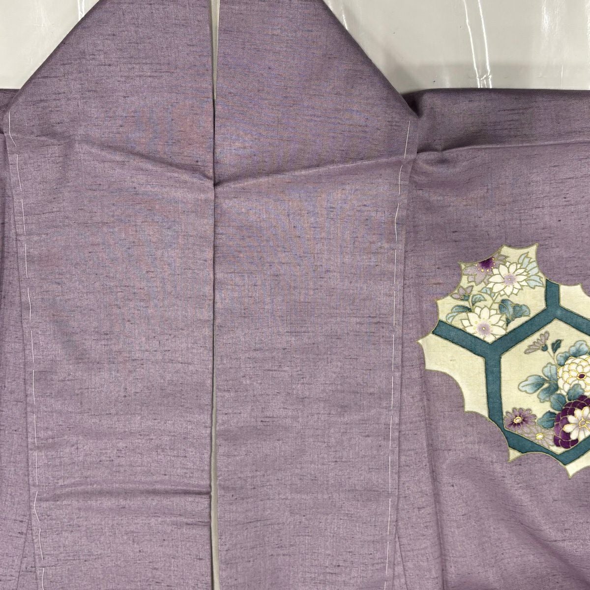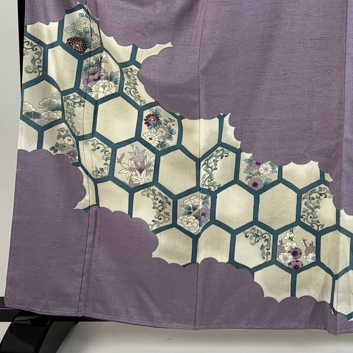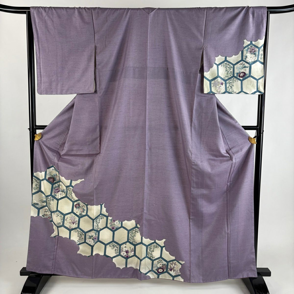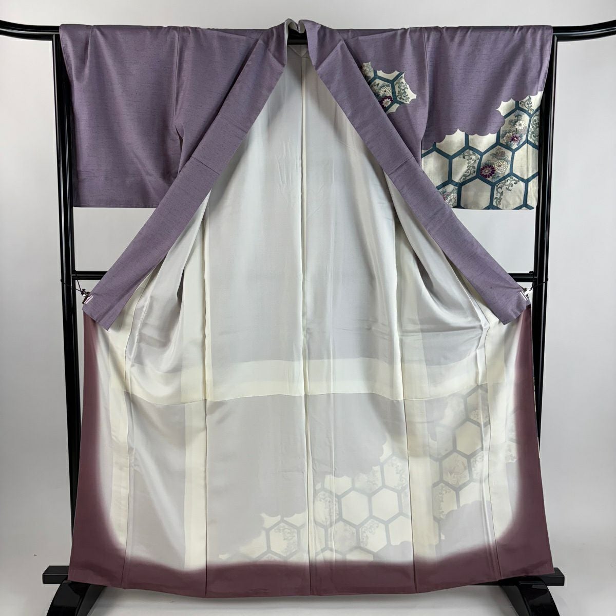 【美品】 付下げ 身丈163.5cm 裄丈66.5cm M 袷 紬地 亀甲 草花 金彩 ぼかし 紫 正絹 秀品