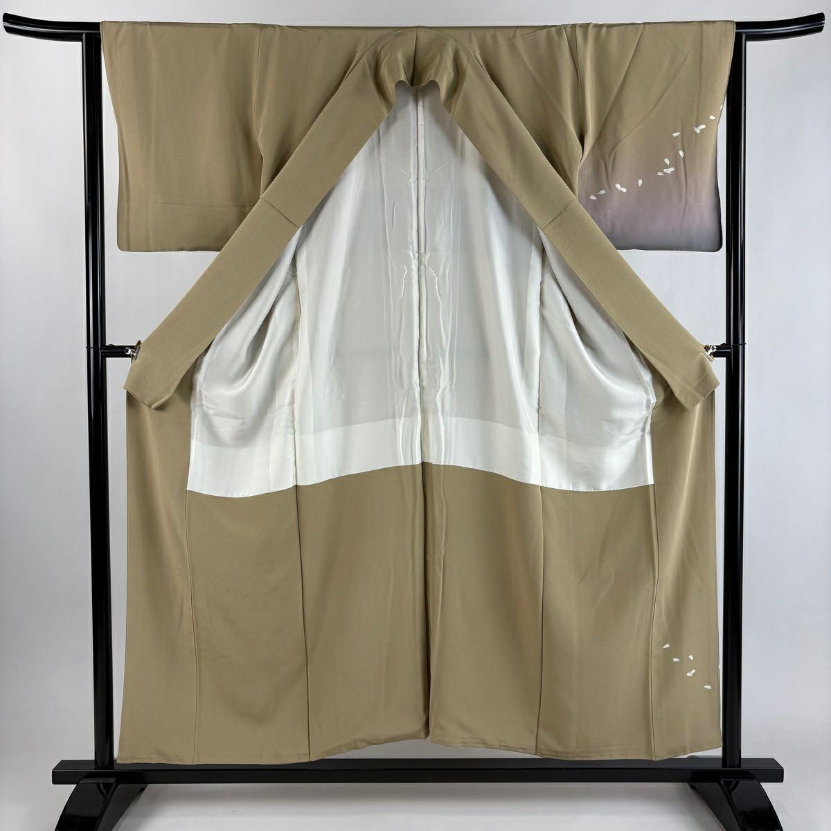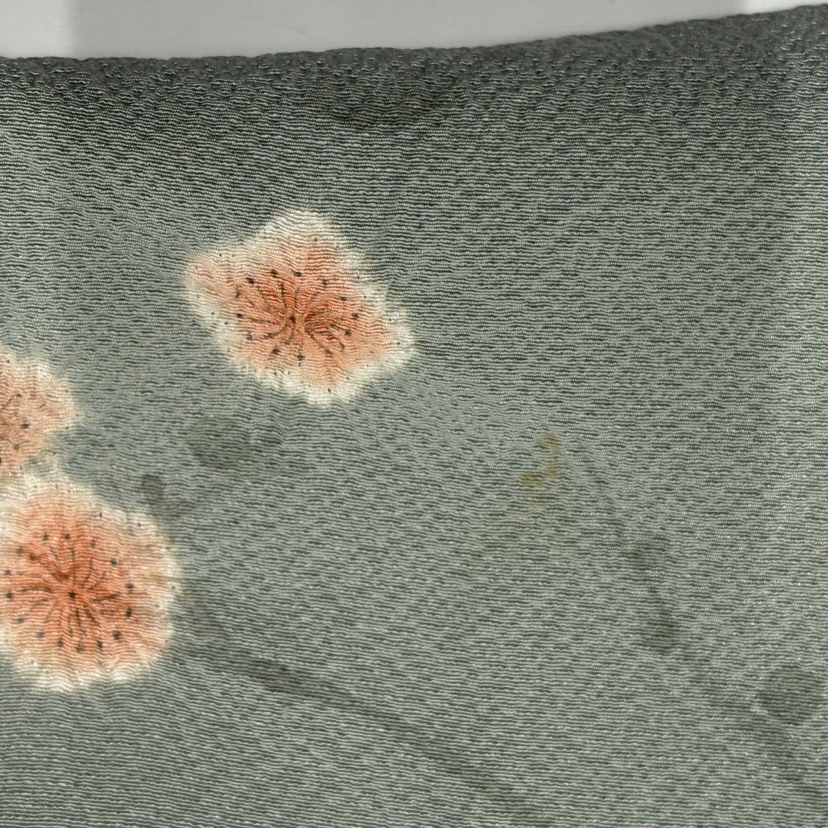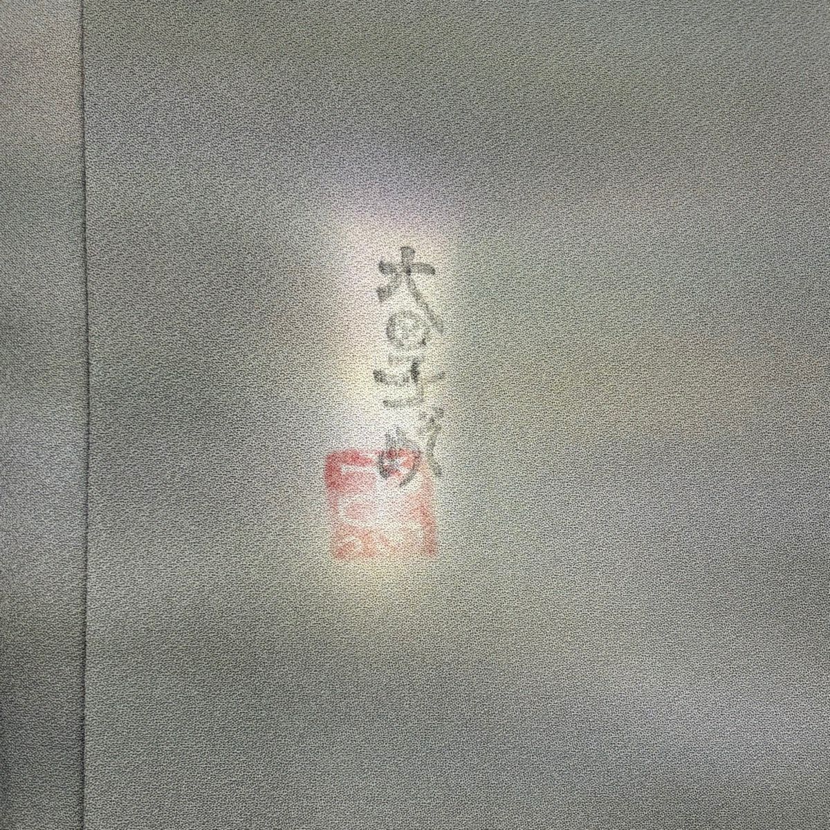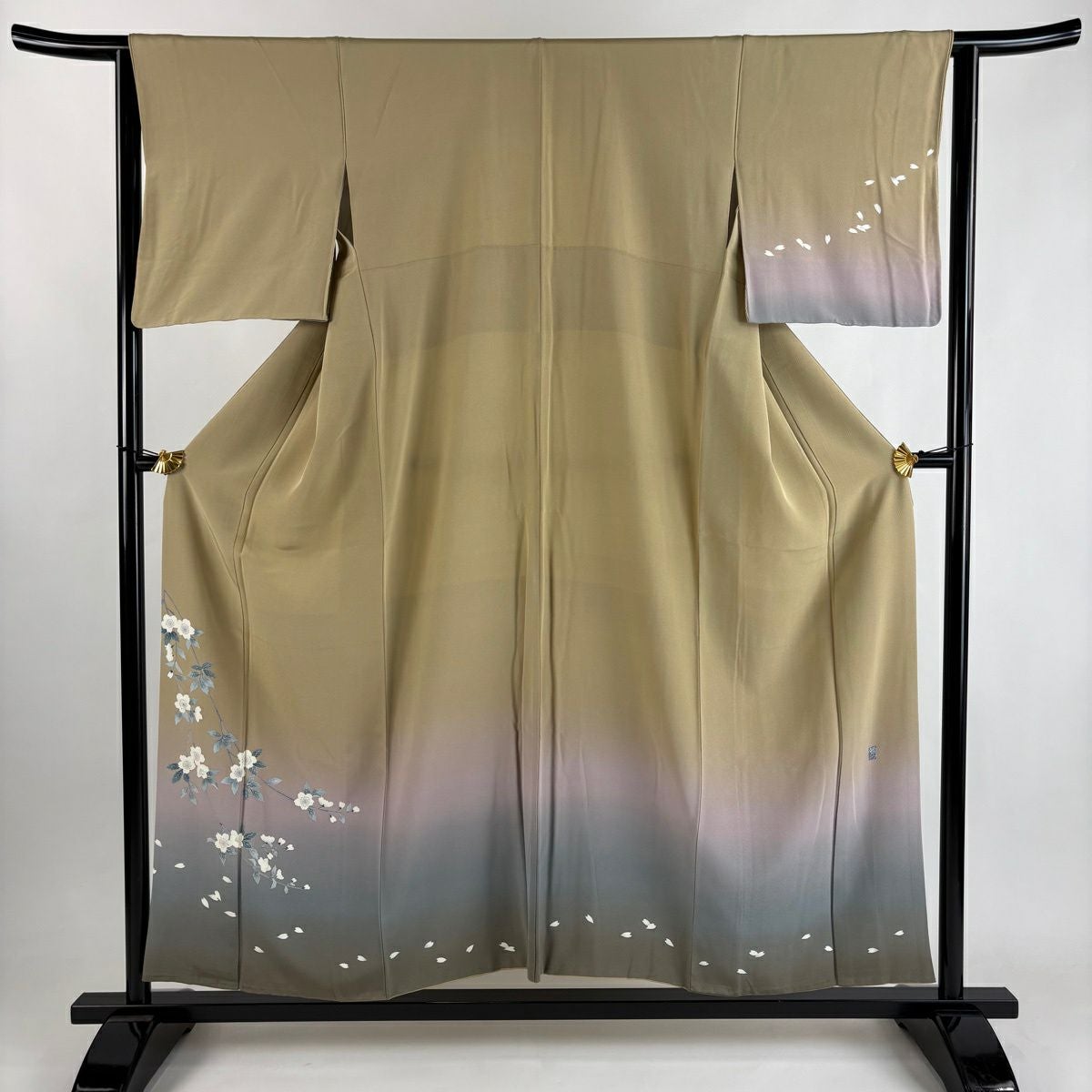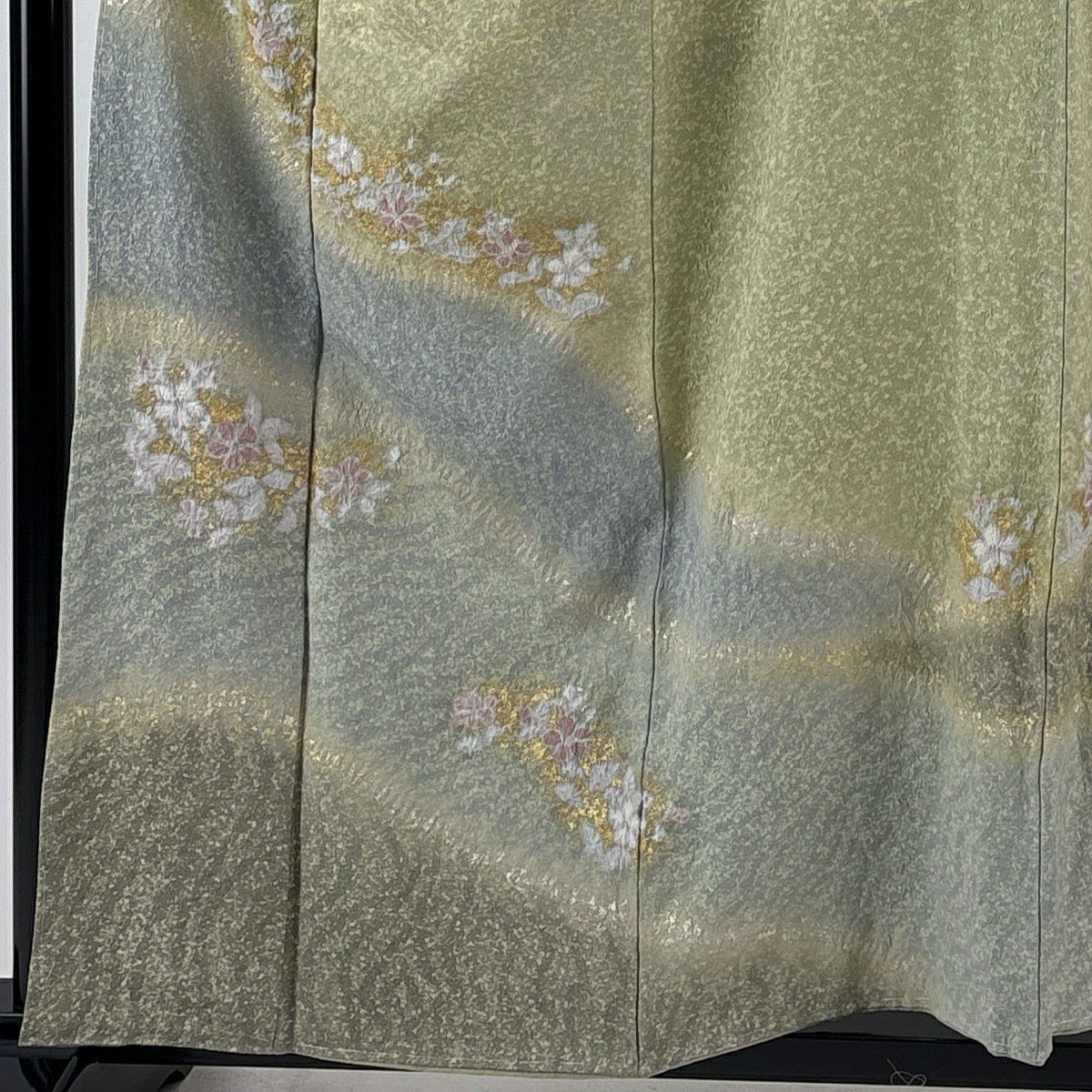付下げ 身丈153.5cm 裄丈64.5cm M 袷 落款あり 桜 花びら 染め分け ぼかし 灰緑 正絹 秀品