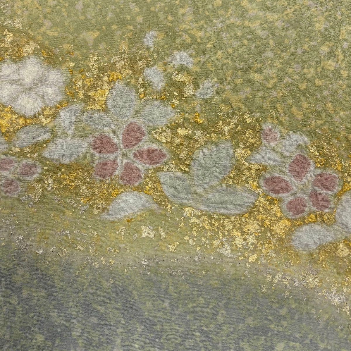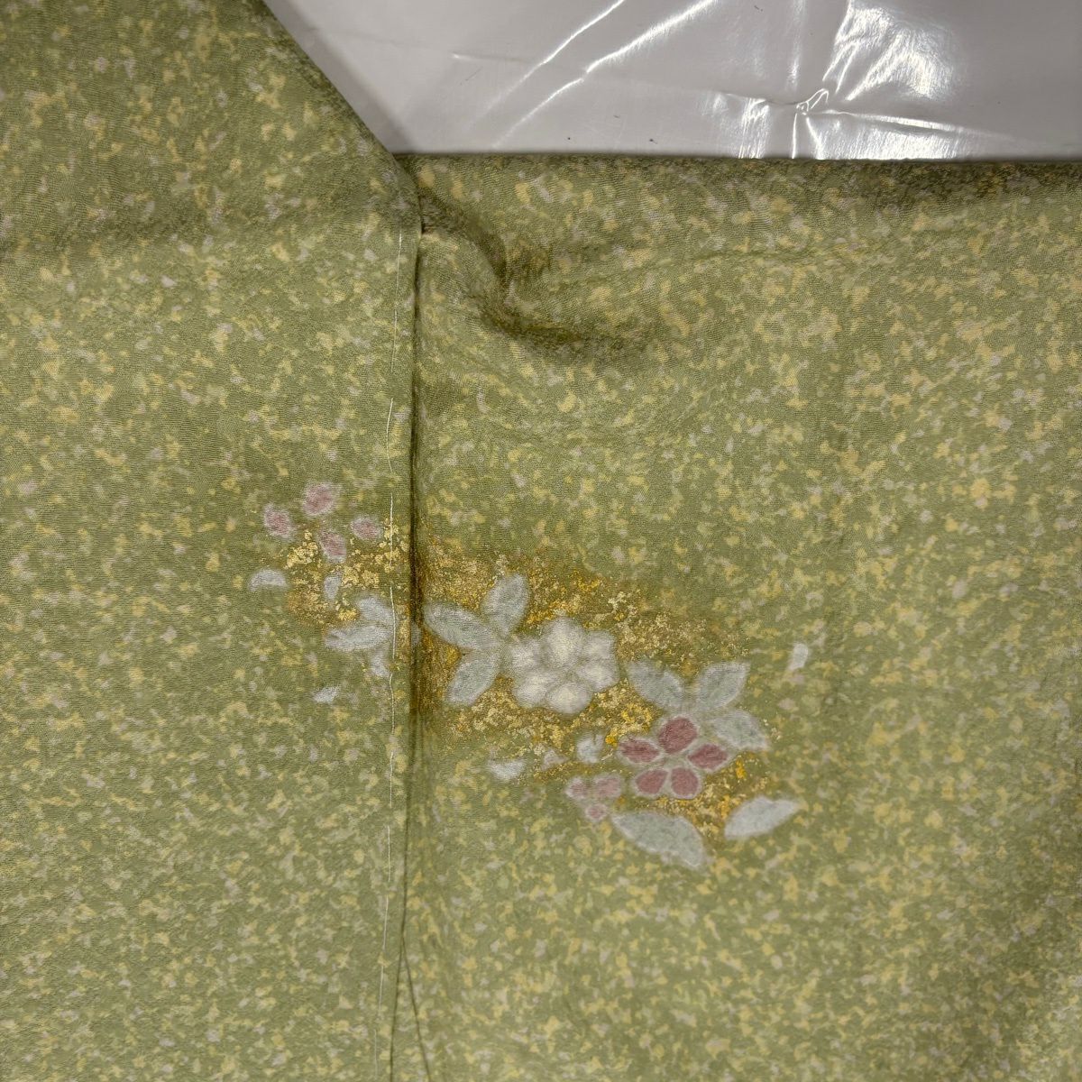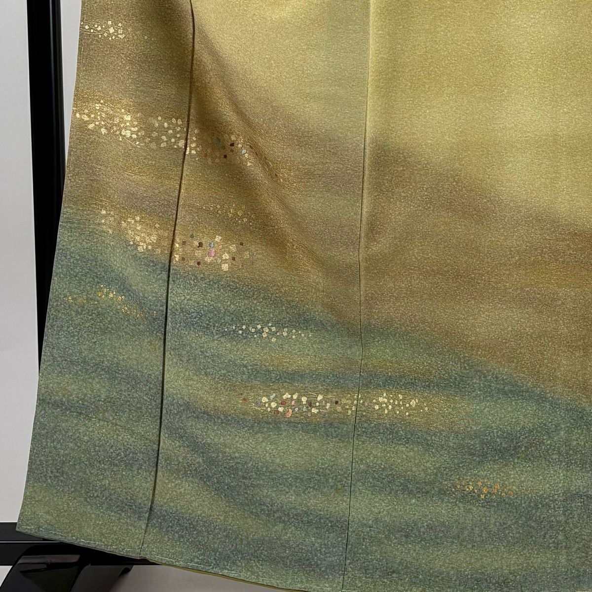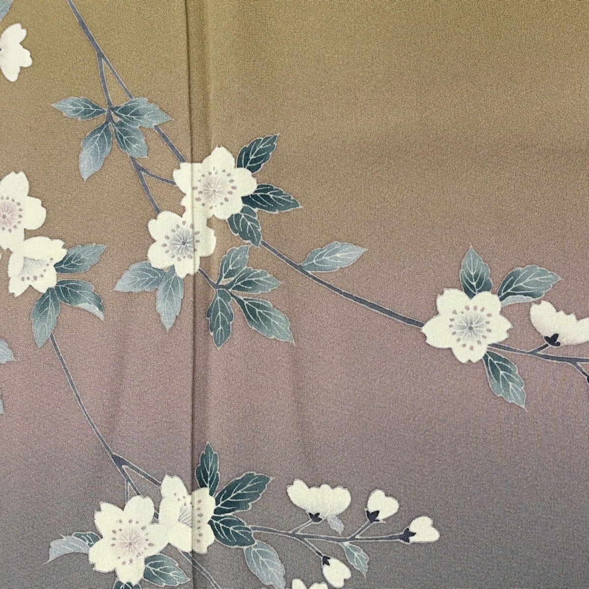 付下げ 身丈153.5cm 裄丈64.5cm M 袷 落款あり 桜 花びら 染め分け ぼかし 灰緑 正絹 秀品
