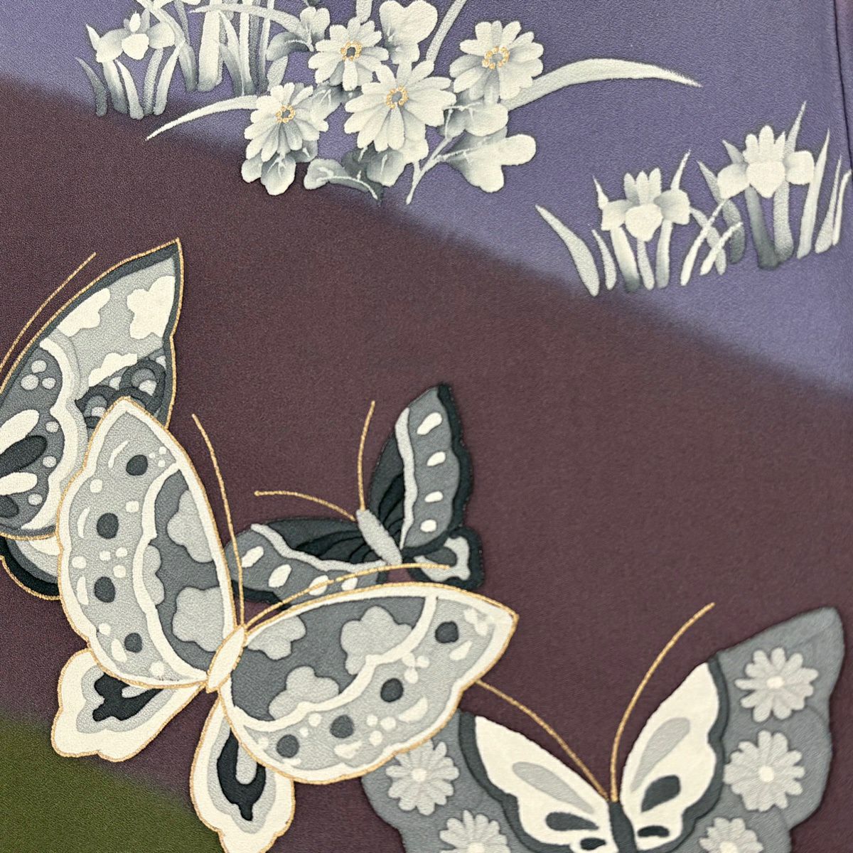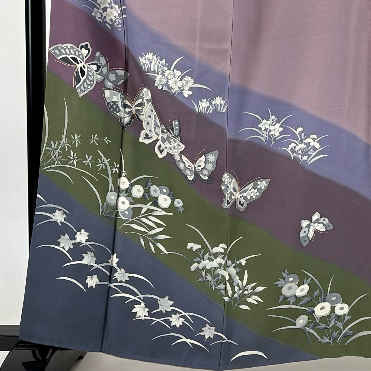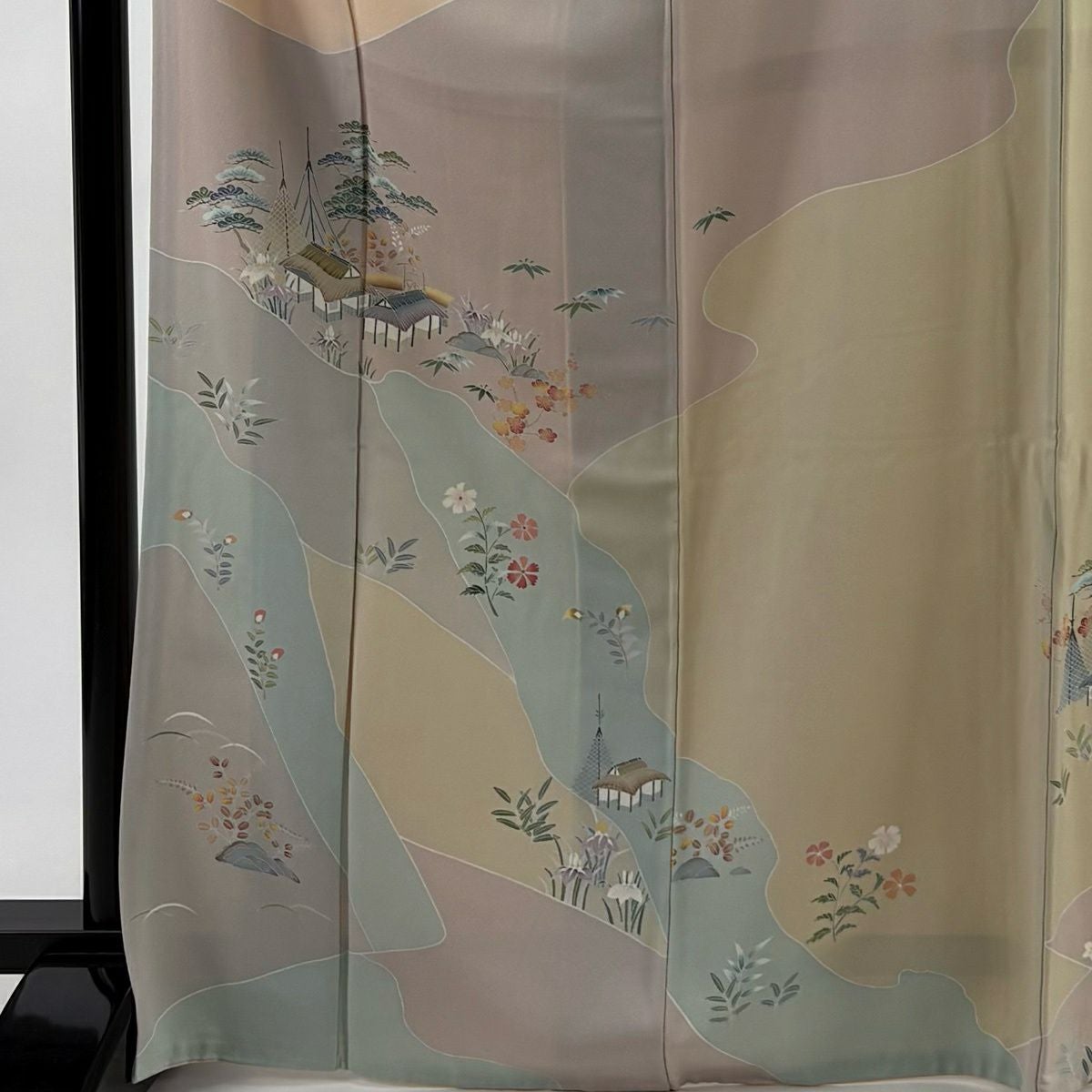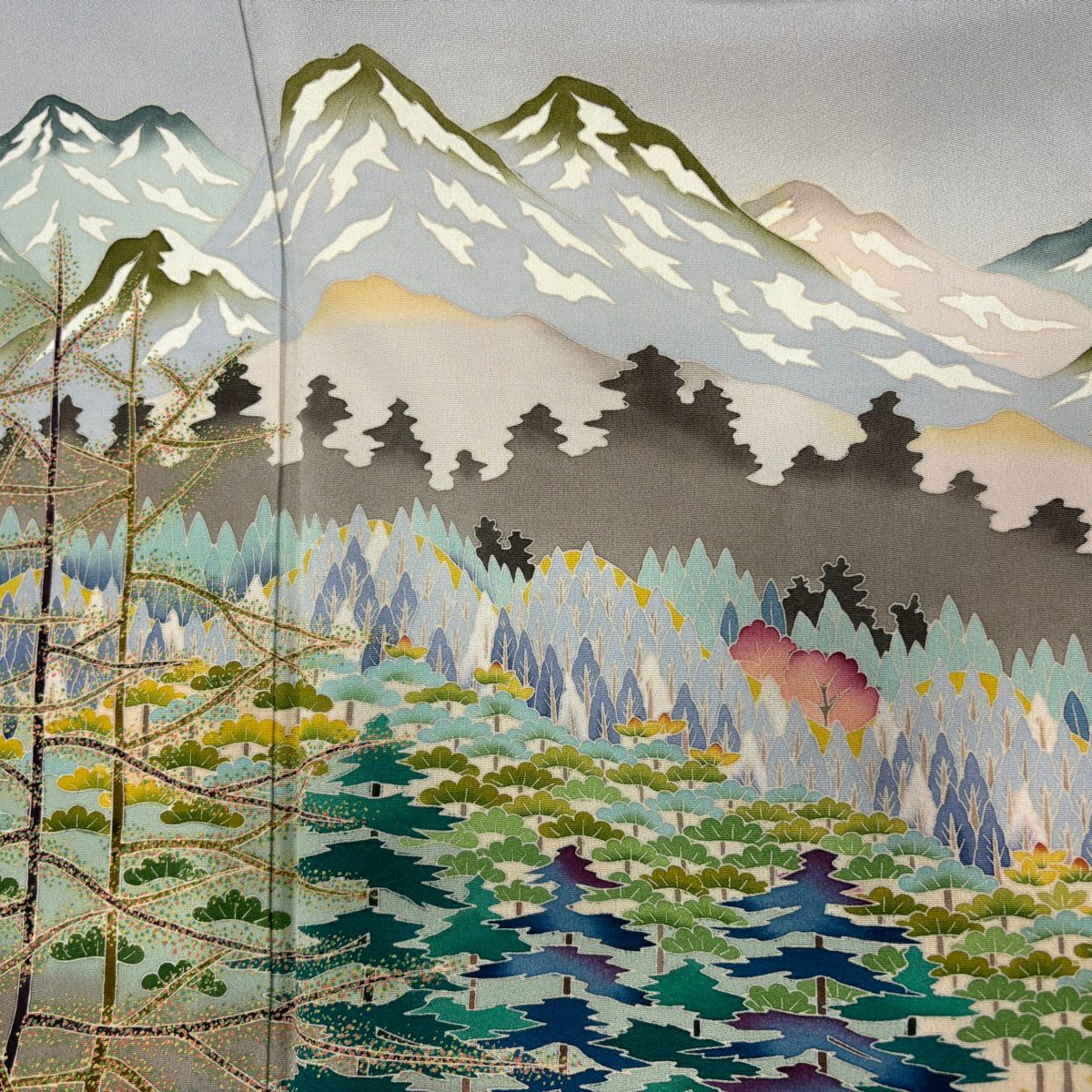 色留袖 身丈158.5cm 裄丈62.5cm S 袷 落款あり 風景 山並み ぼかし 灰紫 正絹 秀品 三つ紋