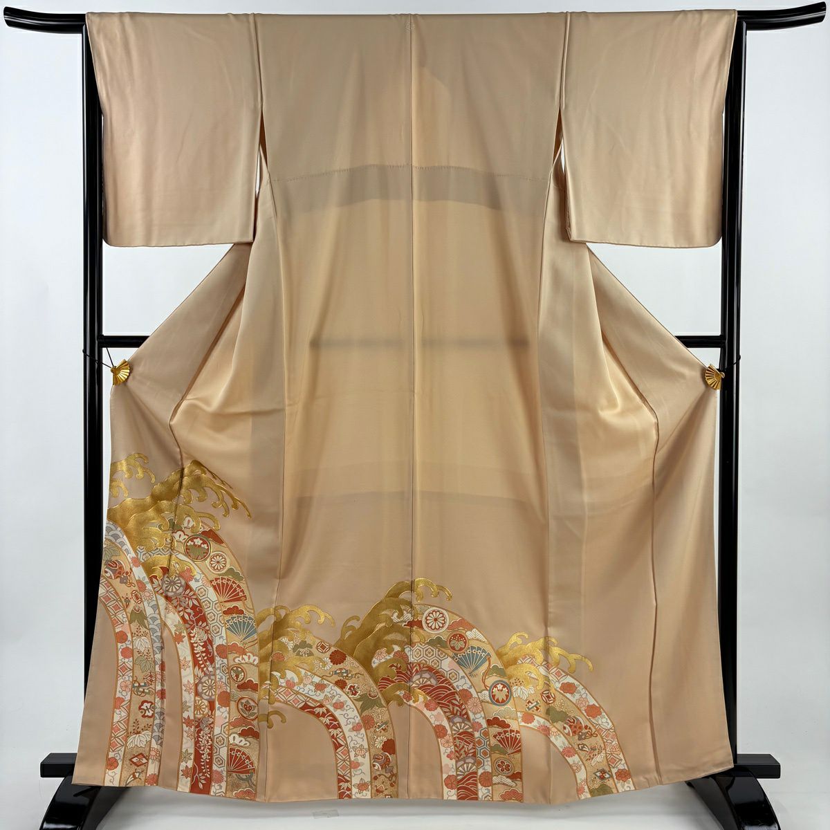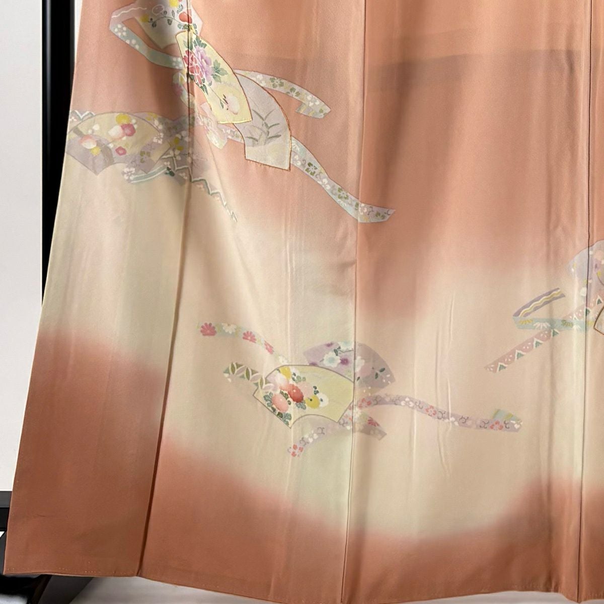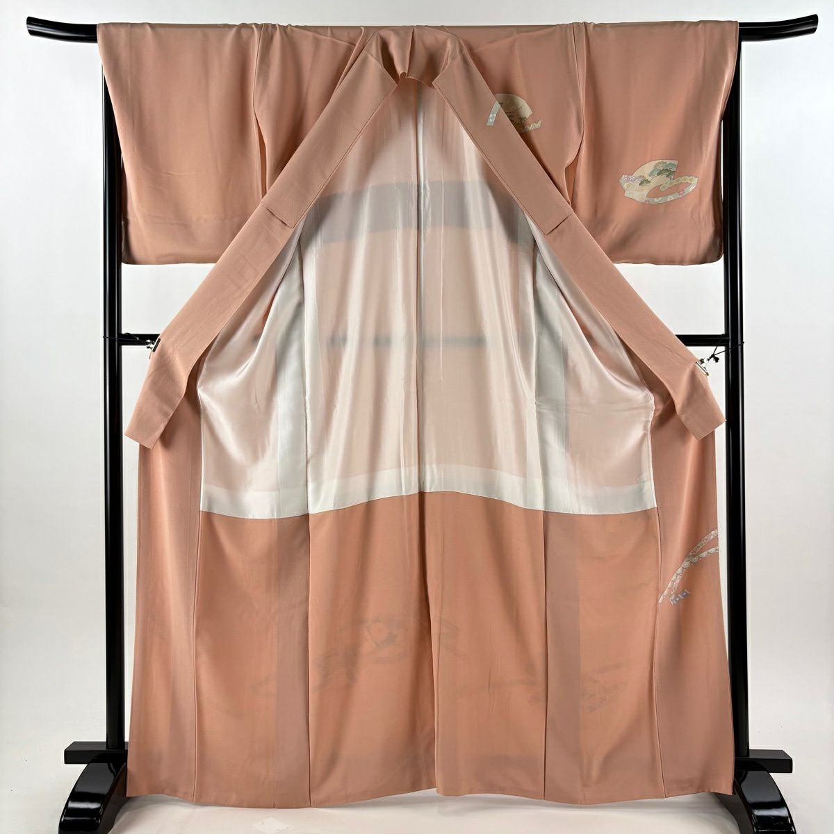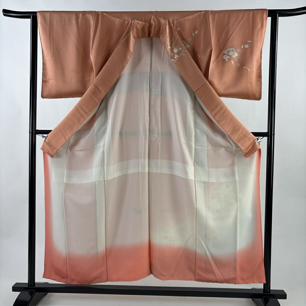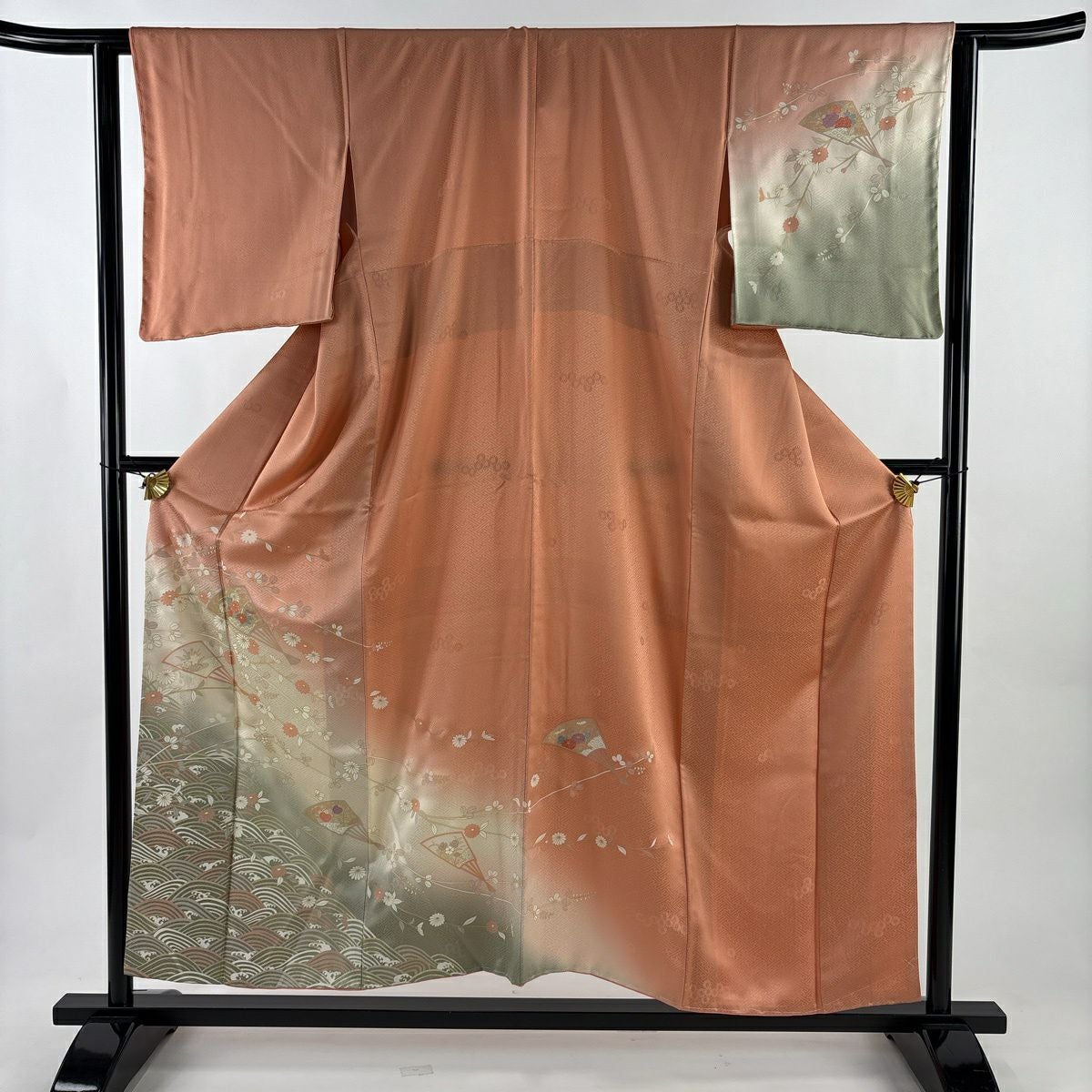 訪問着 身丈155cm 裄丈62.5cm S 袷 鈴乃屋 扇 波 金彩 ぼかし サーモンピンク 正絹 秀品