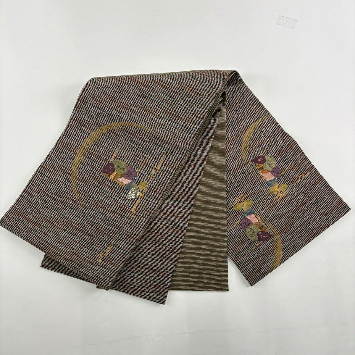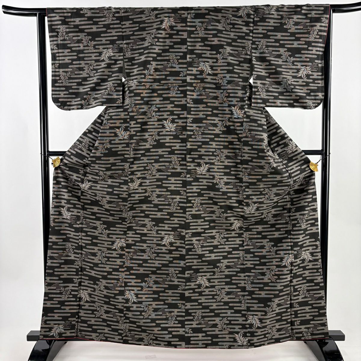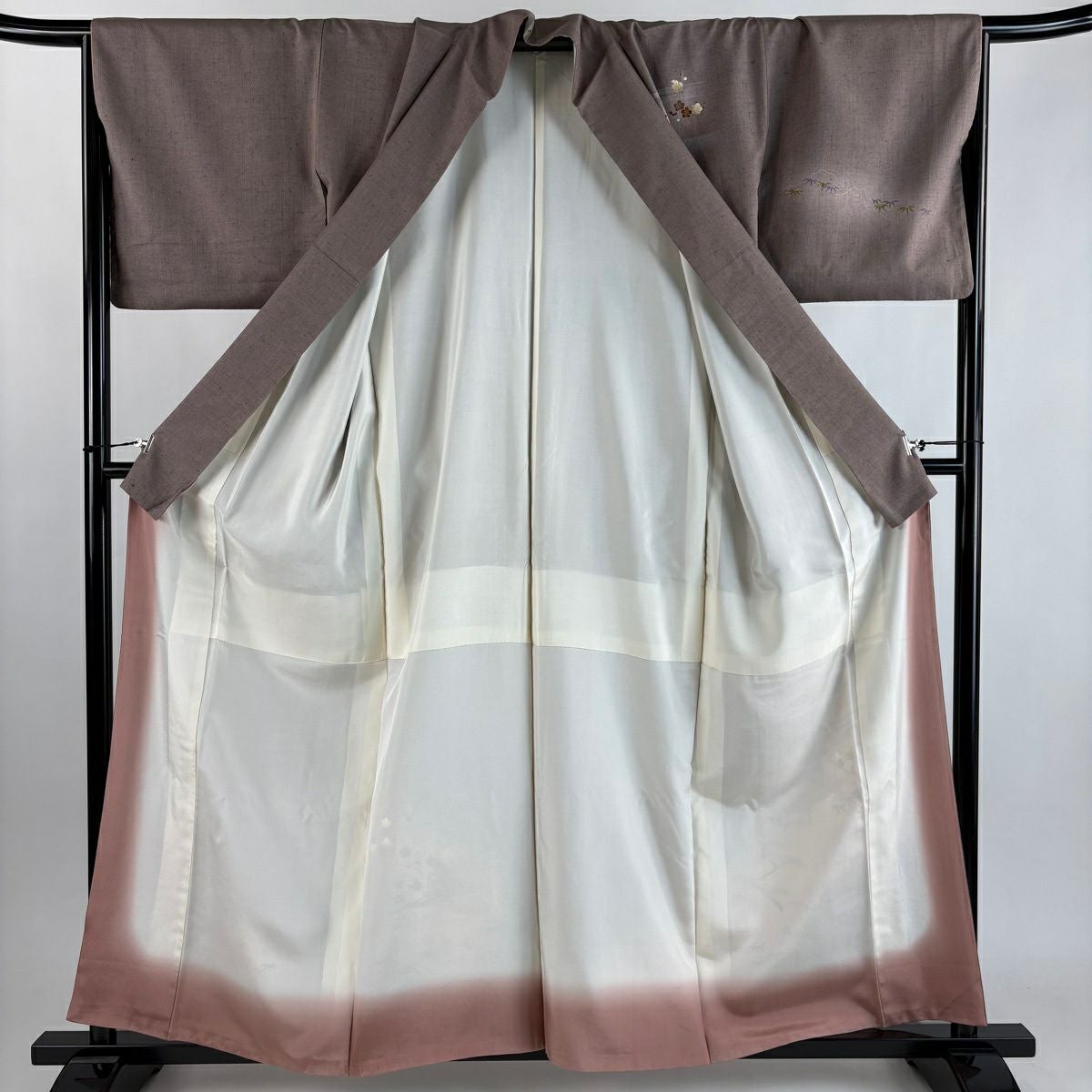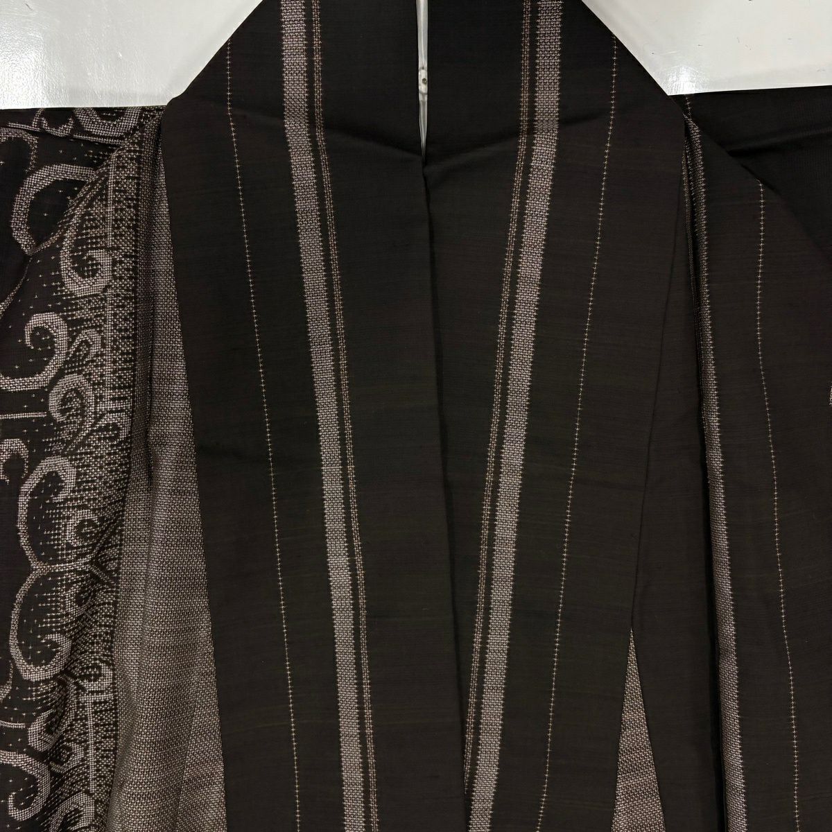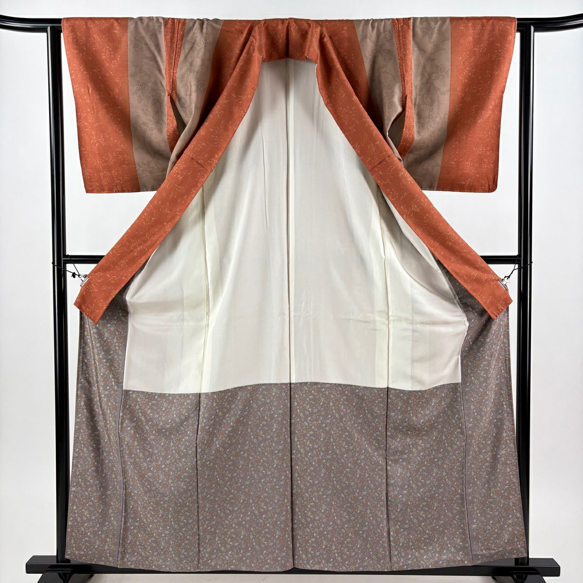 【美品】 付下げ 身丈156cm 裄丈65.5cm M 袷 華文 縦縞模様 金糸 刺繍 焦茶色 正絹 秀品