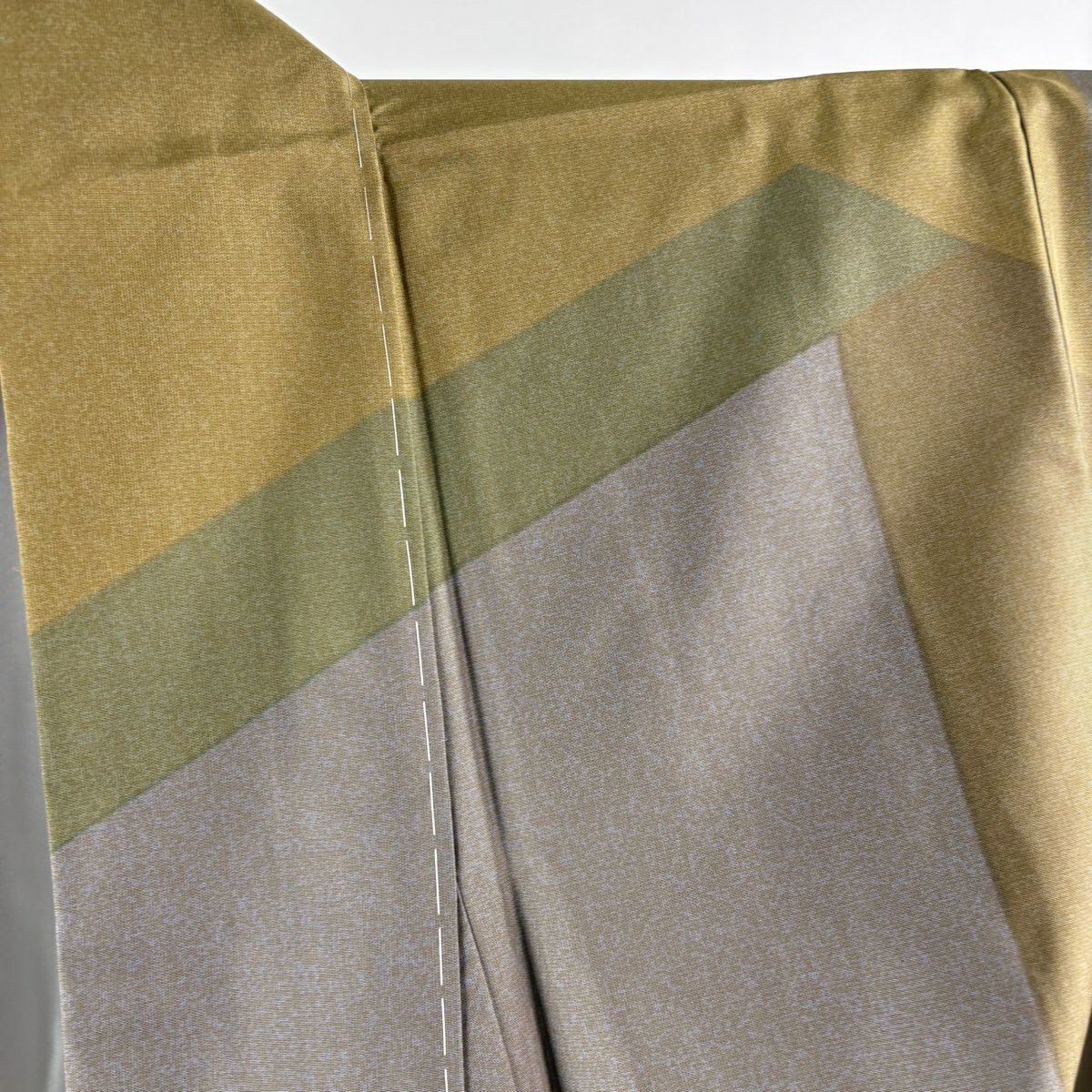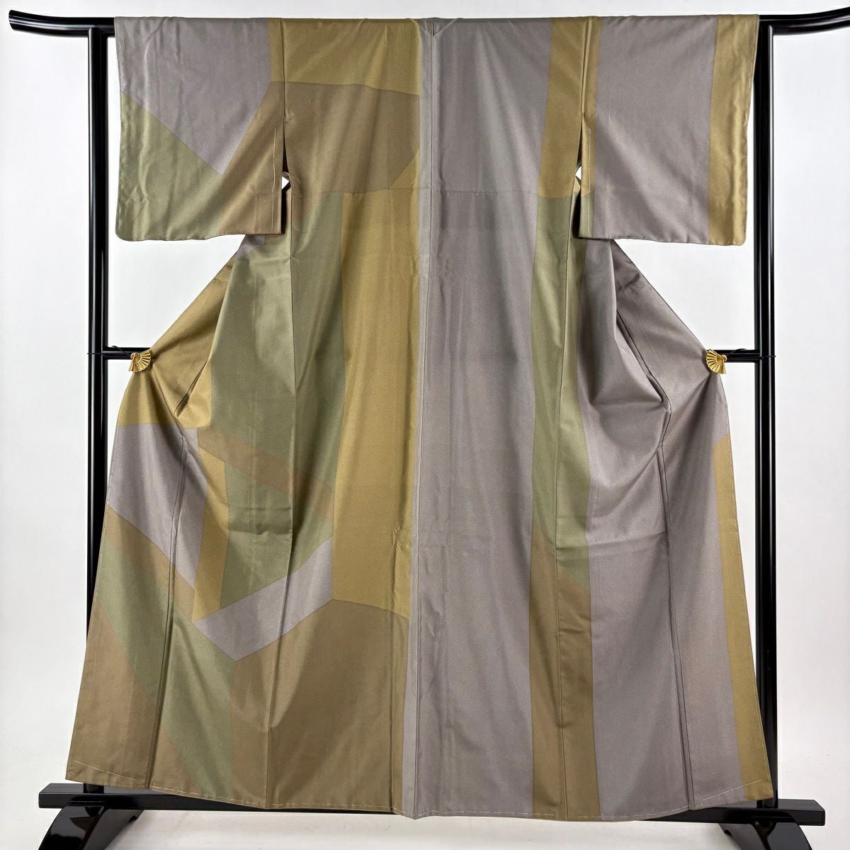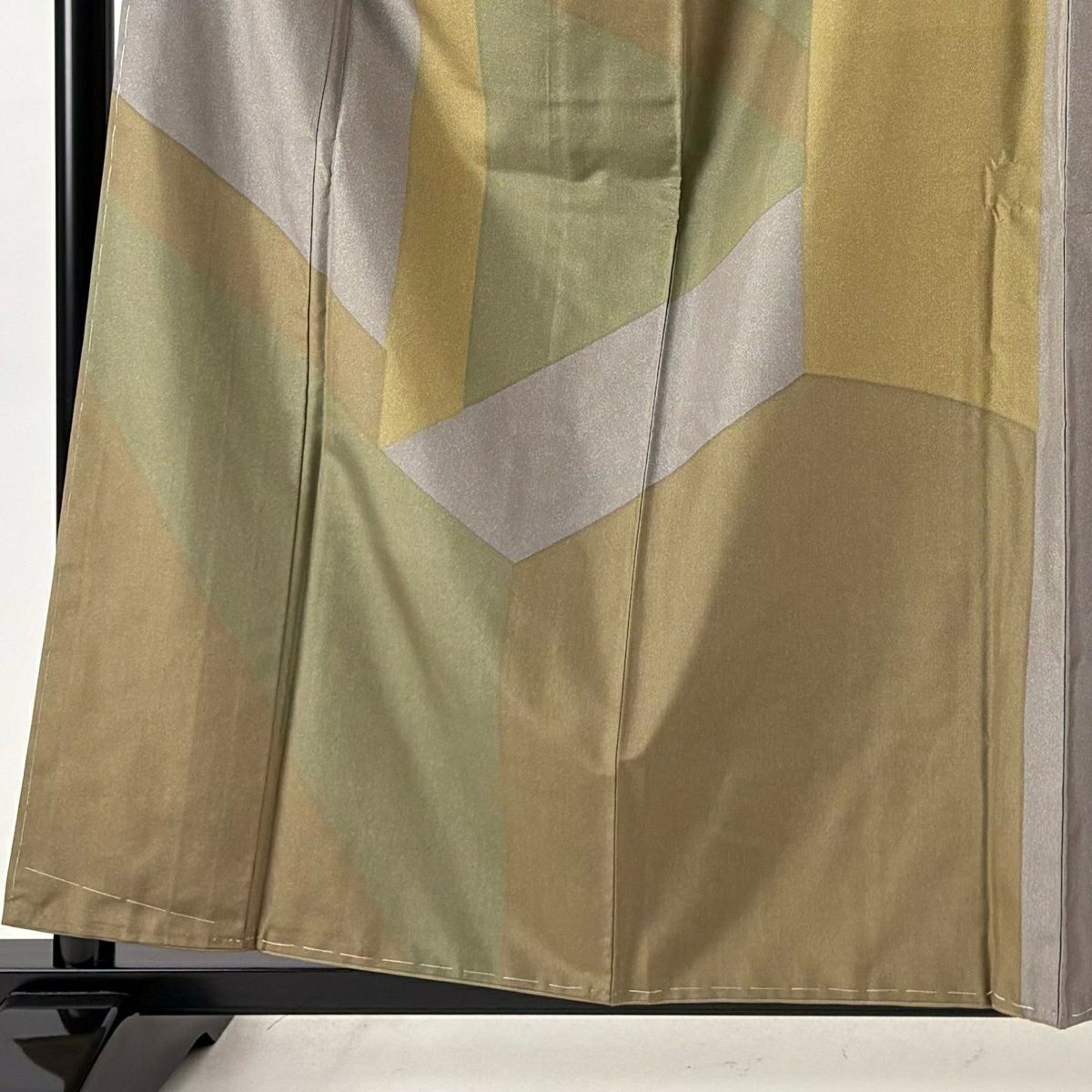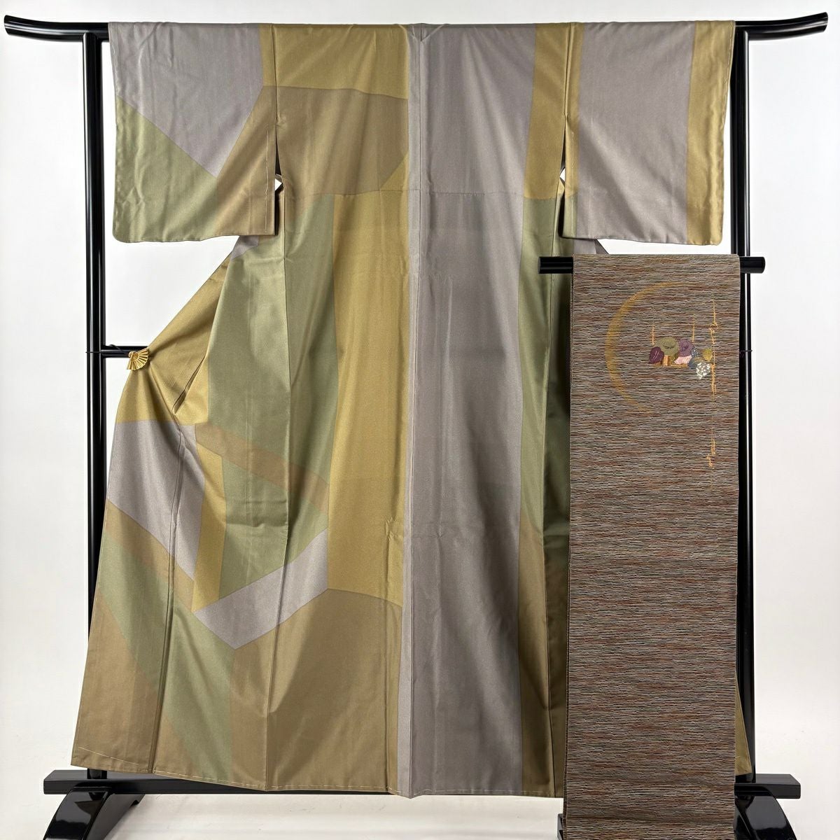 【美品】 付下げ 身丈160cm 裄丈63.5cm S 袷 袋帯セット 紬地 幾何学模様 灰緑 正絹 秀品
