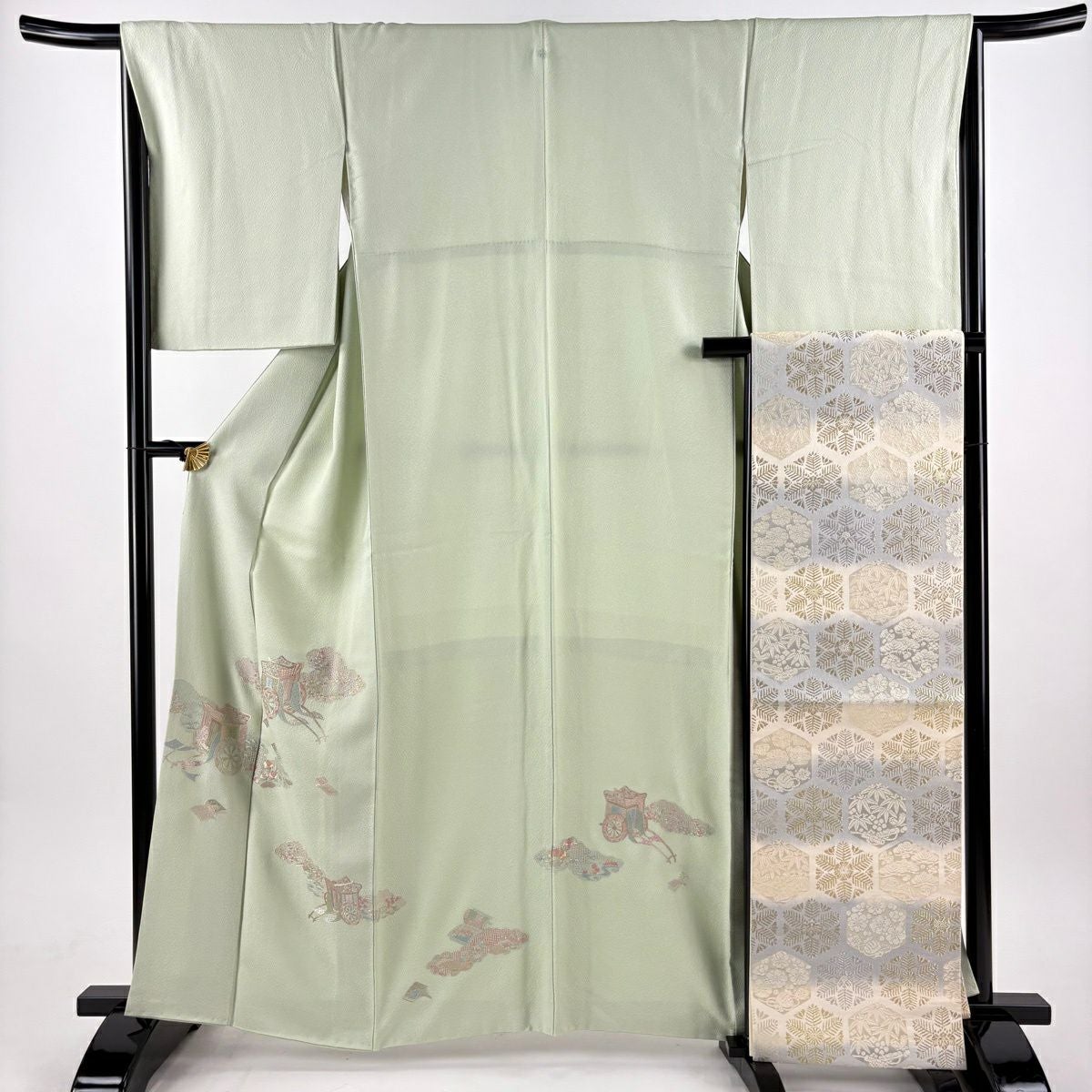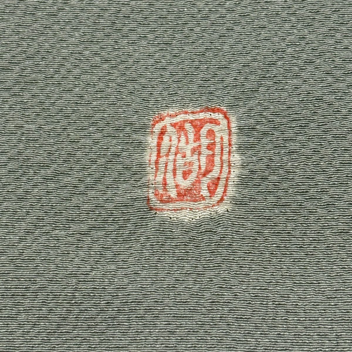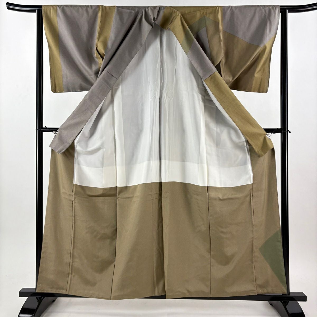 【美品】 付下げ 身丈160cm 裄丈63.5cm S 袷 袋帯セット 紬地 幾何学模様 灰緑 正絹 秀品