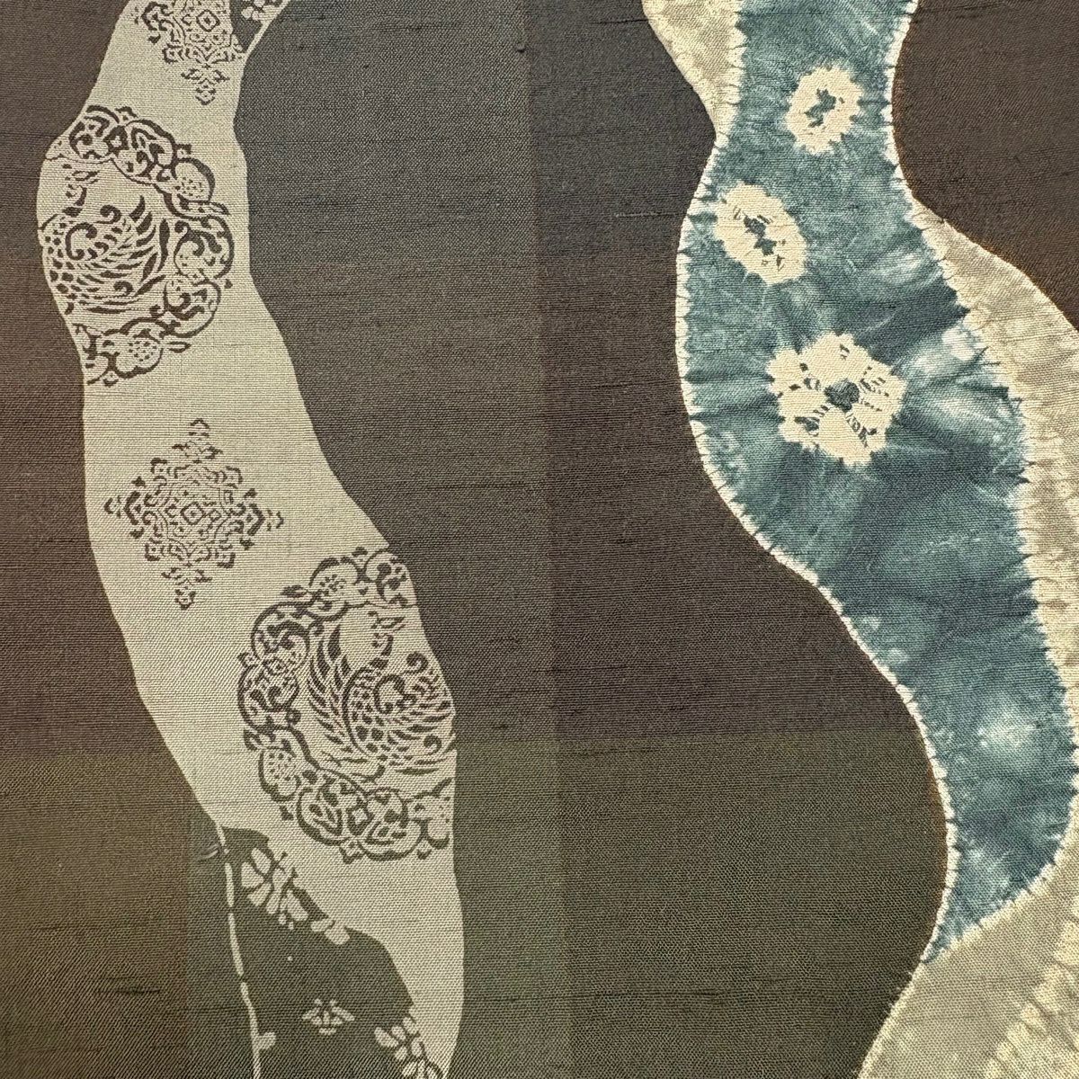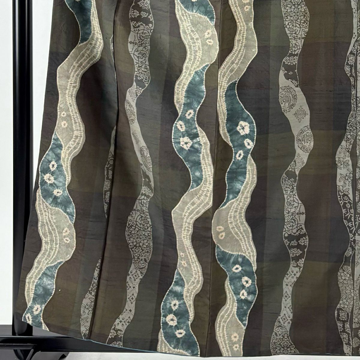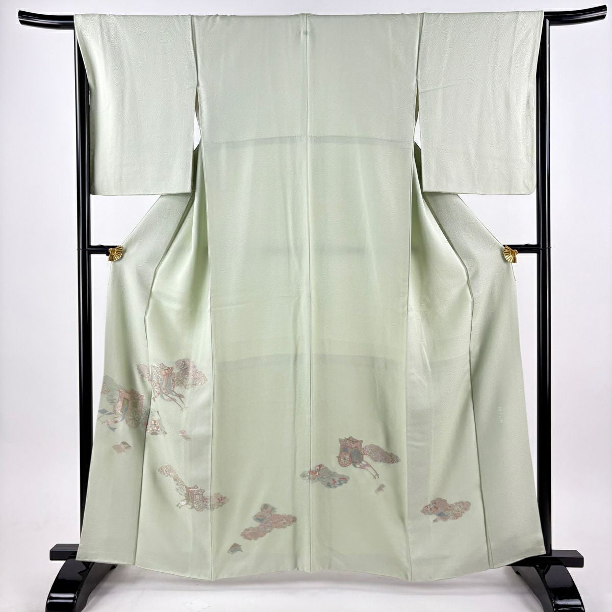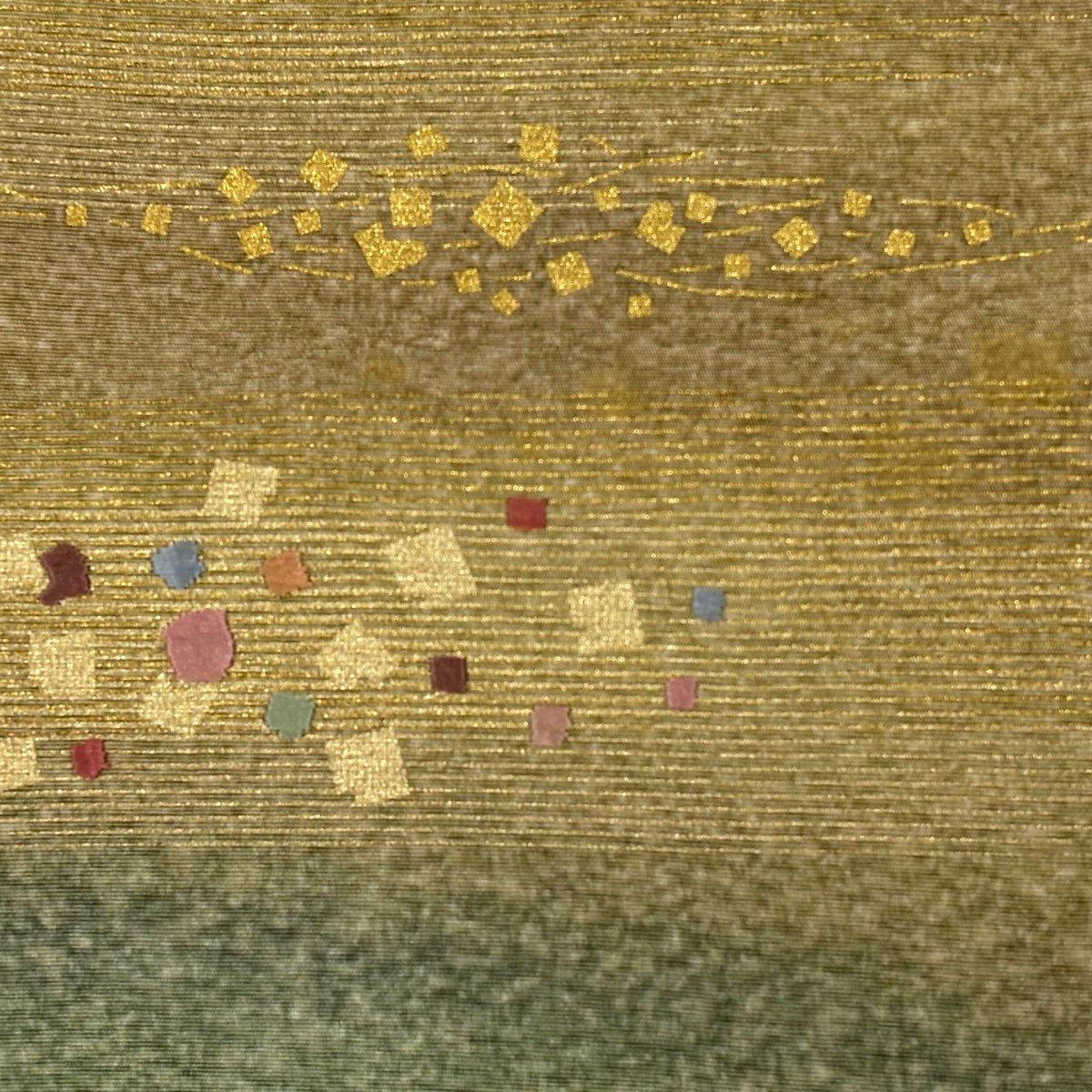 【美品】 付下げ 身丈160cm 裄丈63.5cm S 袷 袋帯セット 紬地 幾何学模様 灰緑 正絹 秀品