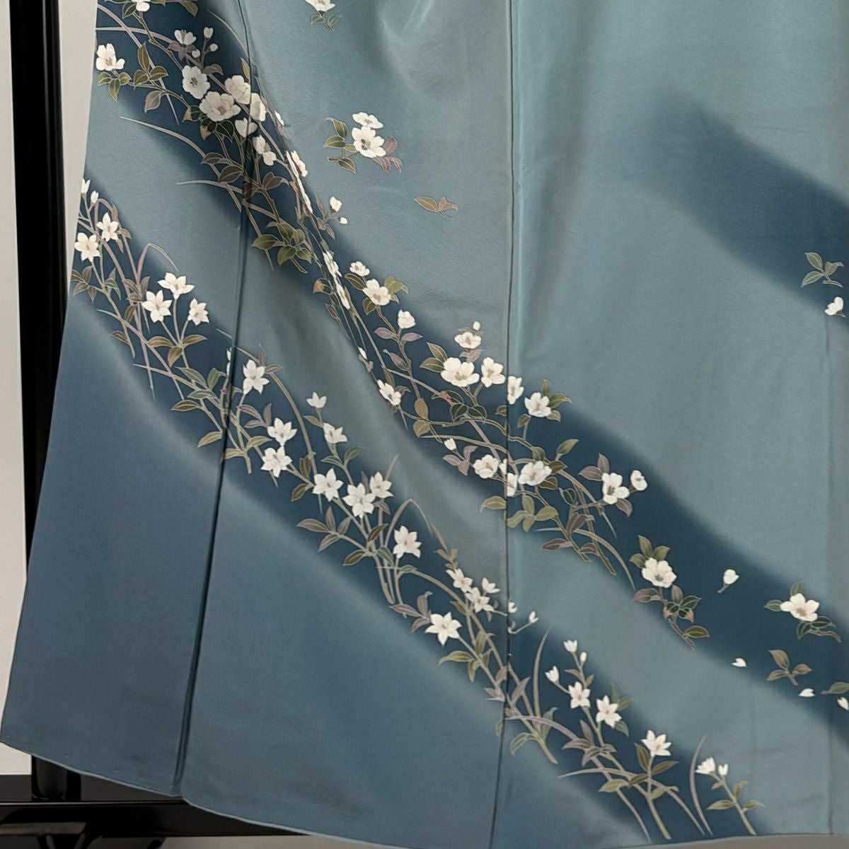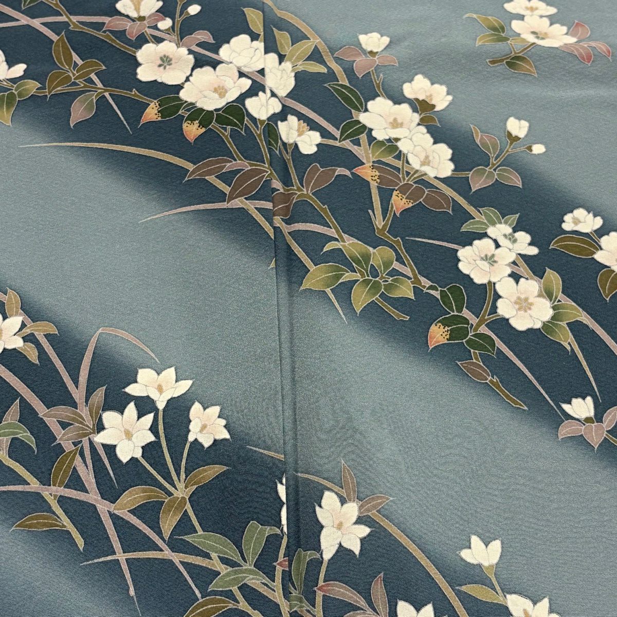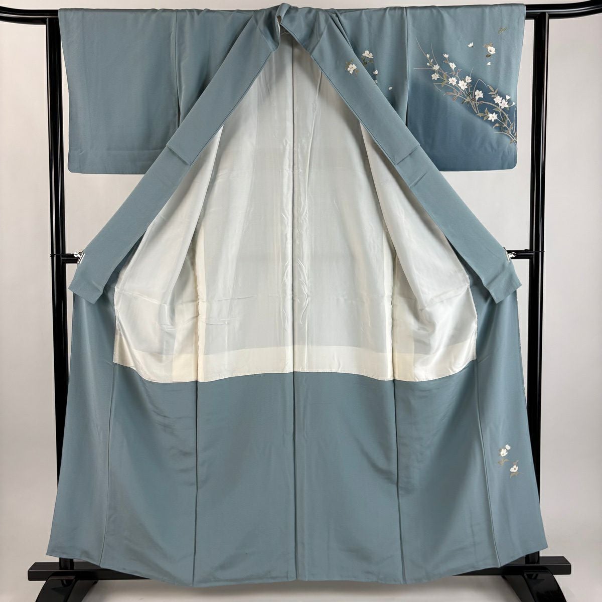 訪問着 身丈168cm 裄丈67cm M 袷 落款あり 枝花 シルエット 金彩 ぼかし 青灰色 正絹 秀品