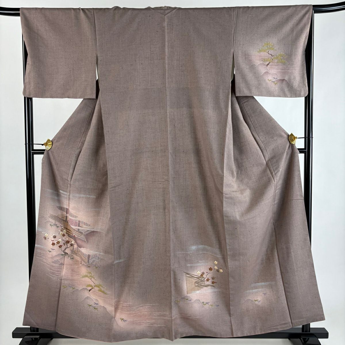 【美品】 付下げ 身丈159cm 裄丈66cm M 袷 紬地 建物 松竹梅 金彩 薄紫 正絹 秀品 一つ紋