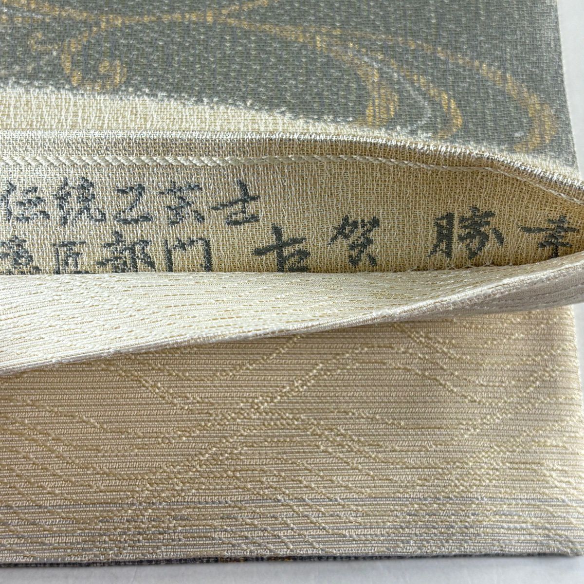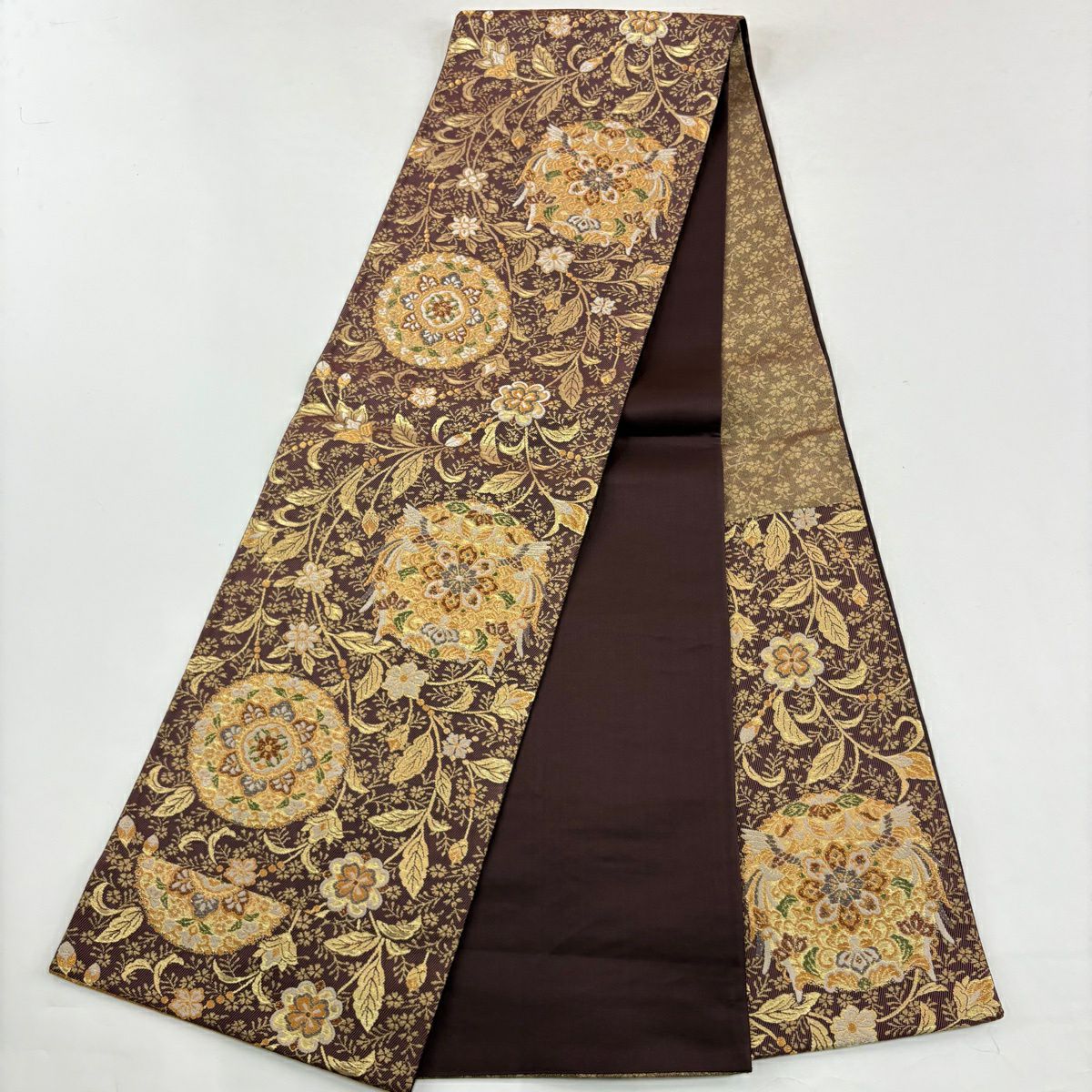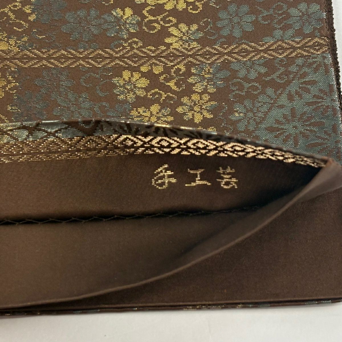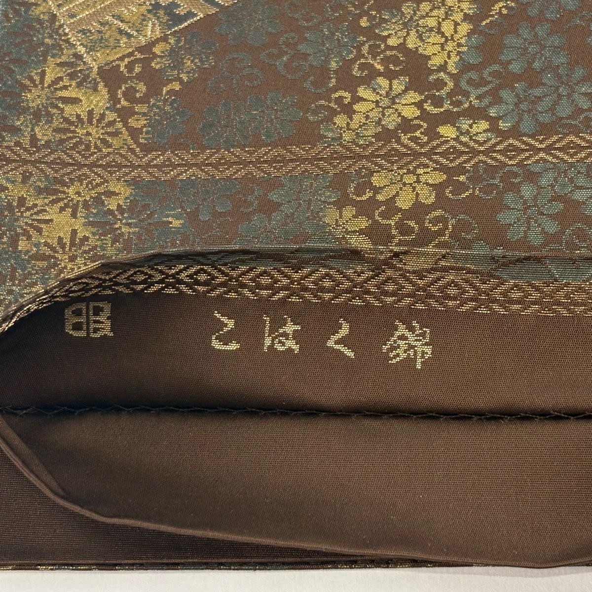 【美品】 袋帯 秀品 服部織物 落款あり こはく錦 手工芸 蜀江文 花唐草 金糸 箔 焦茶色 六通 正絹