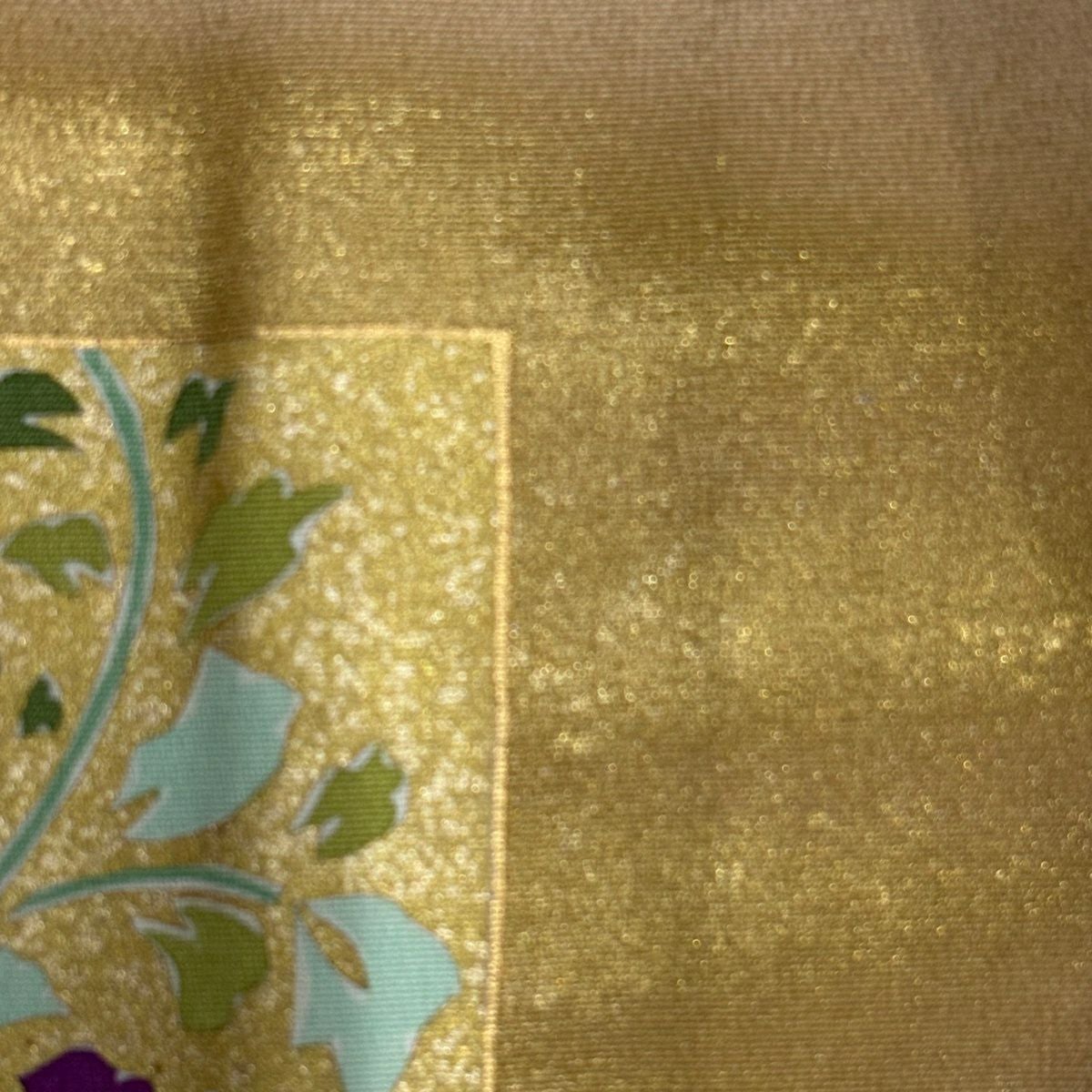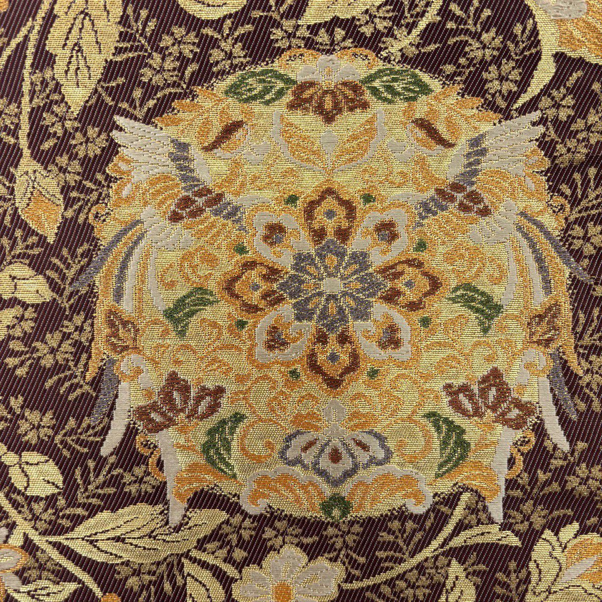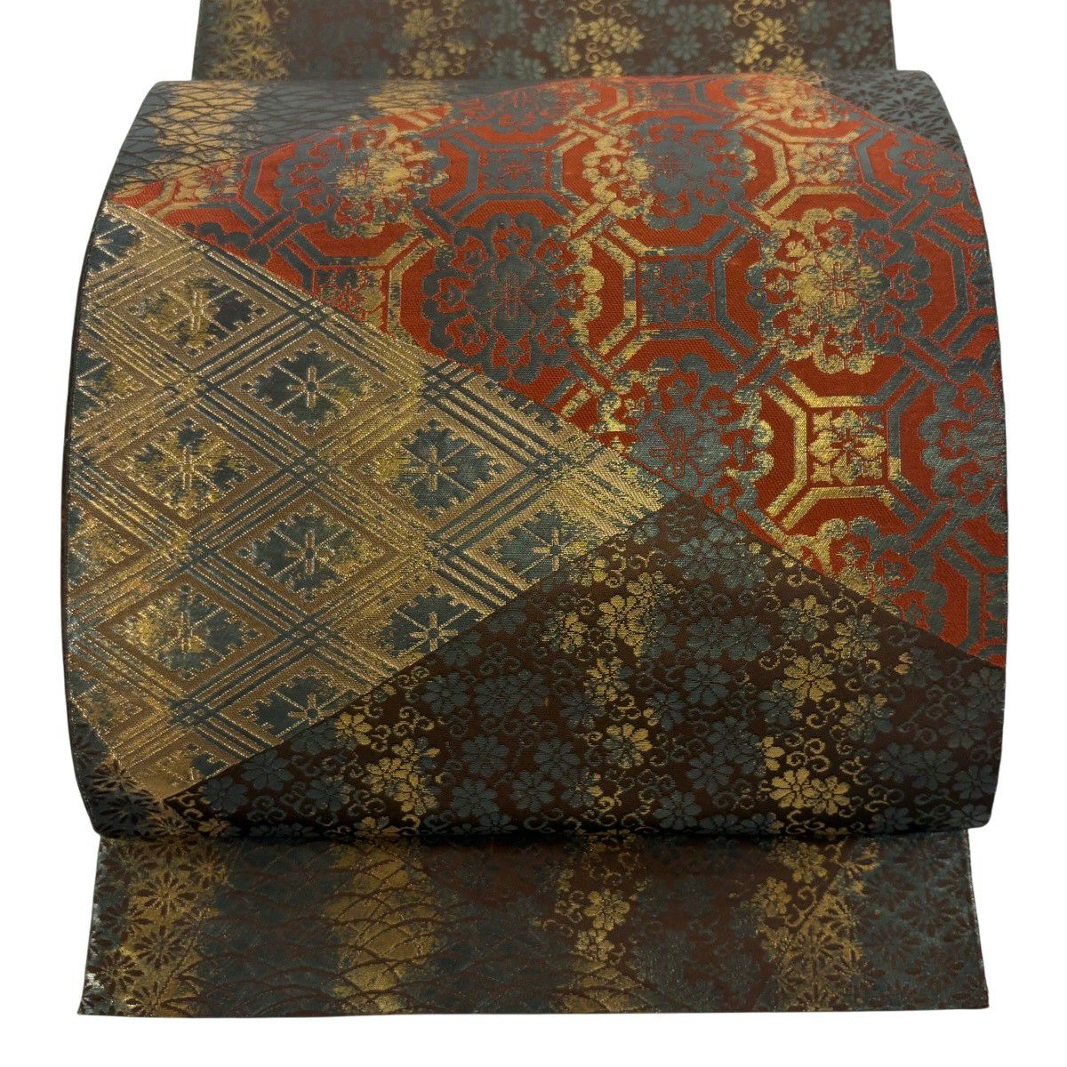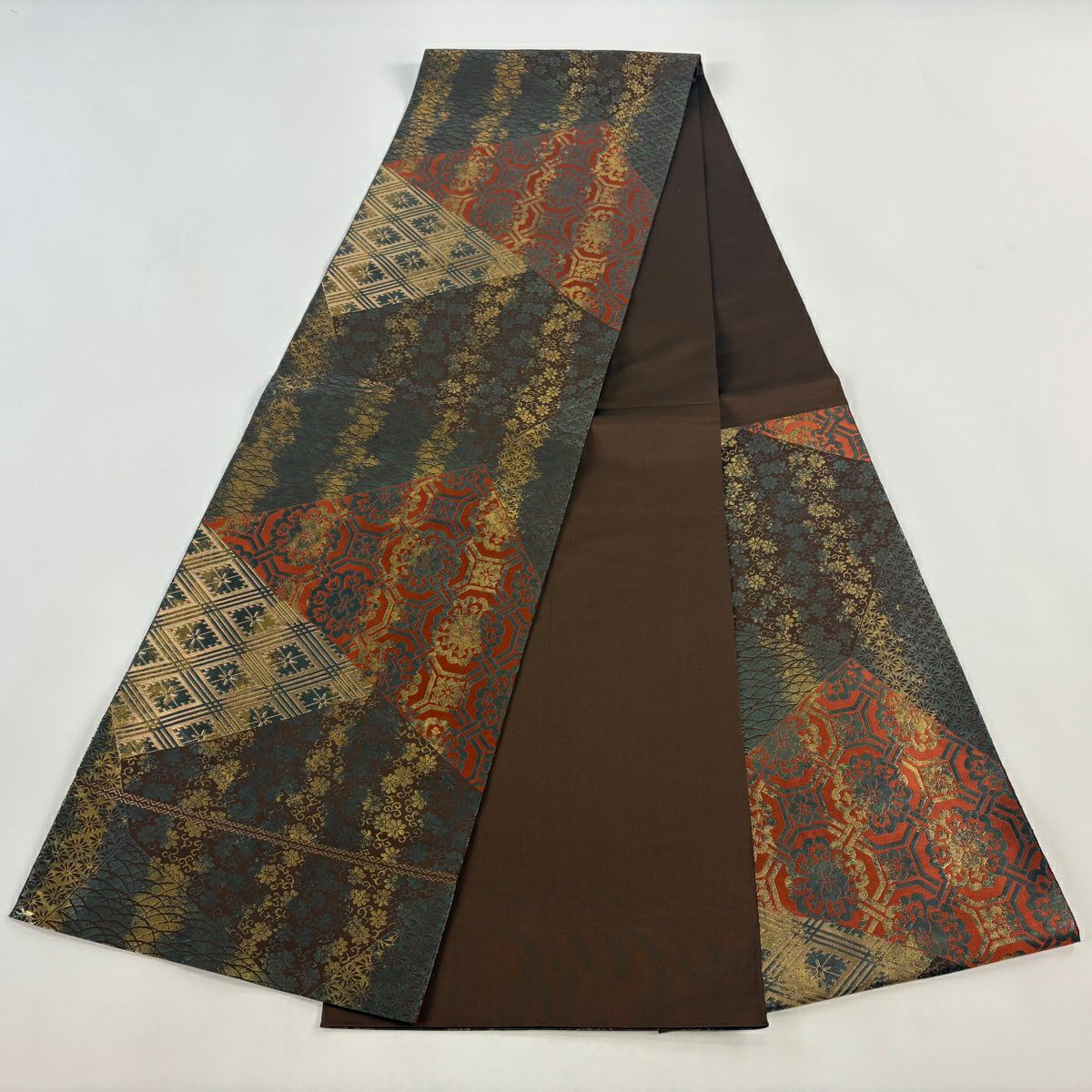 【美品】 袋帯 秀品 服部織物 落款あり こはく錦 手工芸 蜀江文 花唐草 金糸 箔 焦茶色 六通 正絹