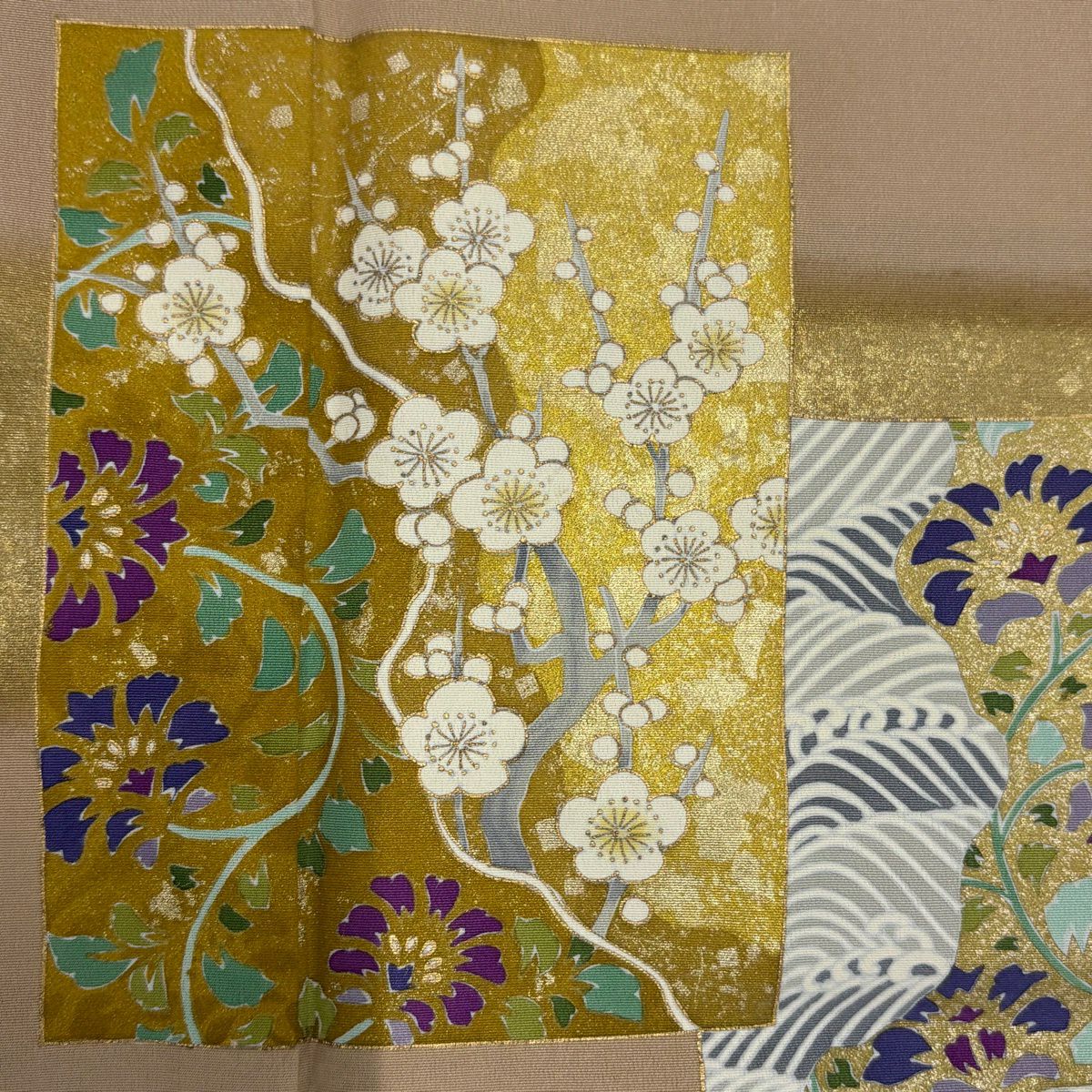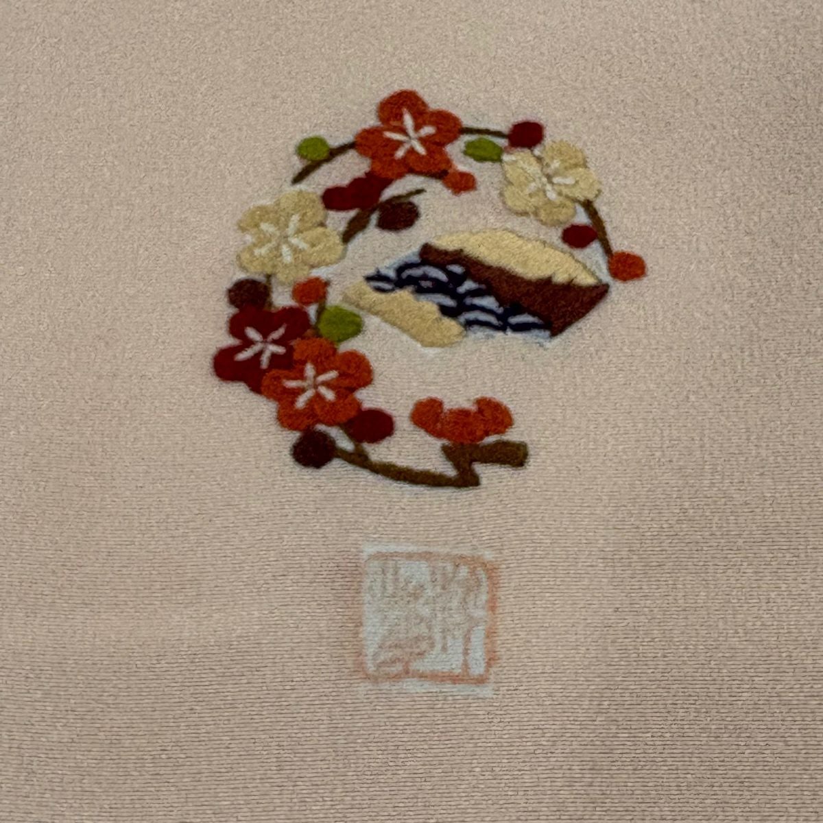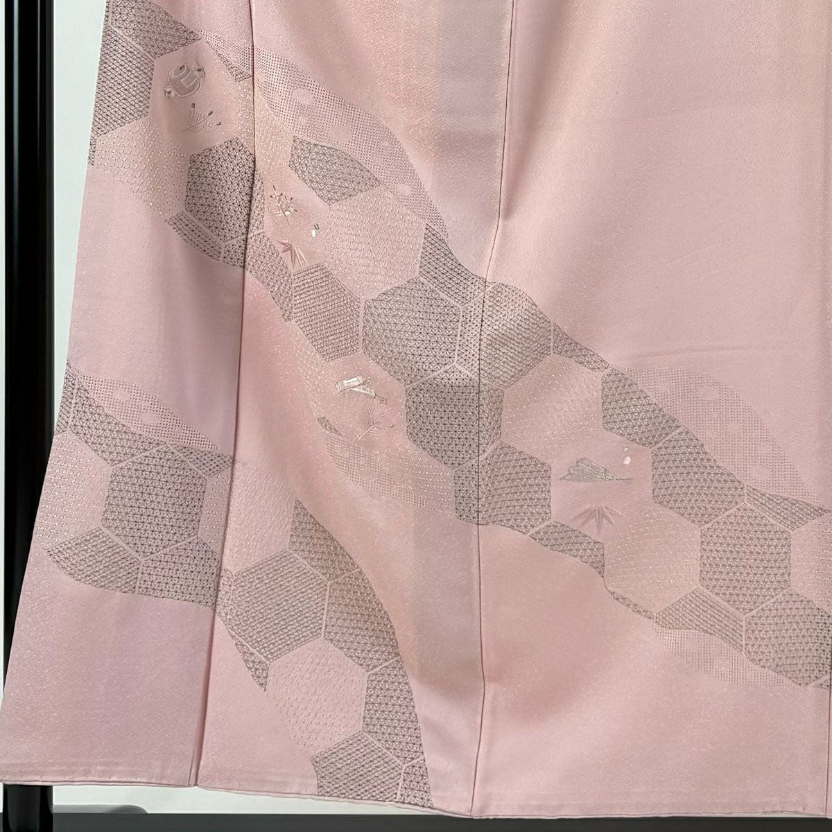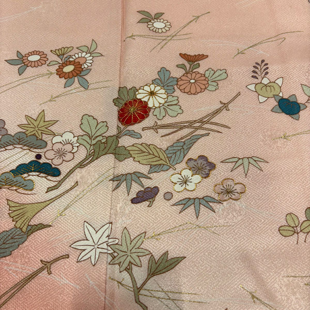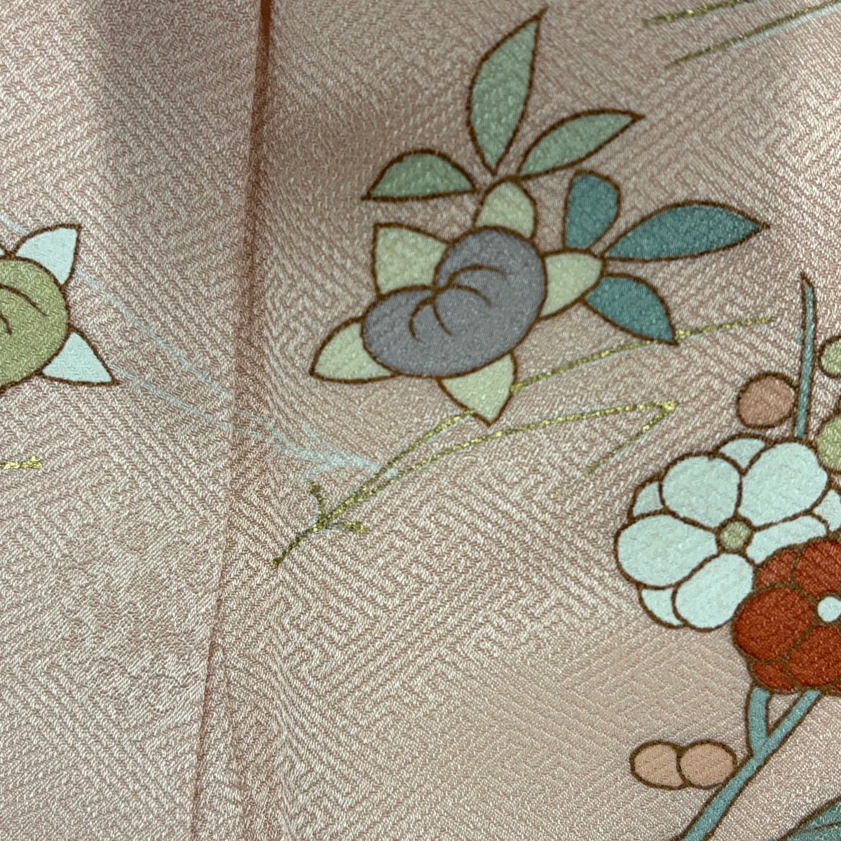 訪問着 身丈163cm 裄丈66cm M 袷 落款あり 吹き寄せ 松竹梅 金糸 金彩 薄ピンク 正絹 秀品