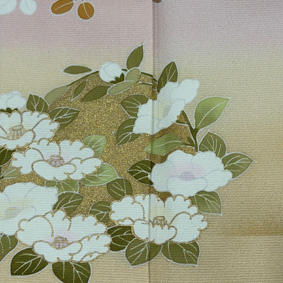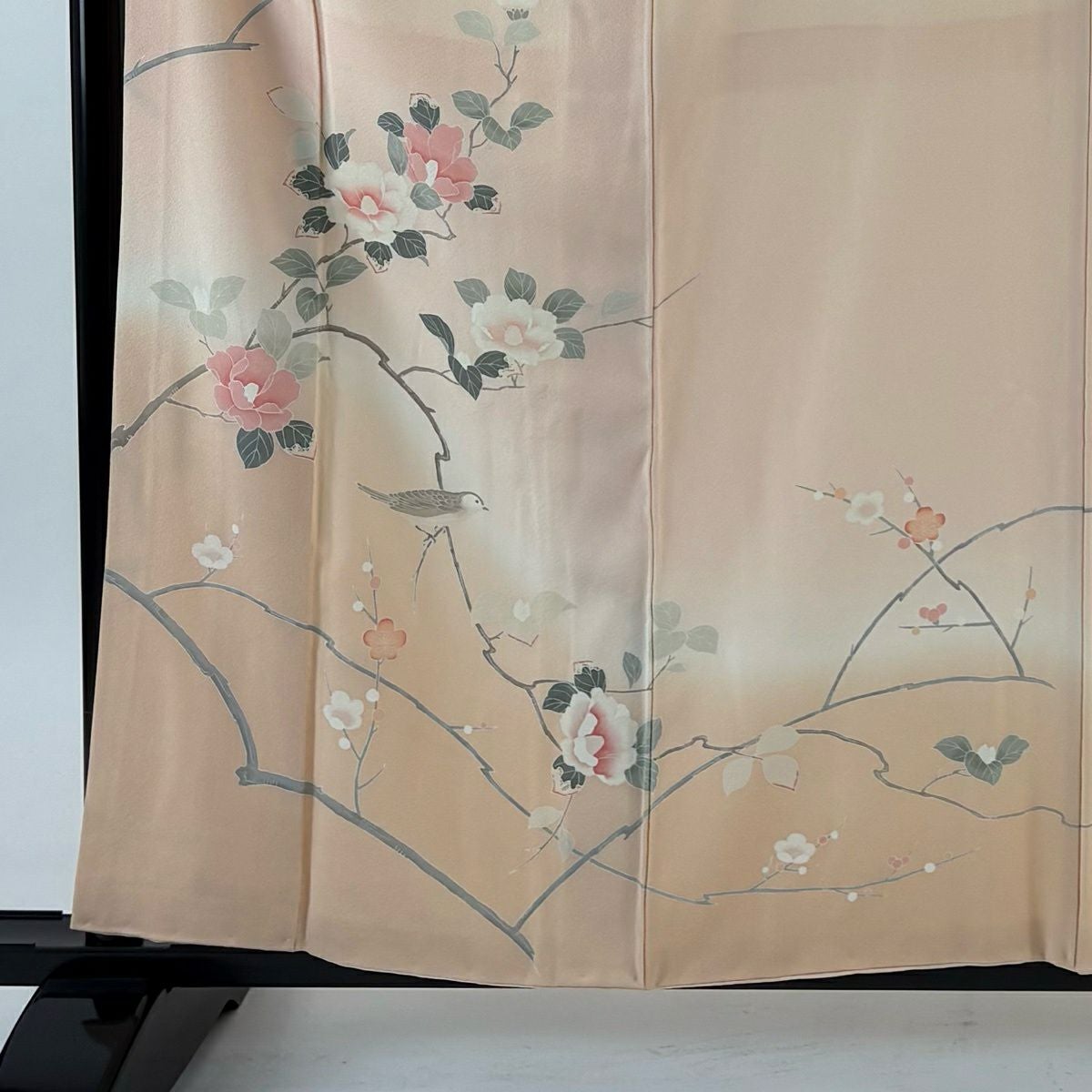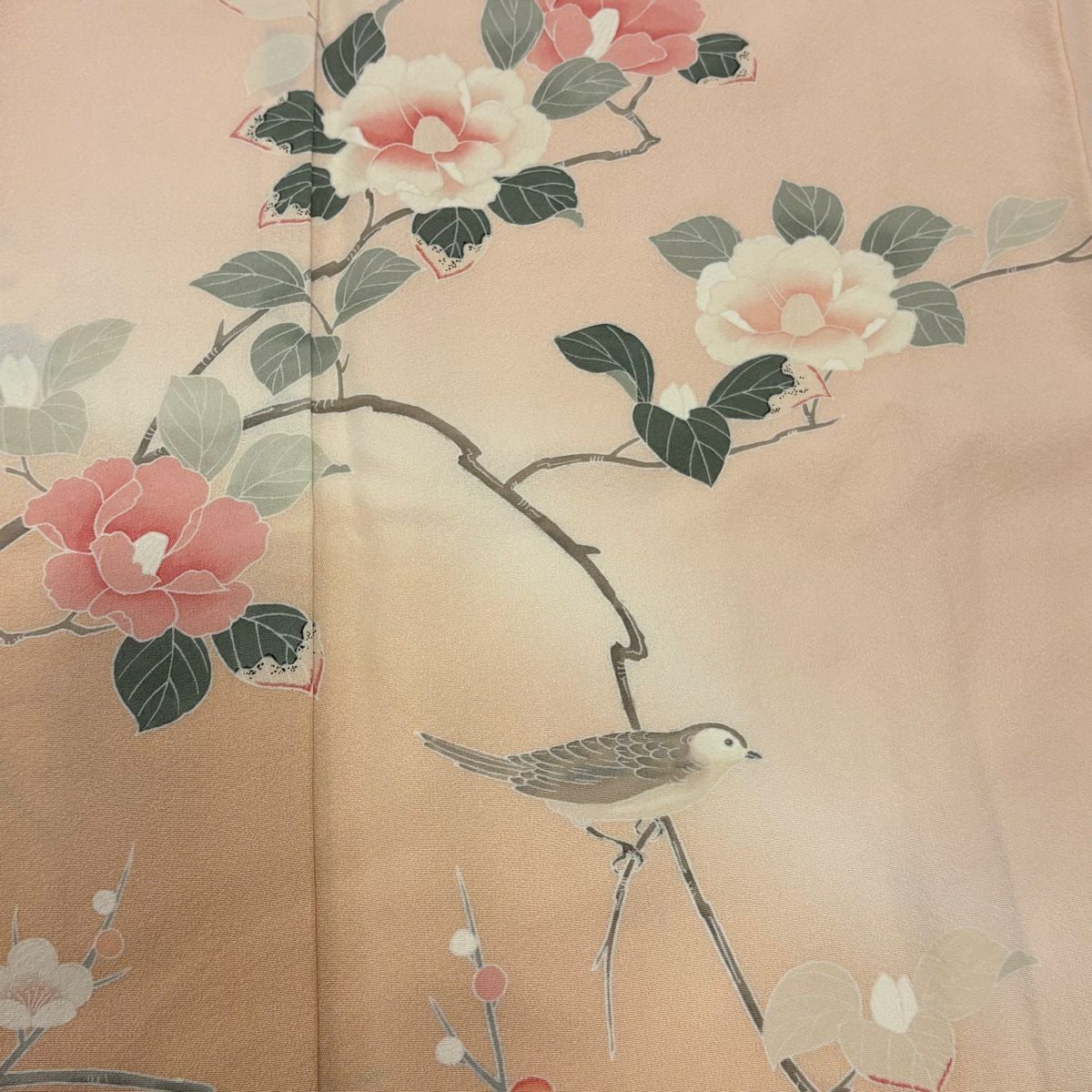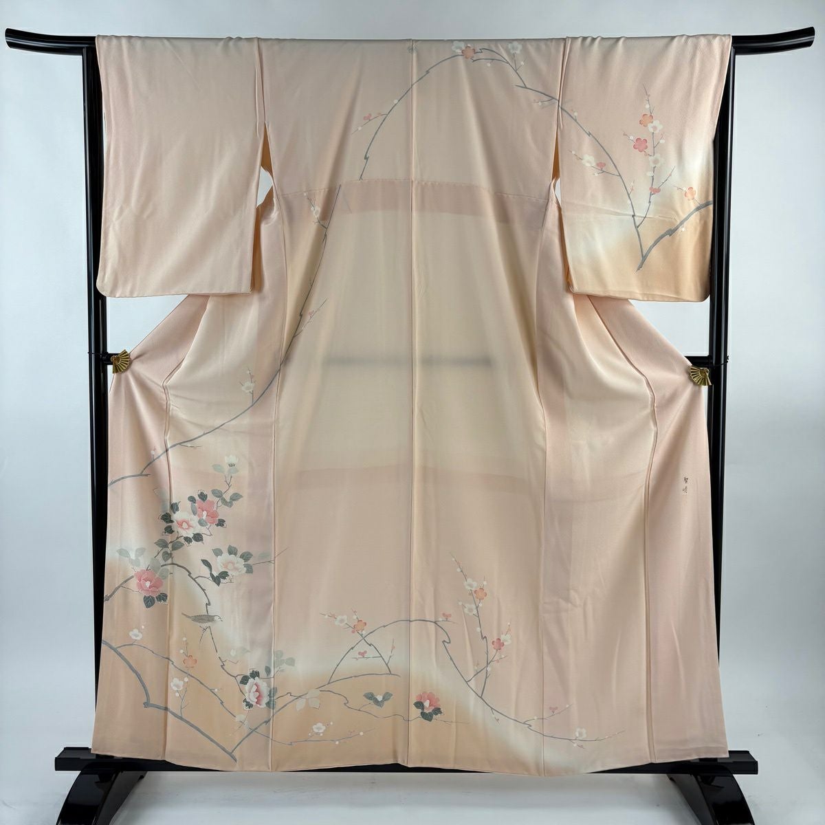 訪問着 身丈159cm 裄丈66.5cm M 袷 落款あり 椿 鳥 ぼかし 薄ピンク 正絹 秀品 一つ紋