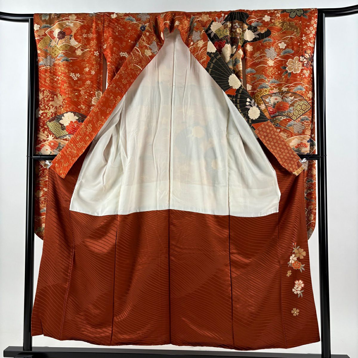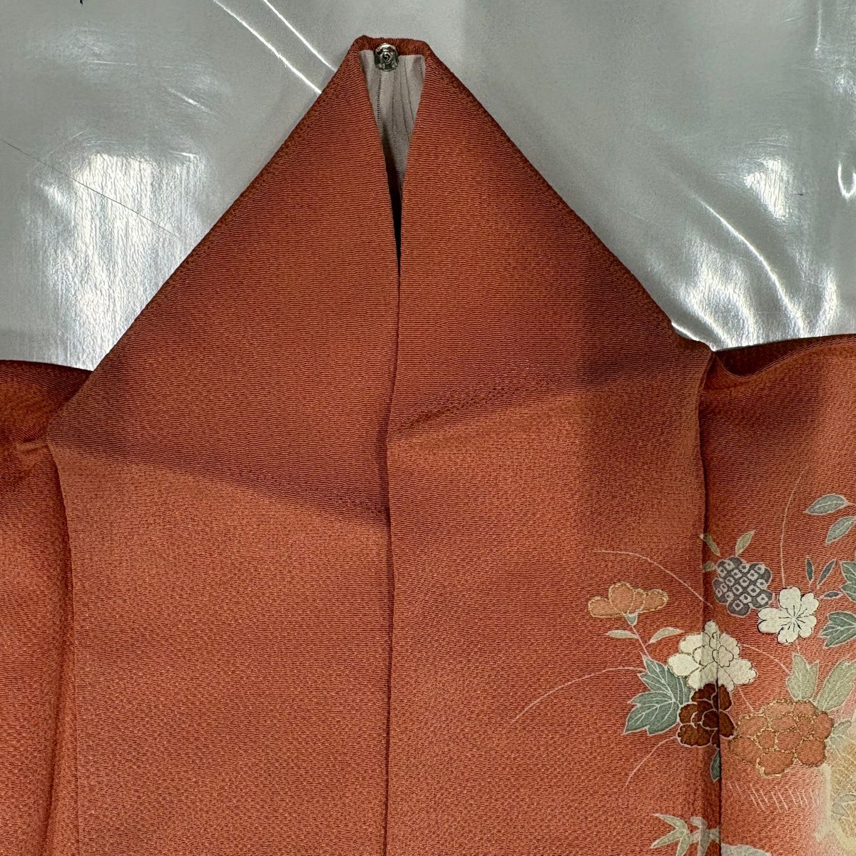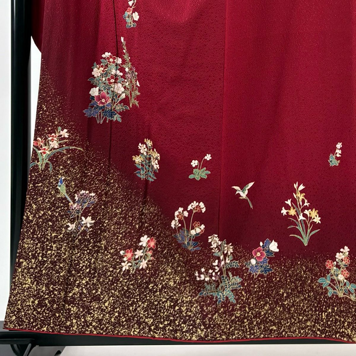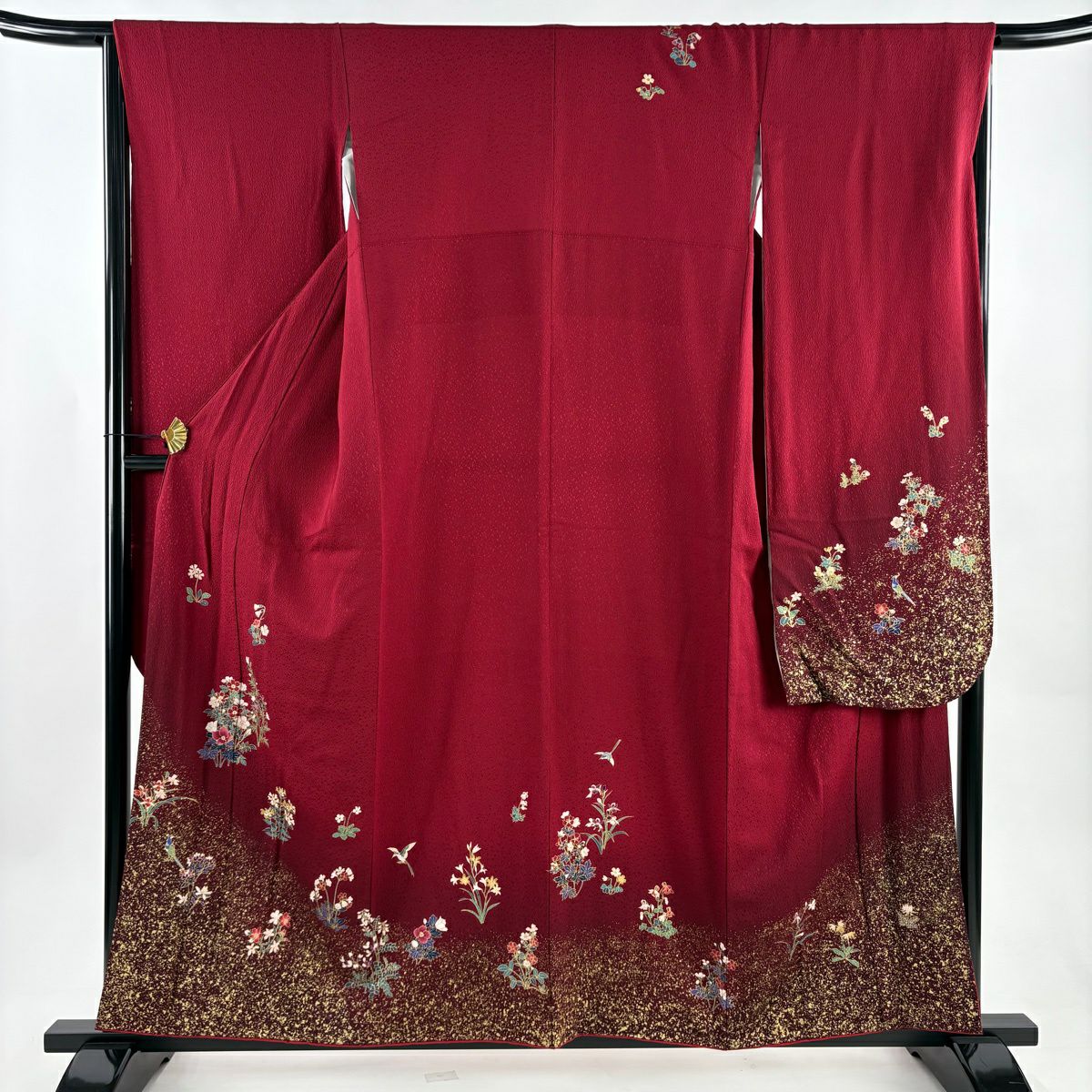 【美品】 振袖 身丈154cm 裄丈65.5cm M 袷 落款あり 鴛鴦 草花 金糸 金彩 赤茶 正絹 秀品