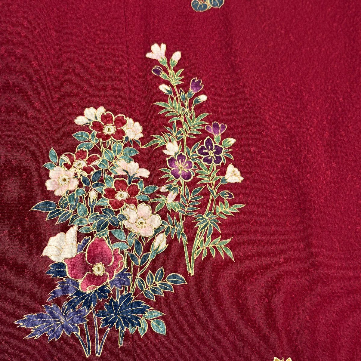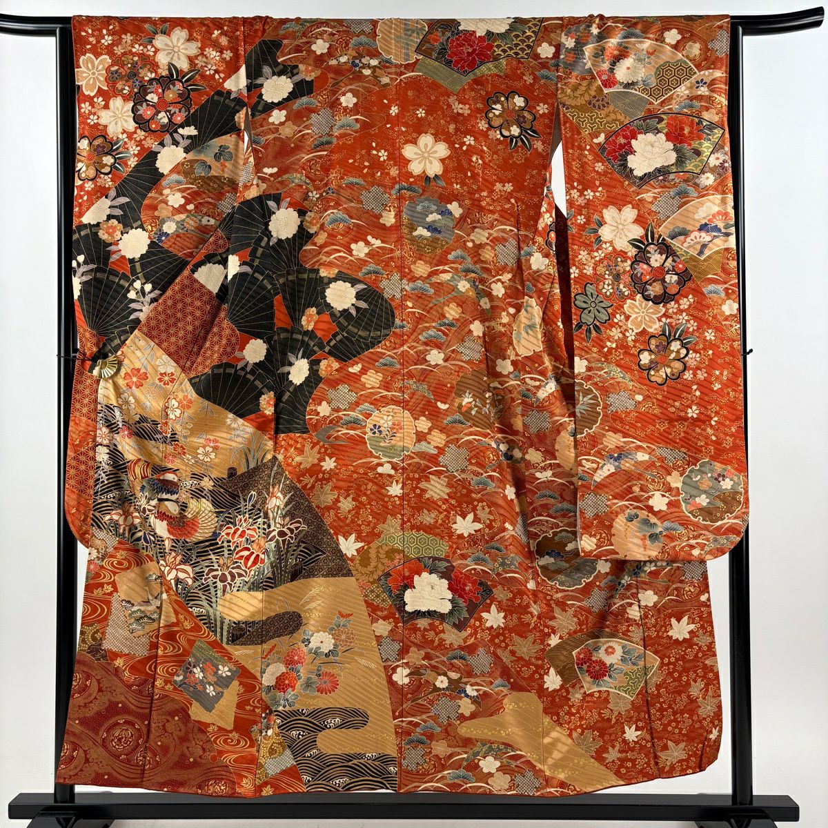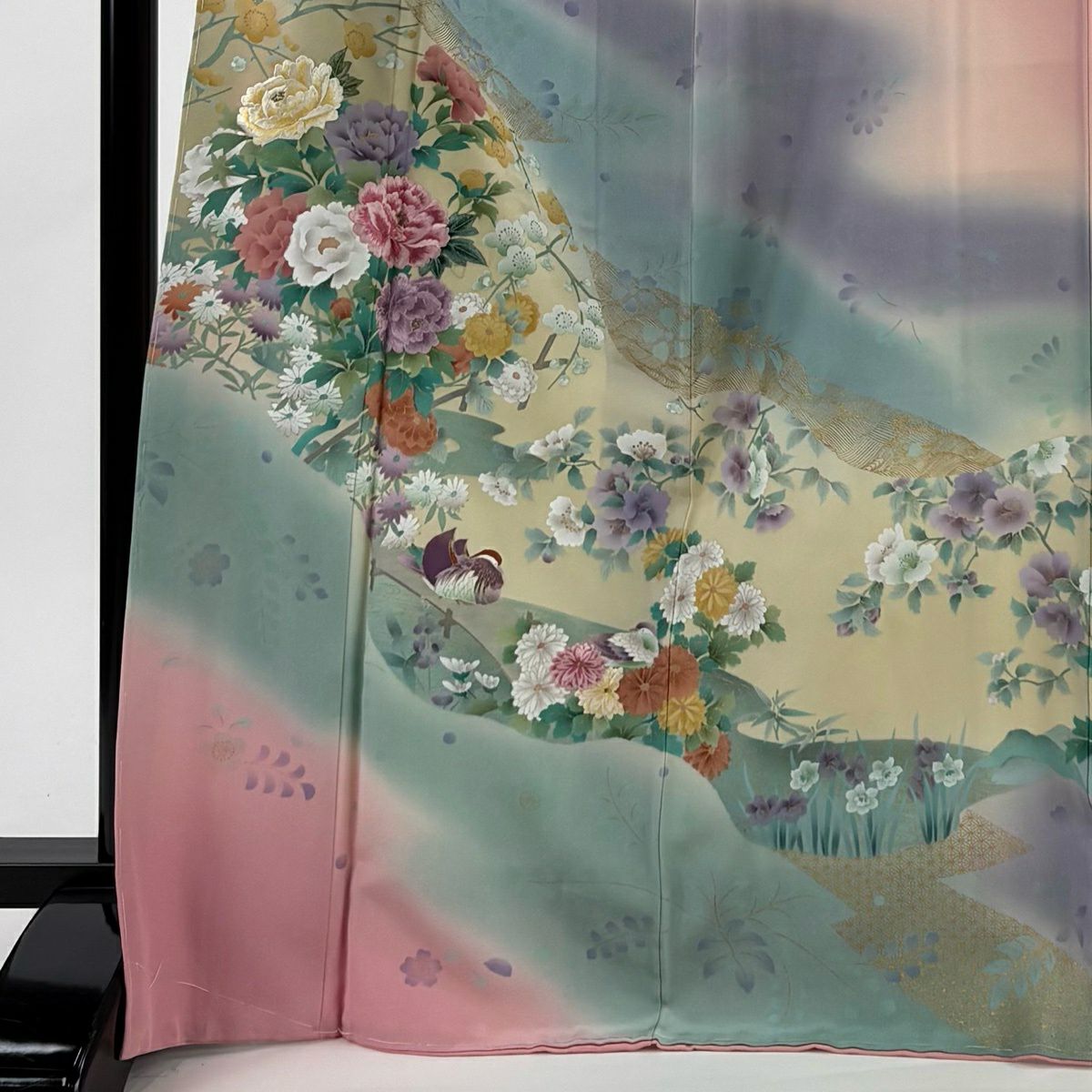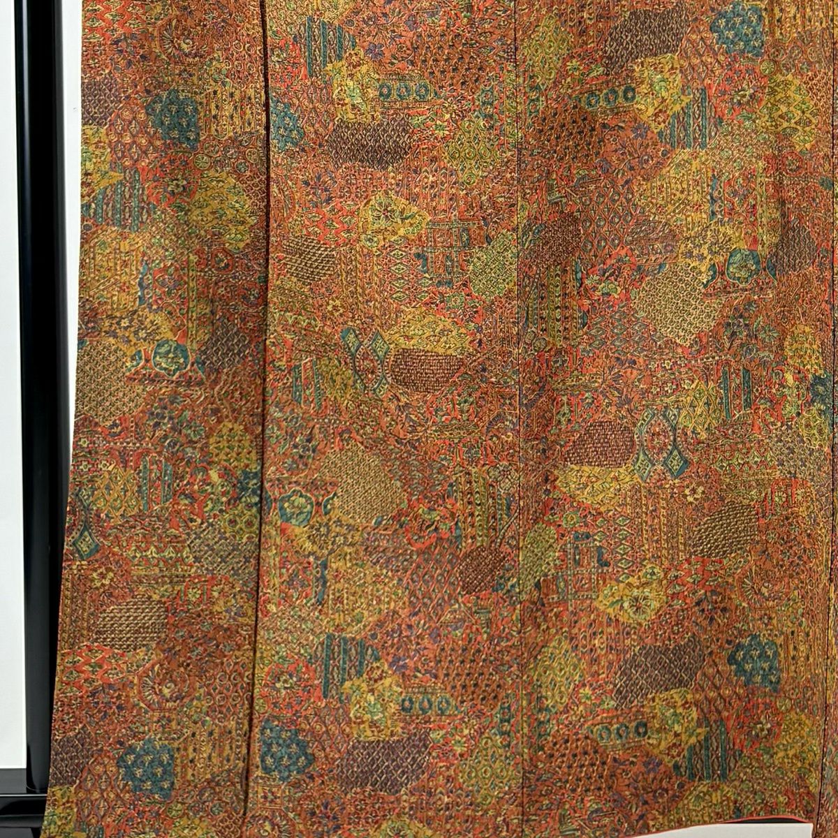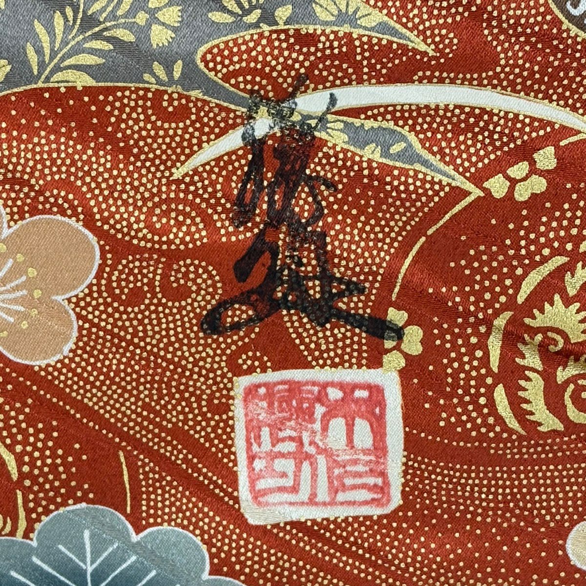 【美品】 振袖 身丈154cm 裄丈65.5cm M 袷 落款あり 鴛鴦 草花 金糸 金彩 赤茶 正絹 秀品