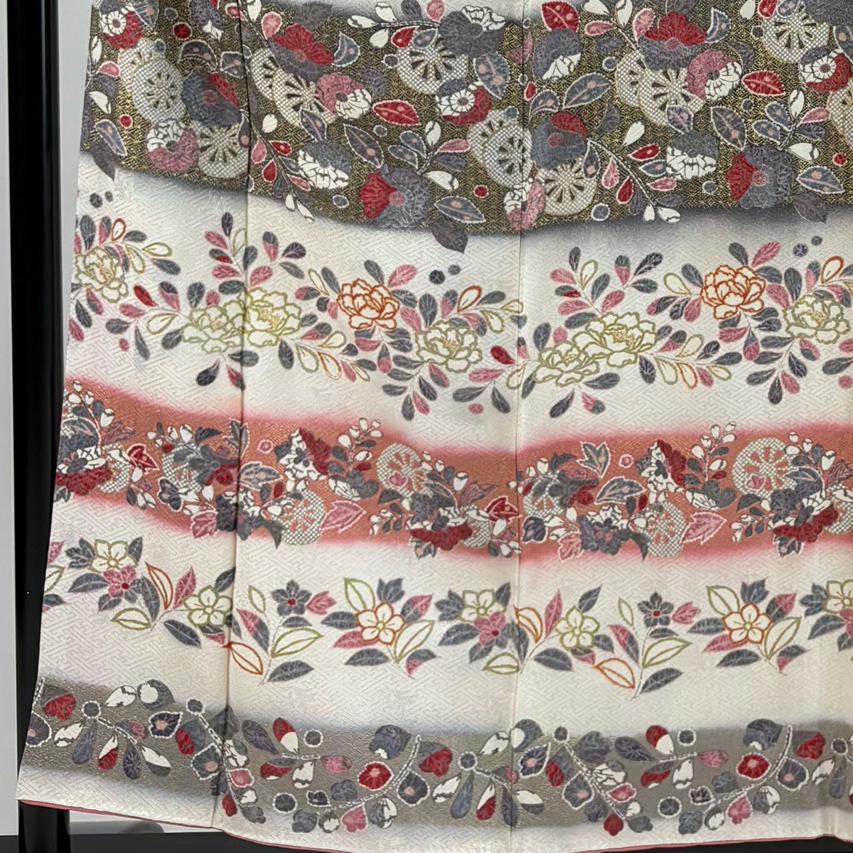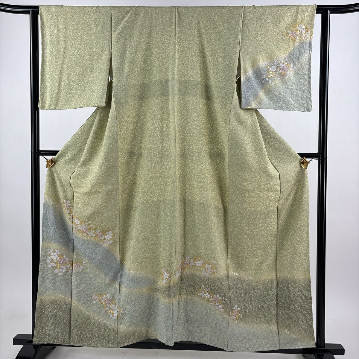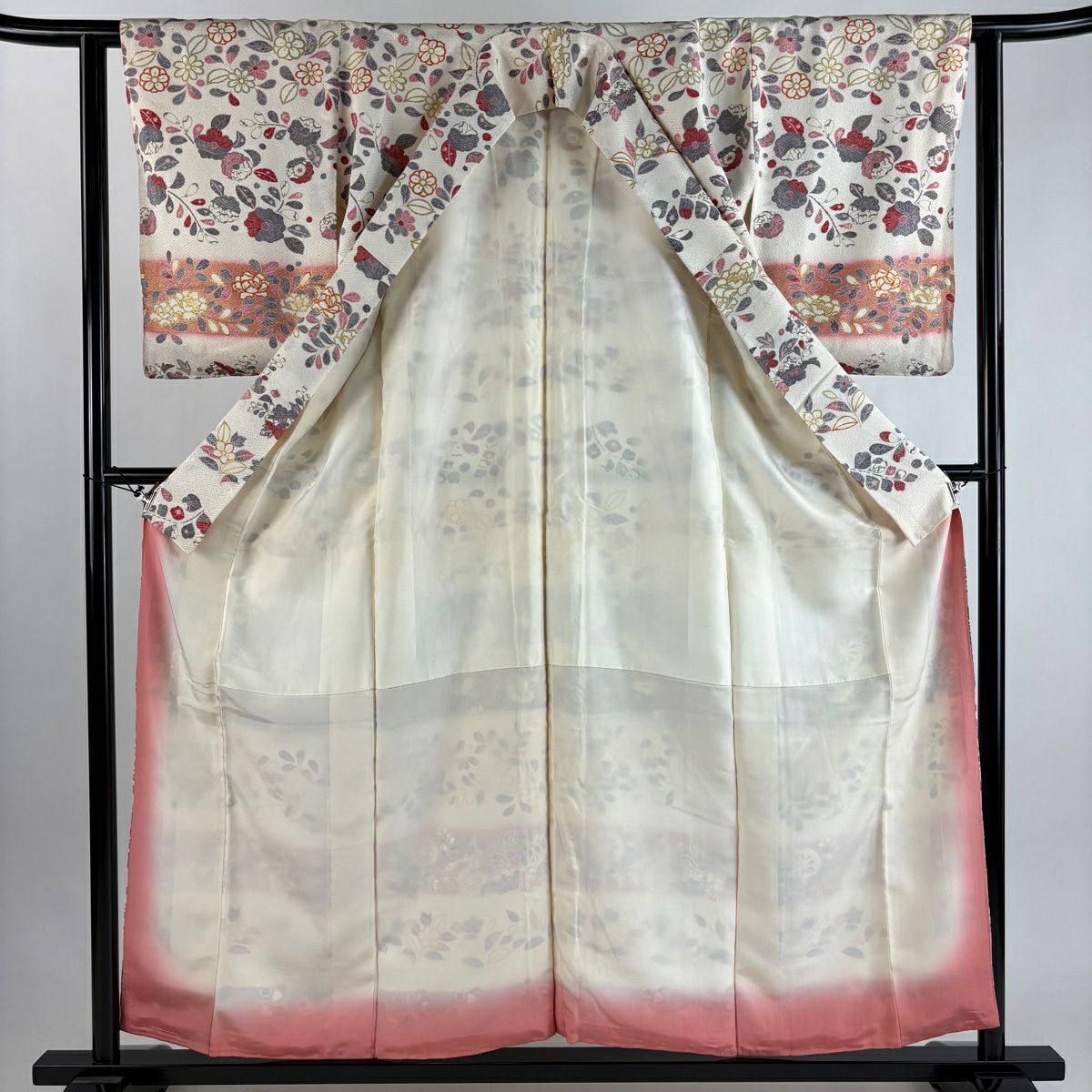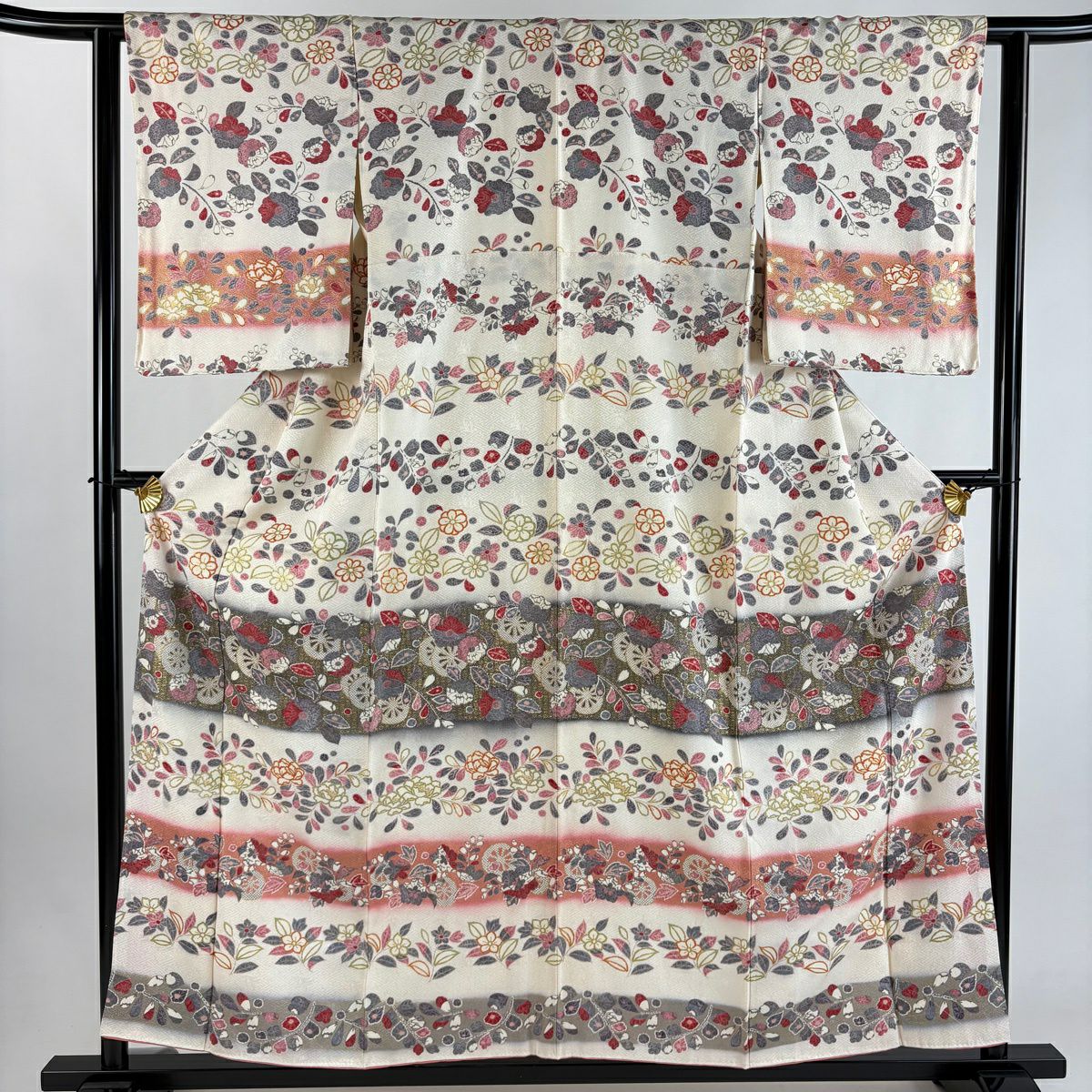 【美品】 訪問着 身丈156.5cm 裄丈62cm S 袷 草花 段縞 金彩 ぼかし クリーム 正絹 秀品