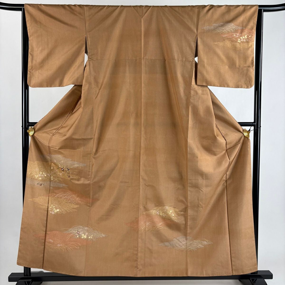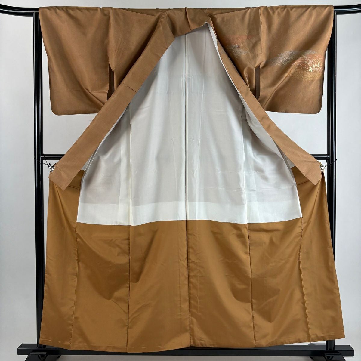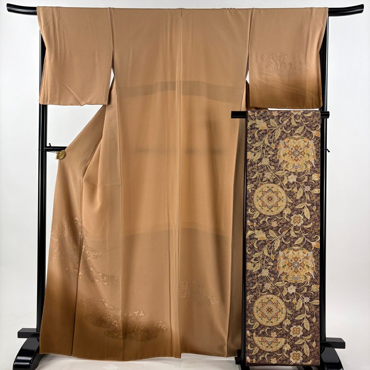 付下げ 身丈166.5cm 裄丈67.5cm L 袷 袋帯セット 鳳凰 花唐草 刺繍 銀糸 薄茶色 正絹 秀品