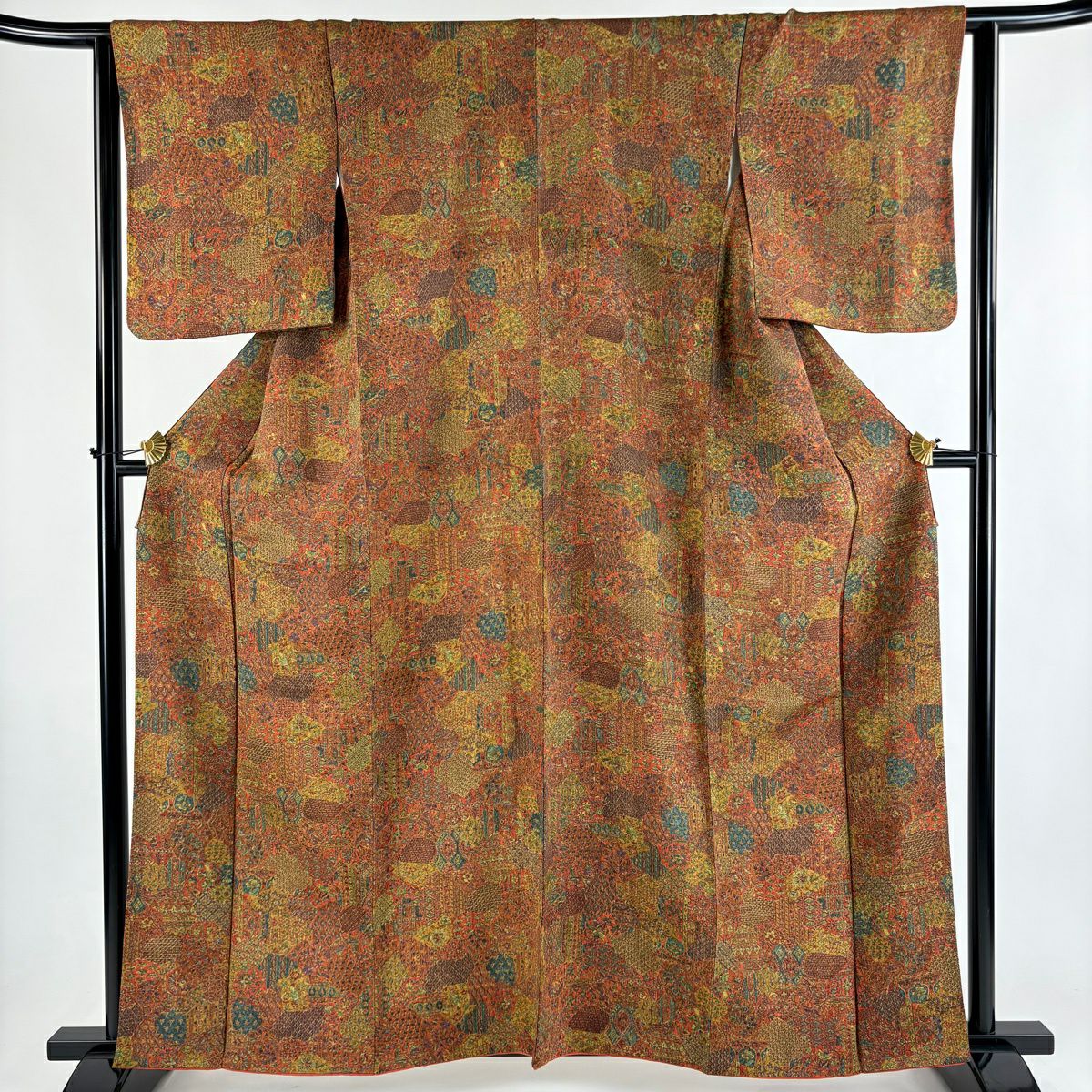 【美品】 小紋 身丈159cm 裄丈63.5cm S 袷 紬地 やまと 鳥 草花 絞り 焦茶色 正絹 秀品