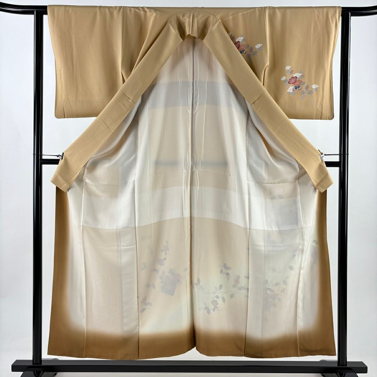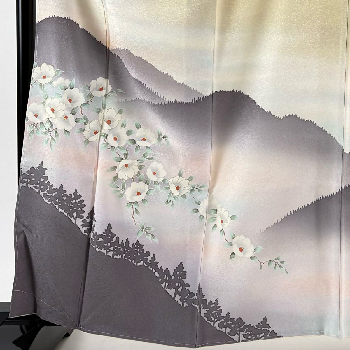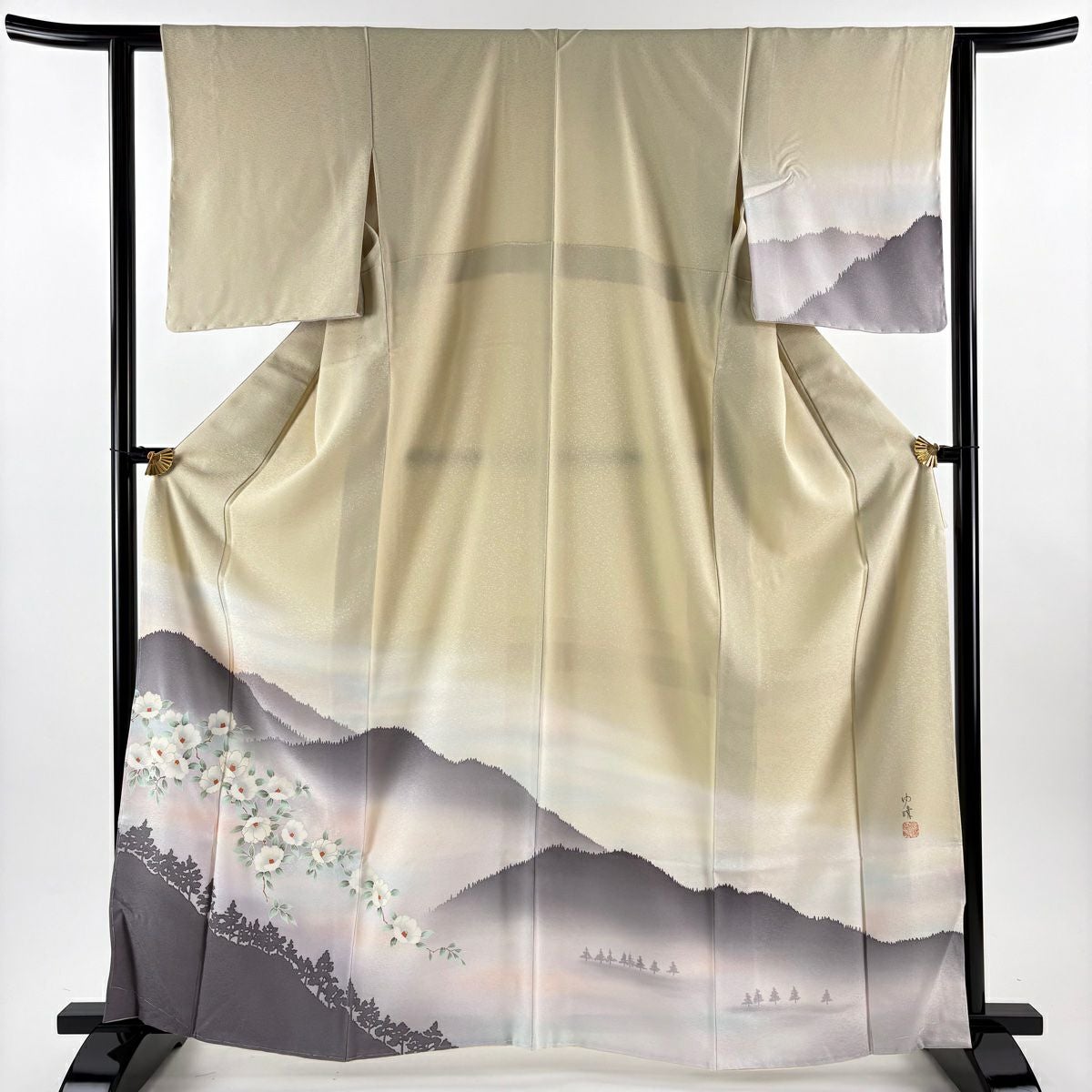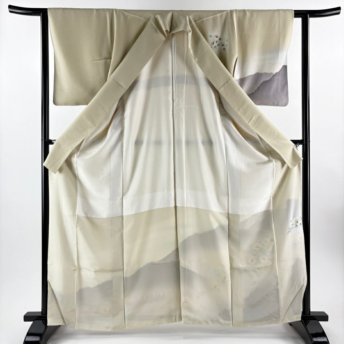 付下げ 身丈164cm 裄丈62cm S 袷 落款あり 椿 山並み 金彩 ぼかし ベージュ 正絹 秀品
