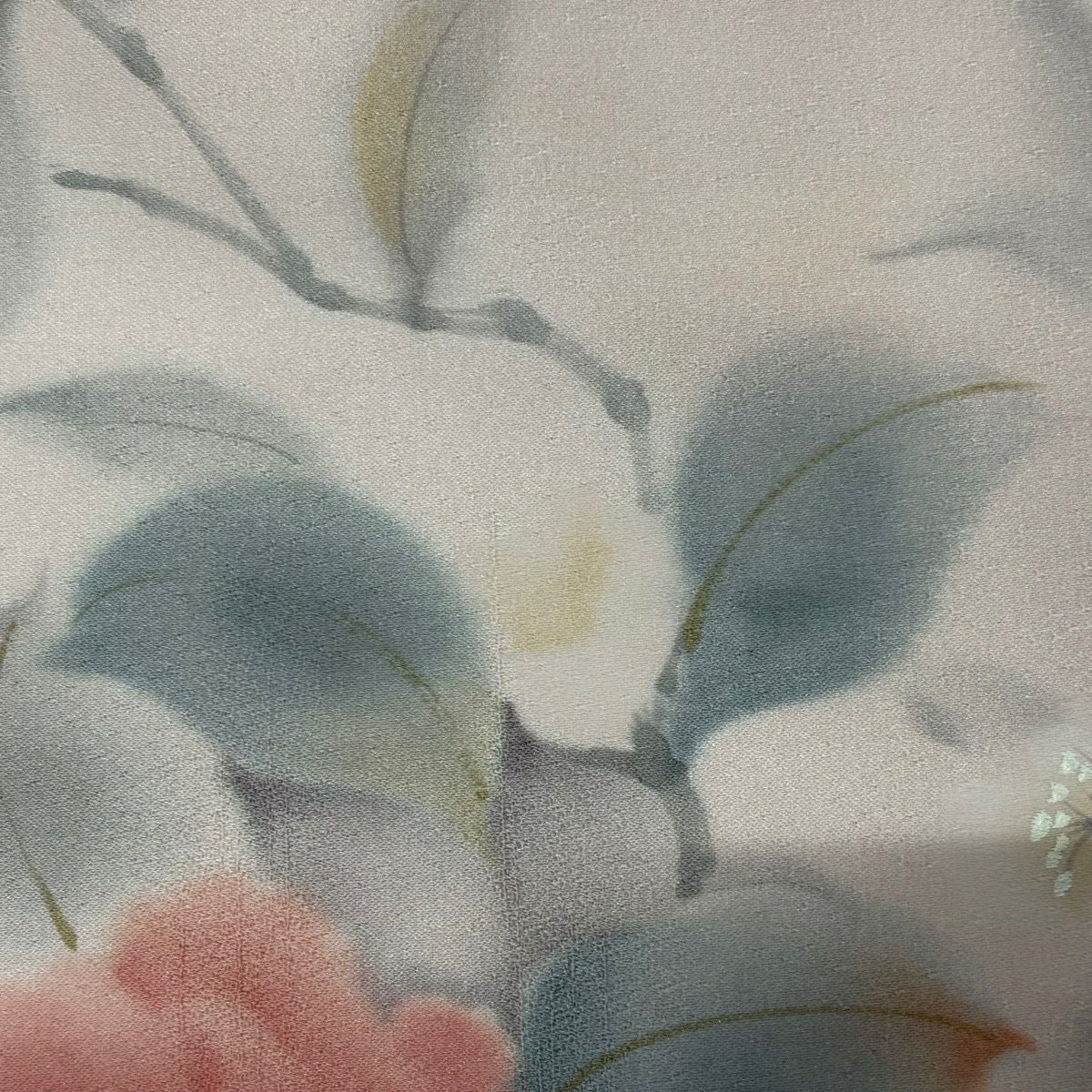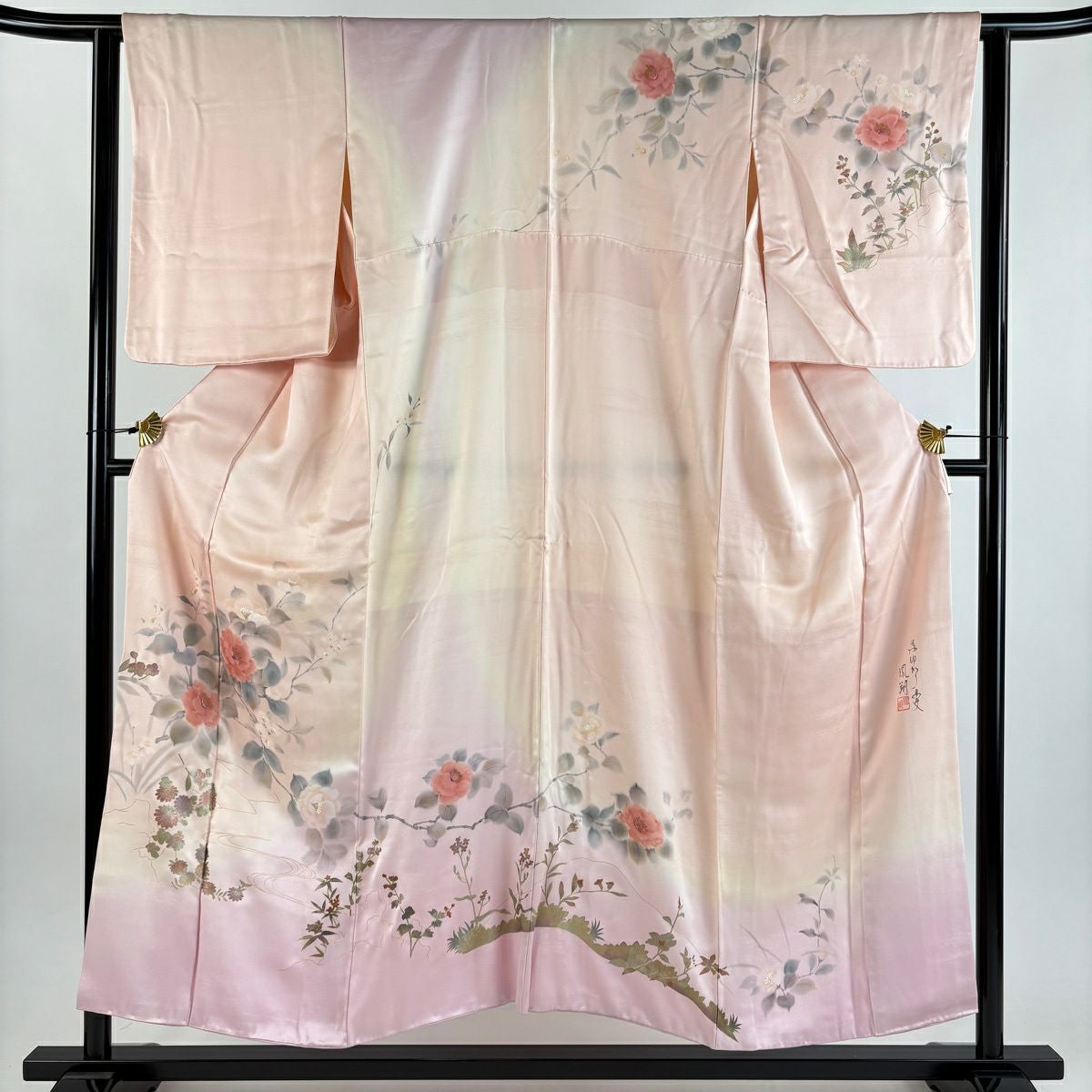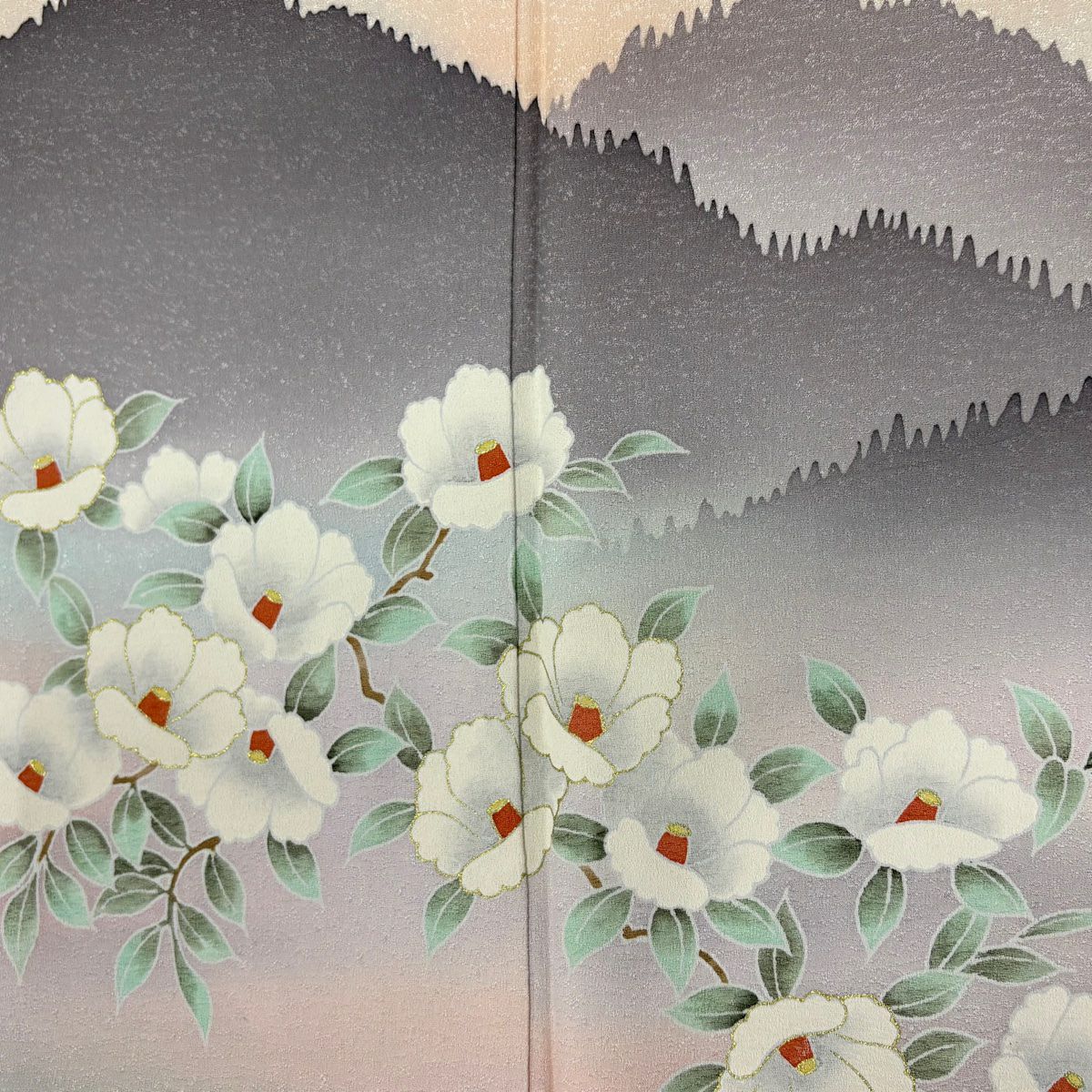 付下げ 身丈164cm 裄丈62cm S 袷 落款あり 椿 山並み 金彩 ぼかし ベージュ 正絹 秀品