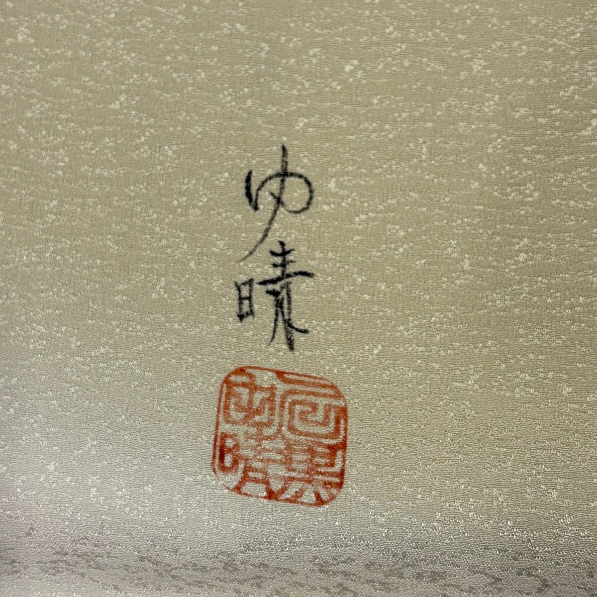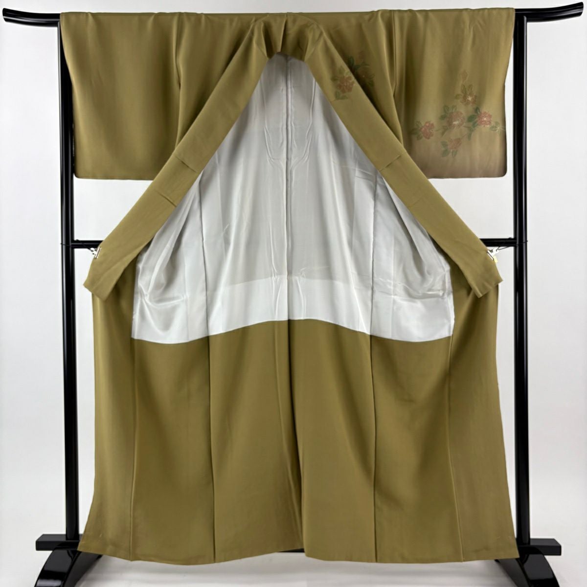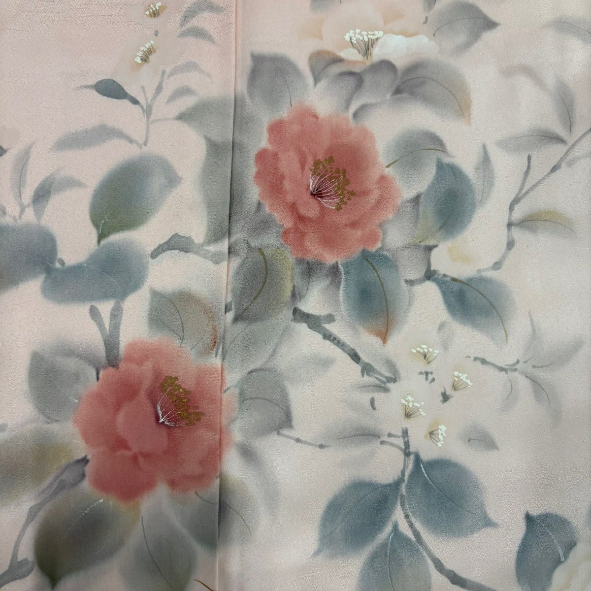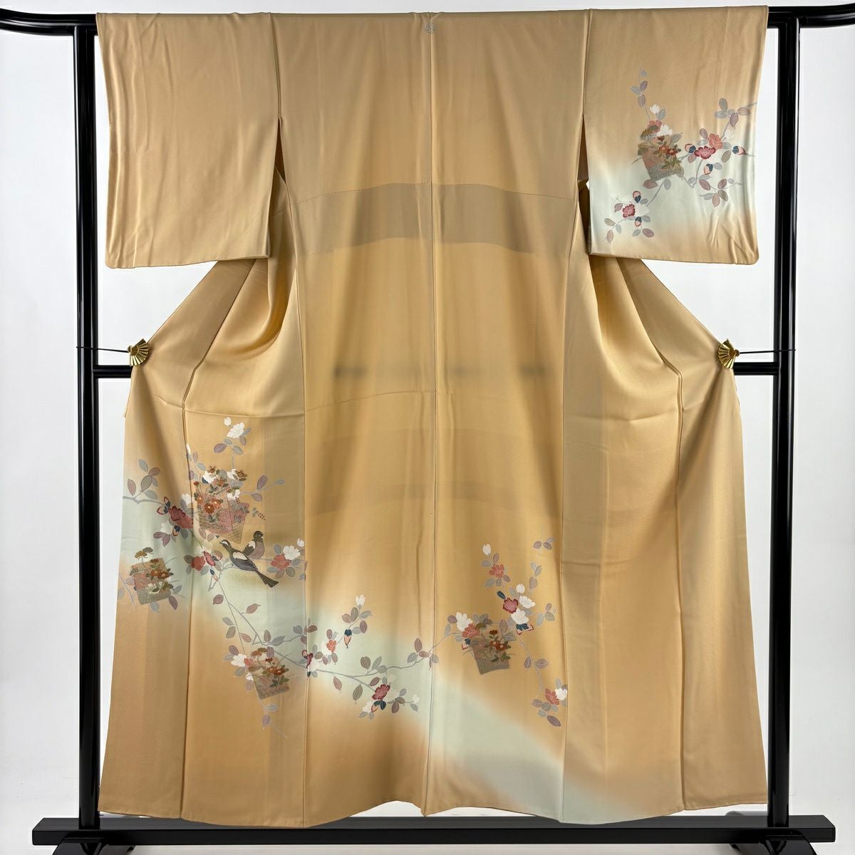 付下げ 身丈164cm 裄丈62cm S 袷 落款あり 椿 山並み 金彩 ぼかし ベージュ 正絹 秀品