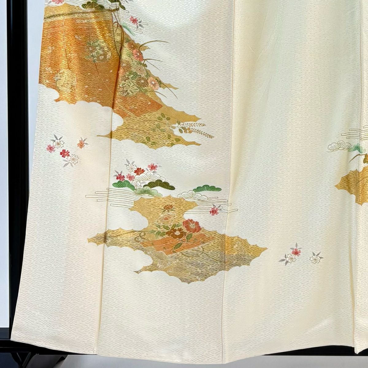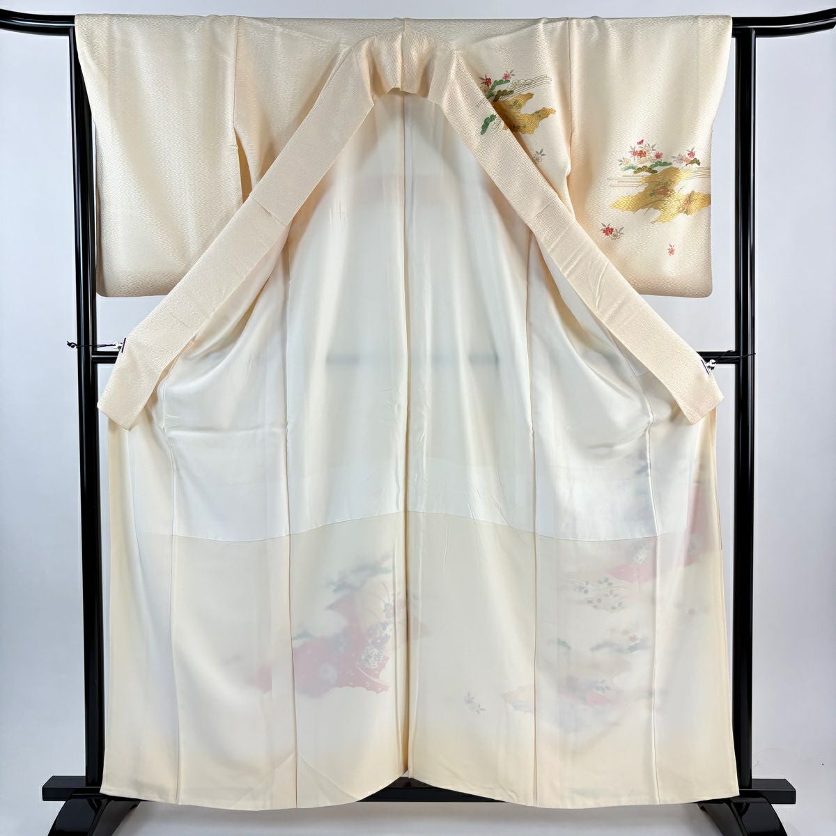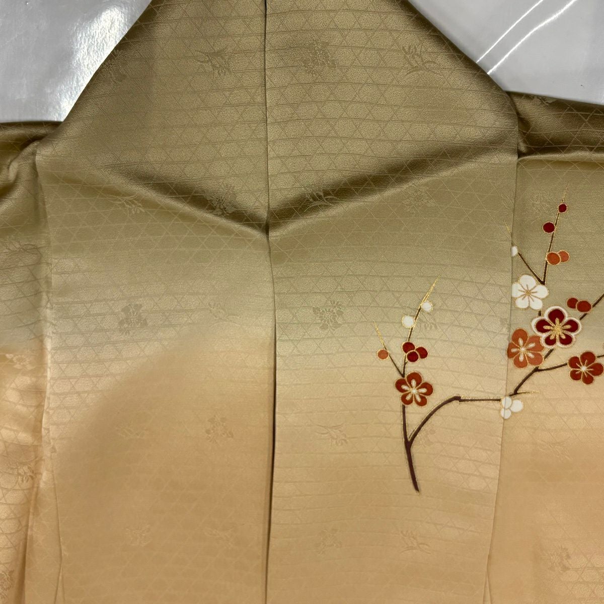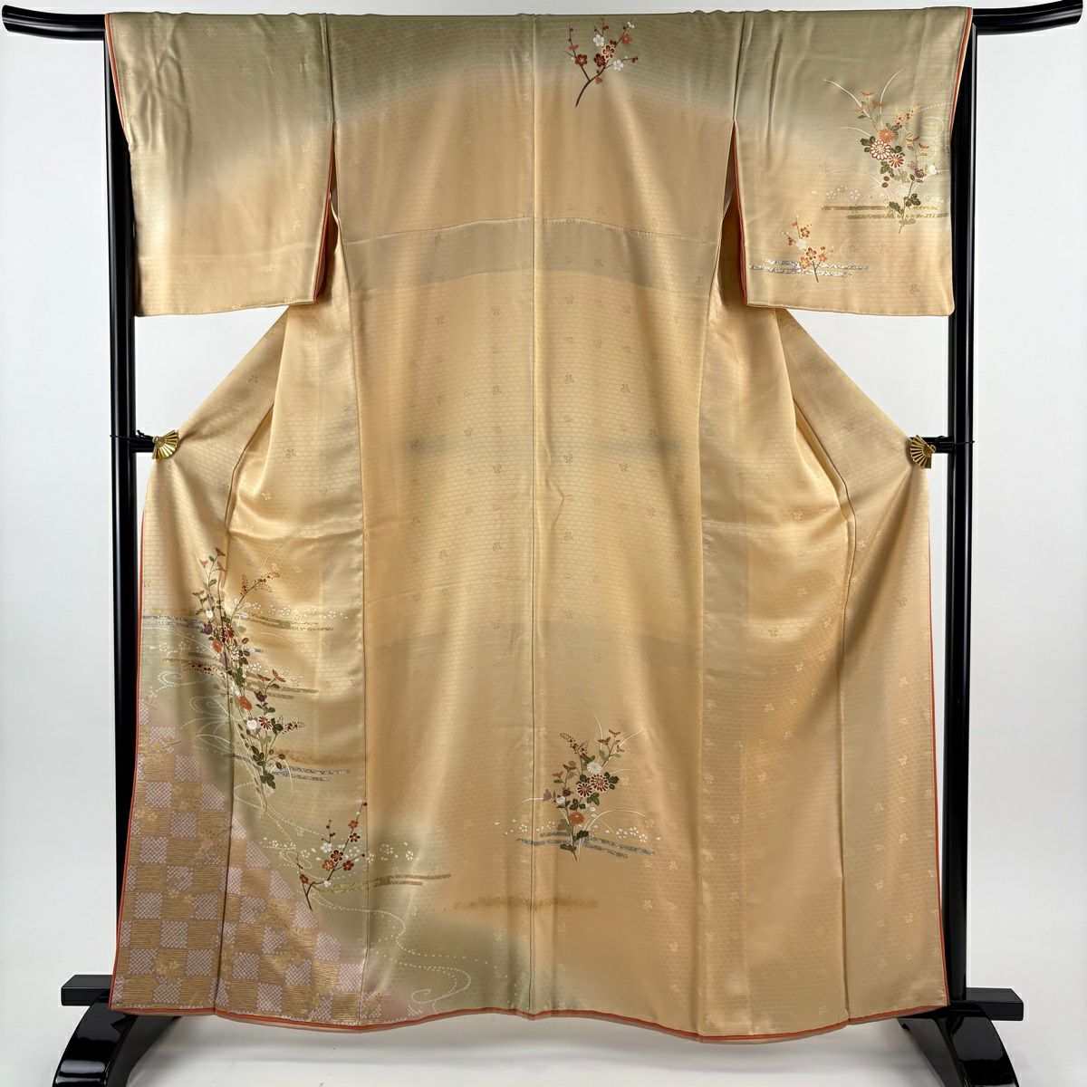 【美品】 付下げ 身丈158.5cm 裄丈64cm M 袷 枝梅 椿 染め分け 金彩 クリーム 正絹 秀品