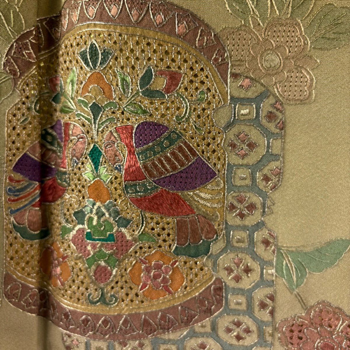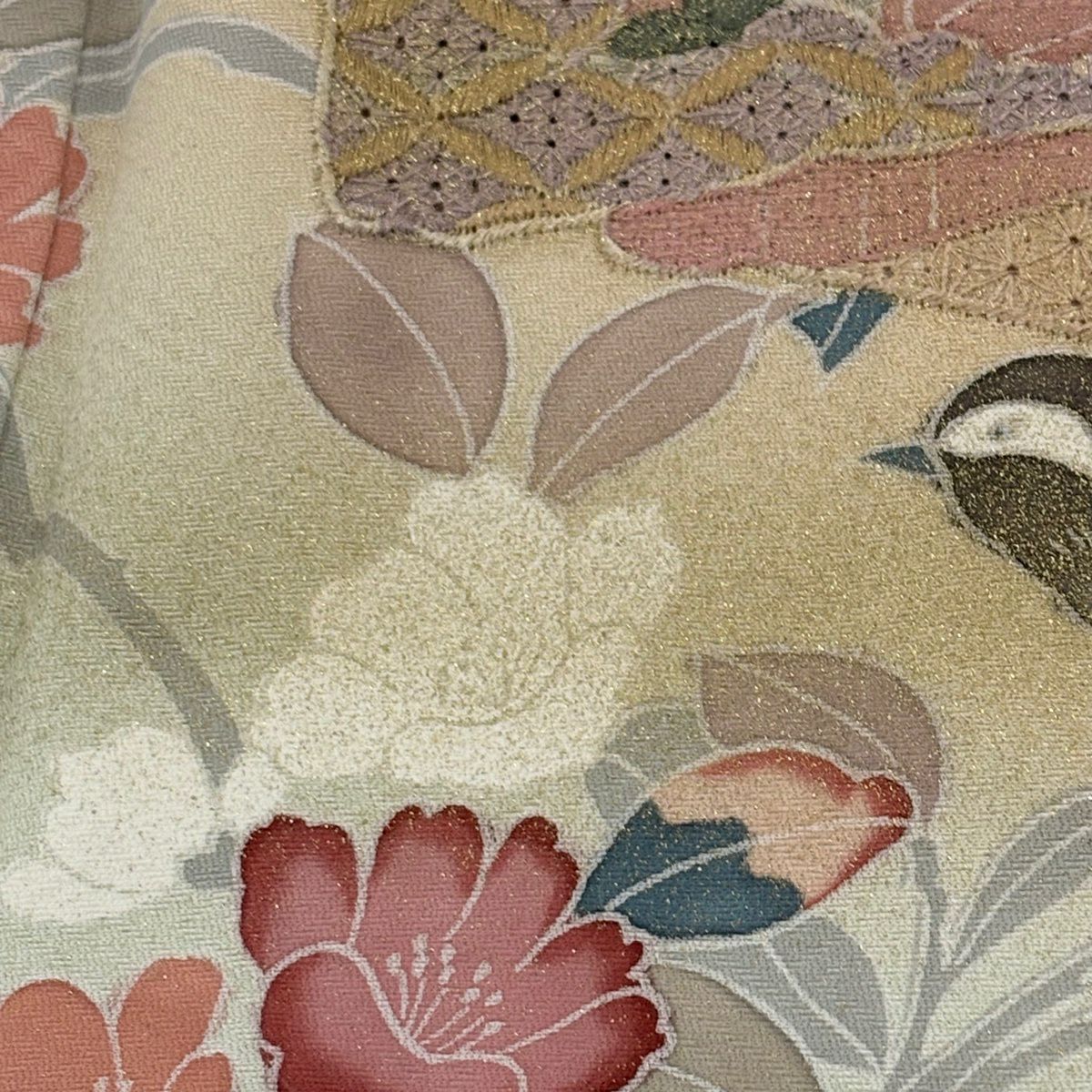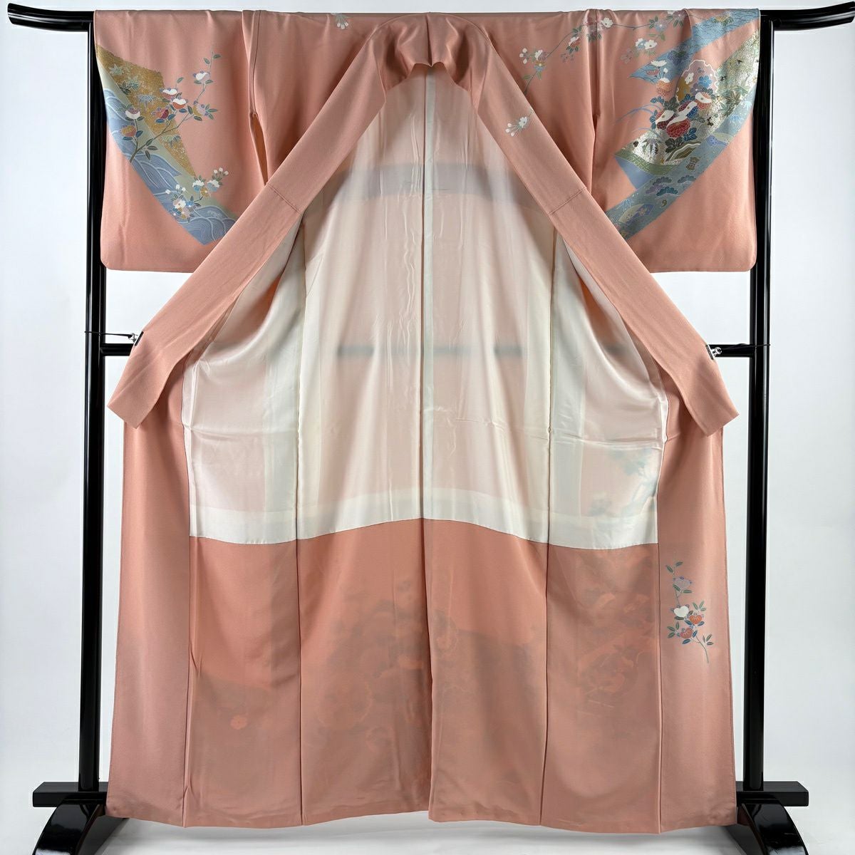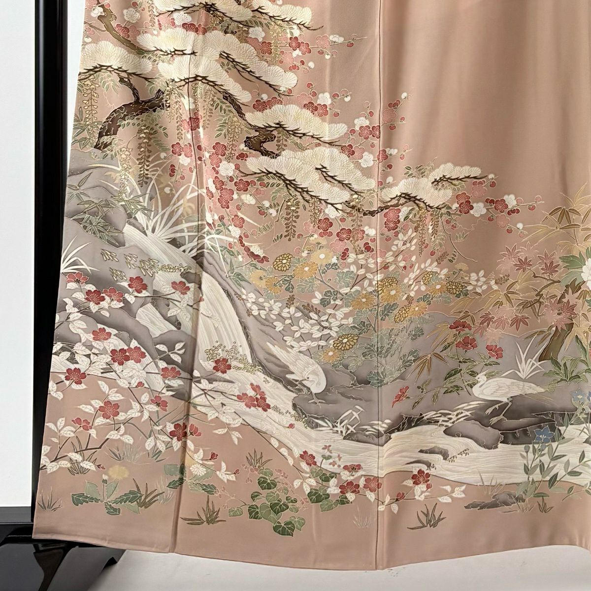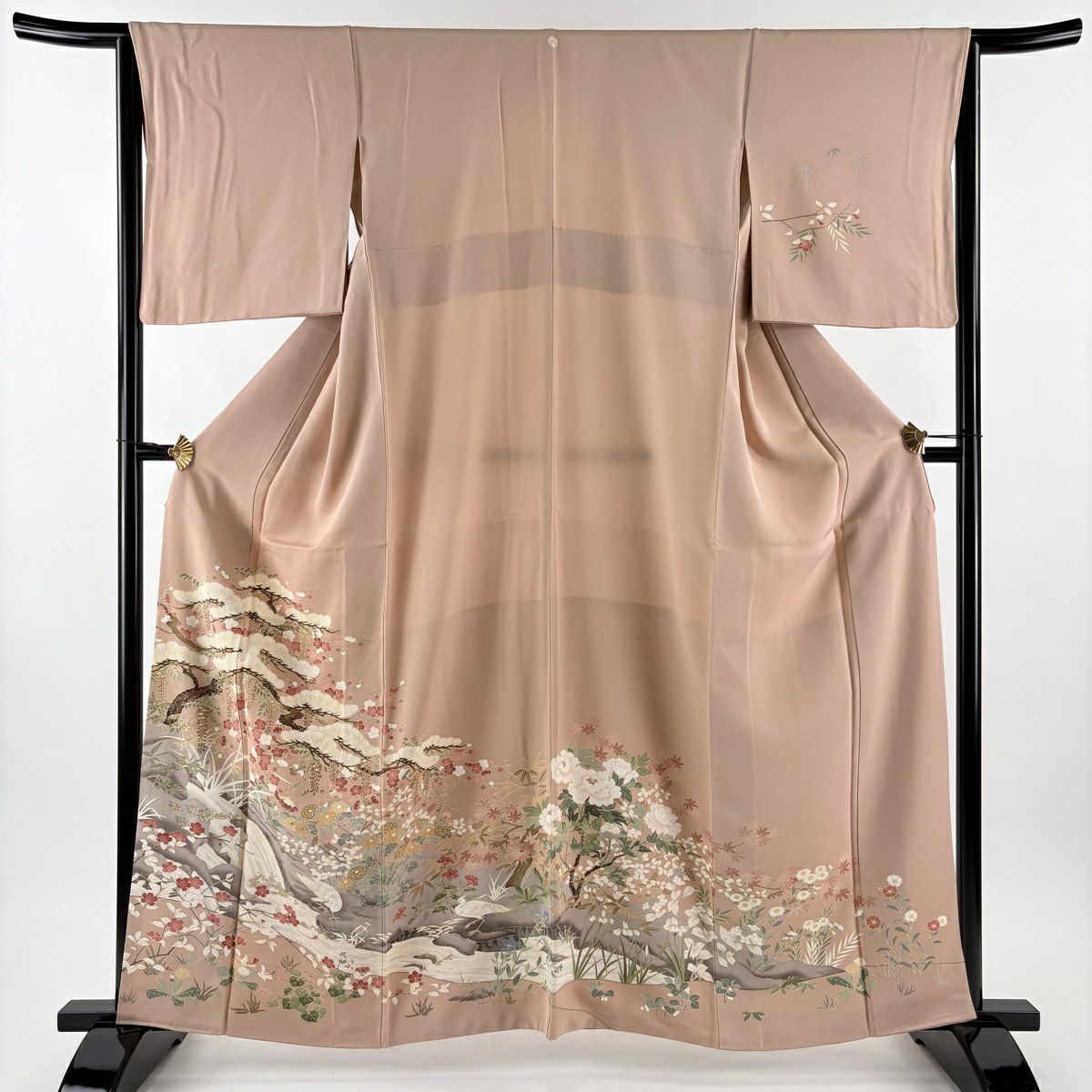 色留袖 身丈161.5cm 裄丈65cm M 袷 松 鳥 金糸 金彩 ピンクベージュ 正絹 秀品 一つ紋