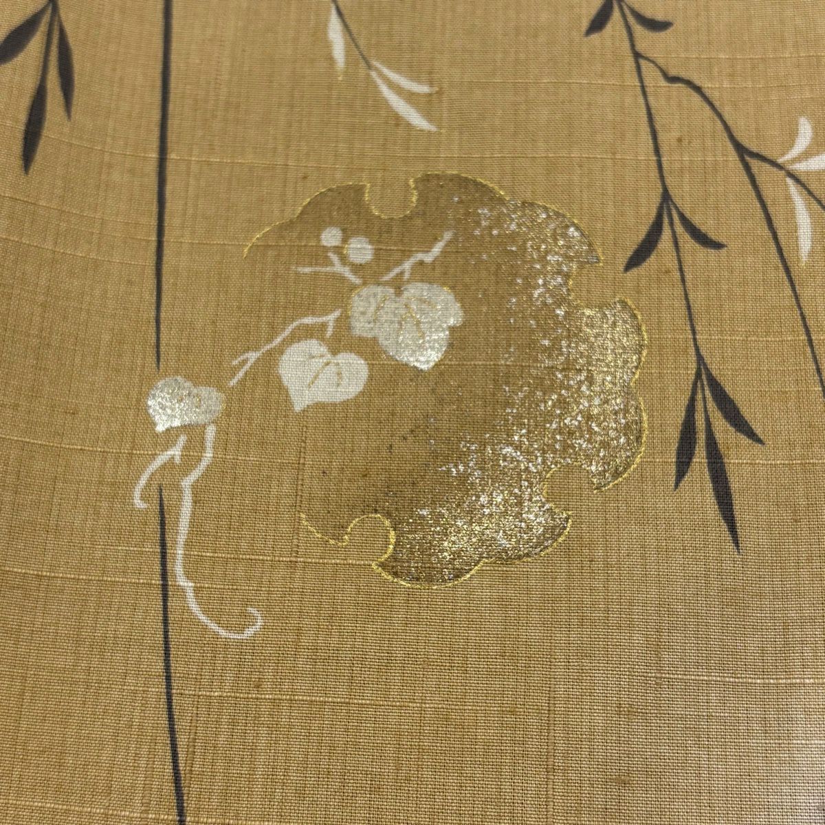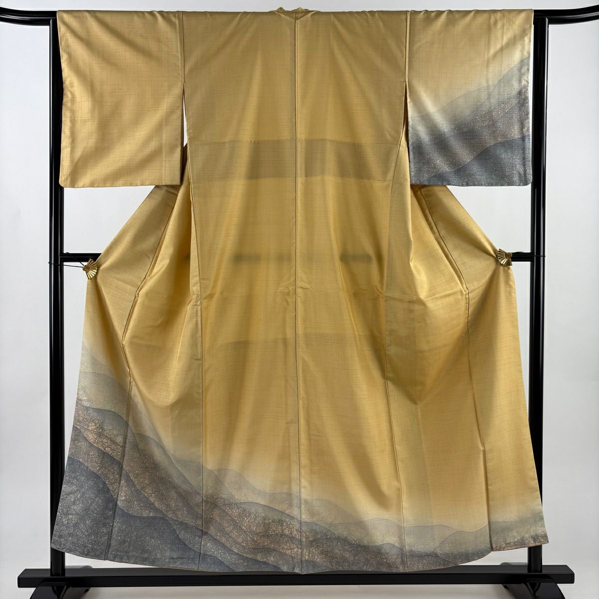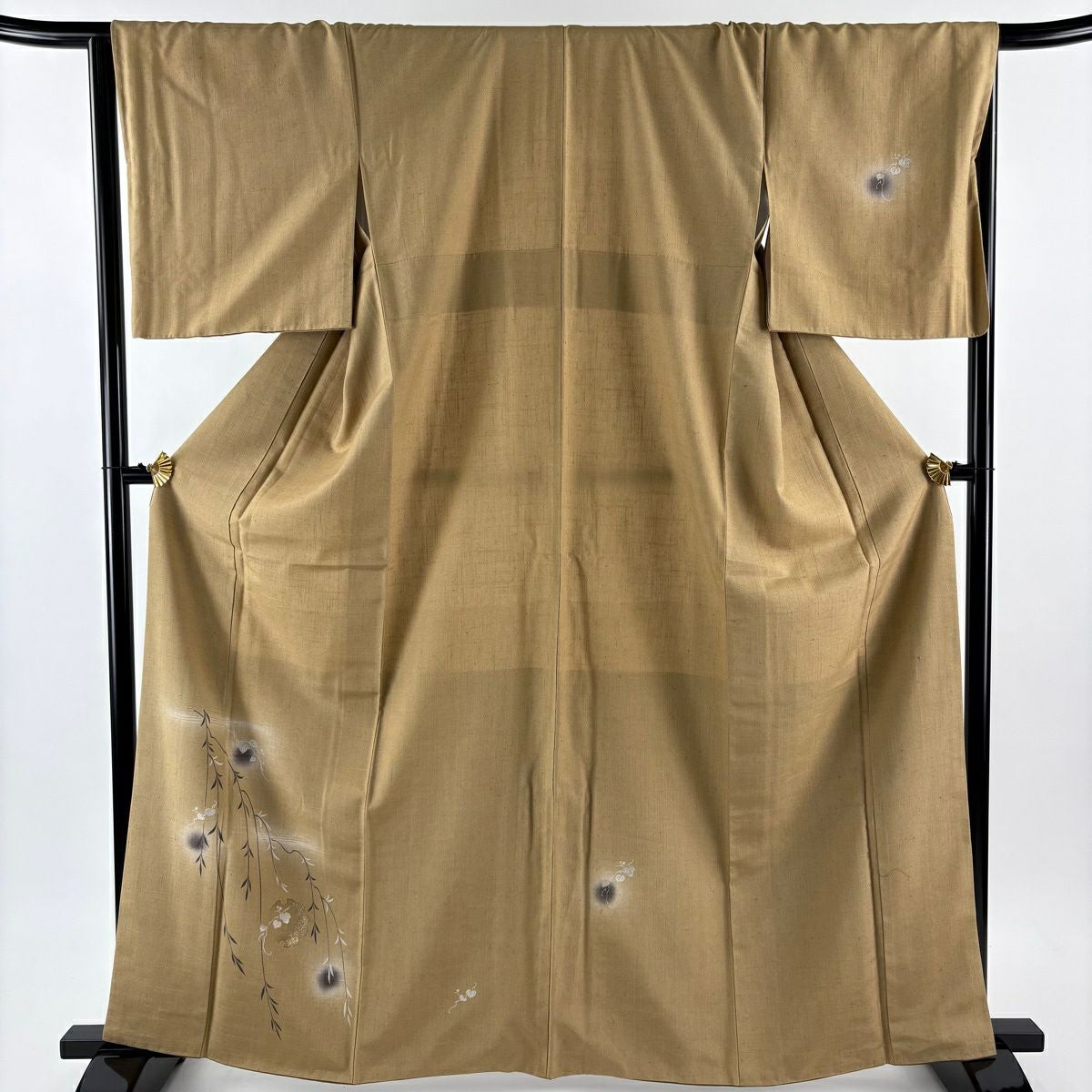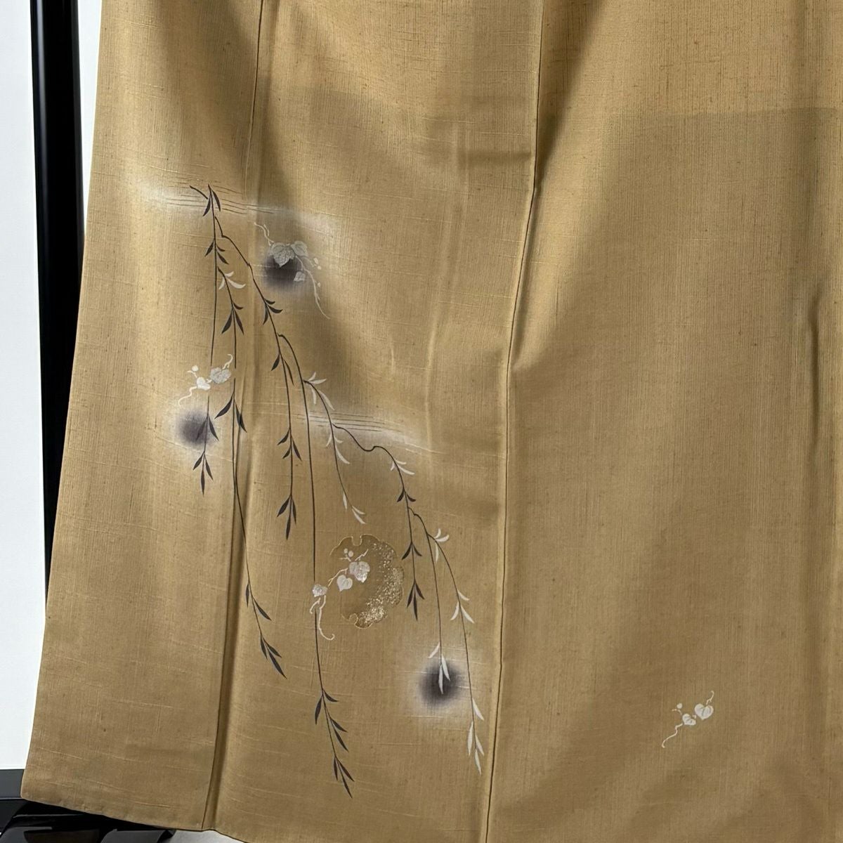 付下げ 身丈164cm 裄丈67cm M 袷 紬地 やまと 雪輪 柳 金銀彩 ぼかし 薄黄土色 正絹 秀品