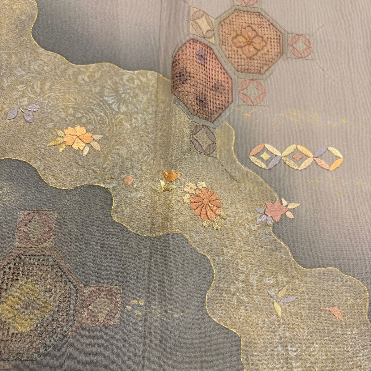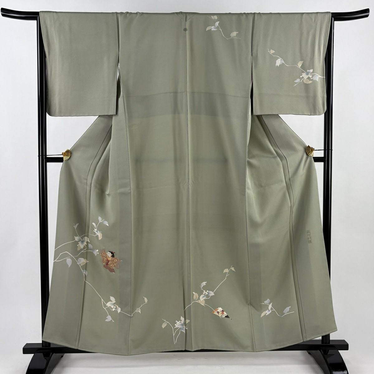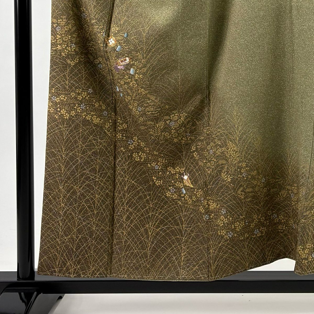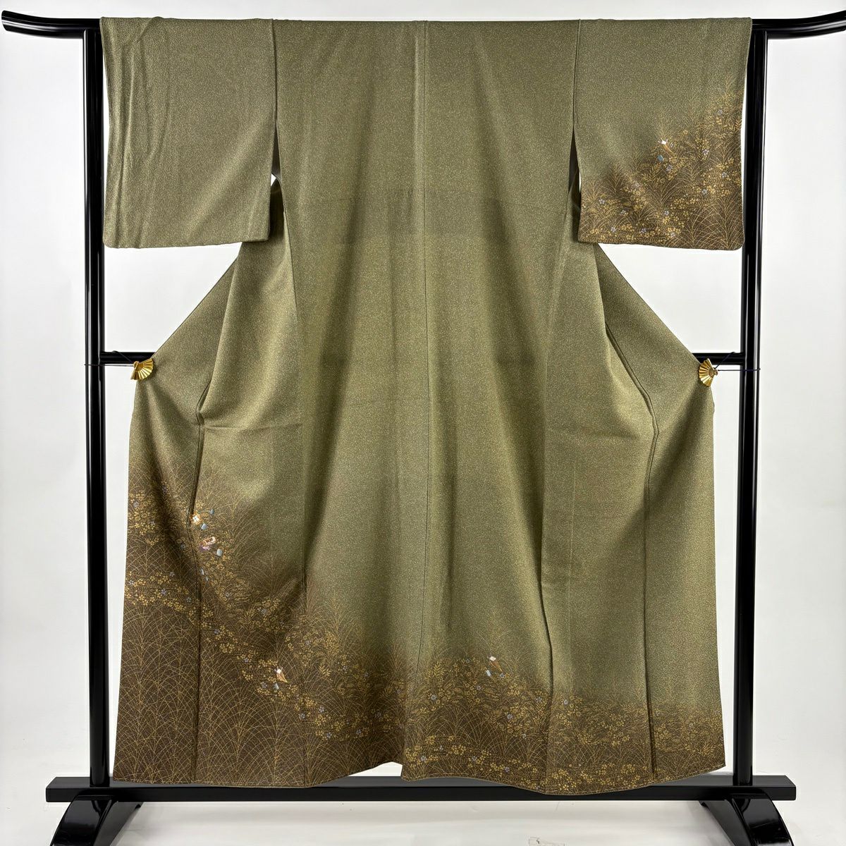 【美品】 付下げ 身丈156.5cm 裄丈63cm S 袷 宝尽くし 草花 刺繍 金銀彩 灰緑 正絹 秀品