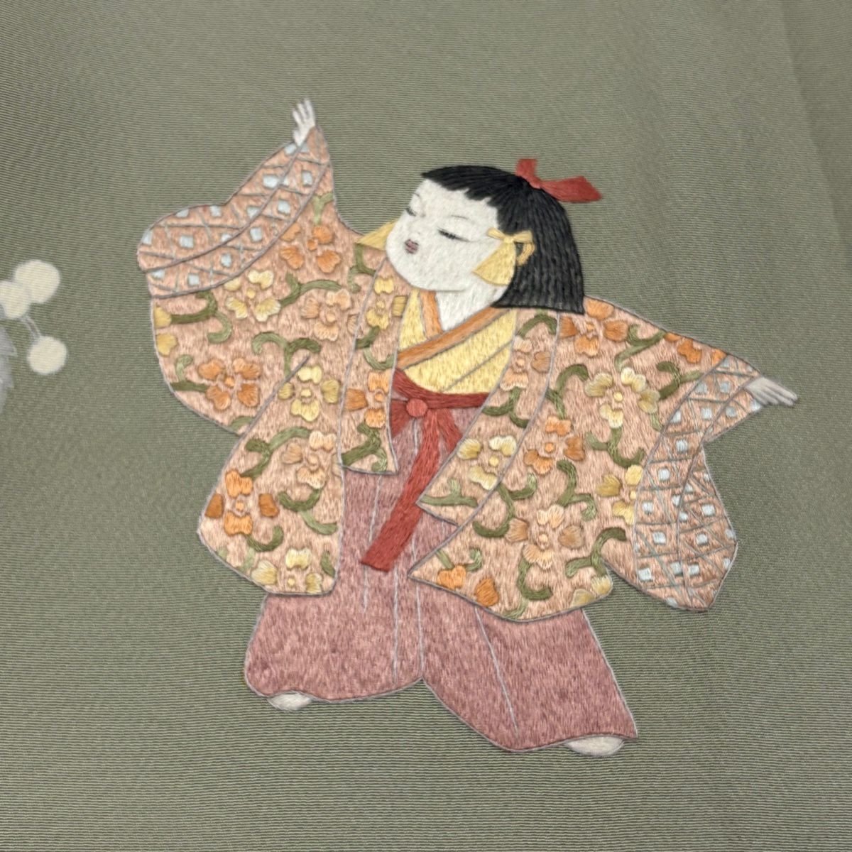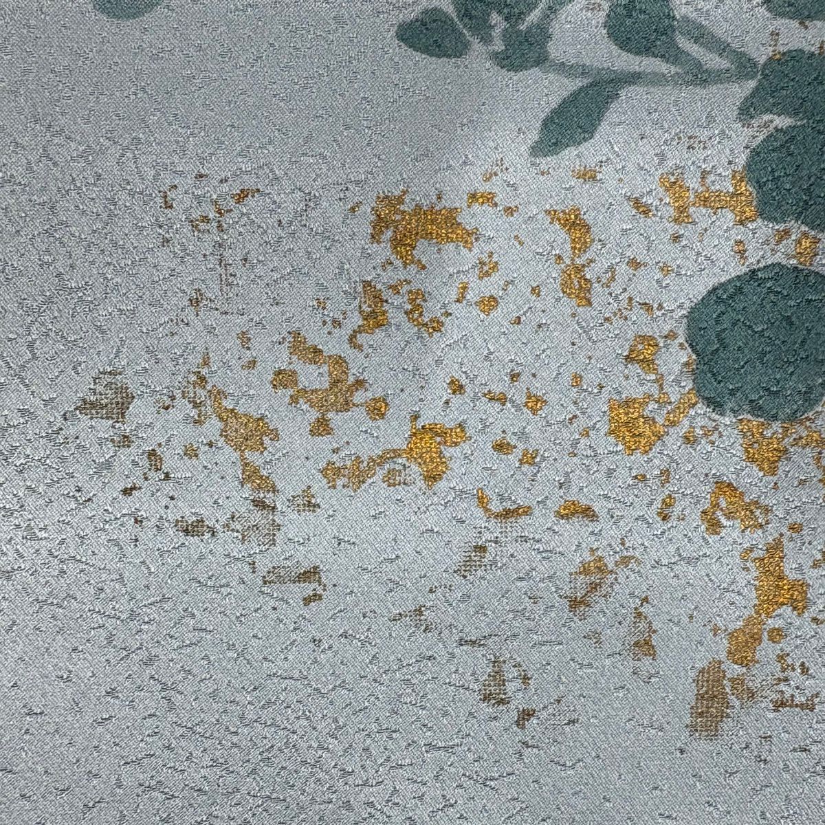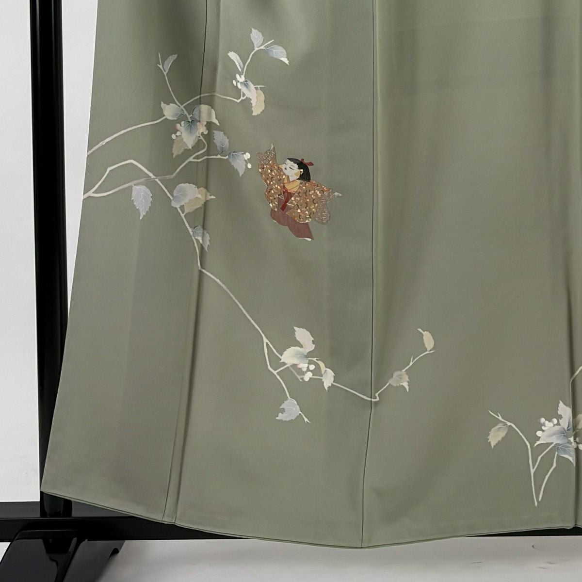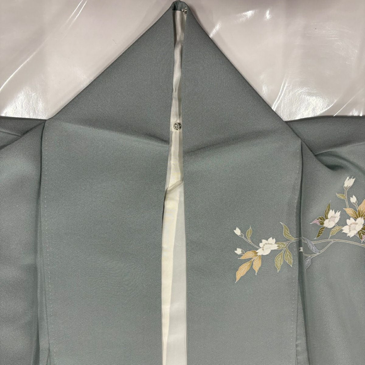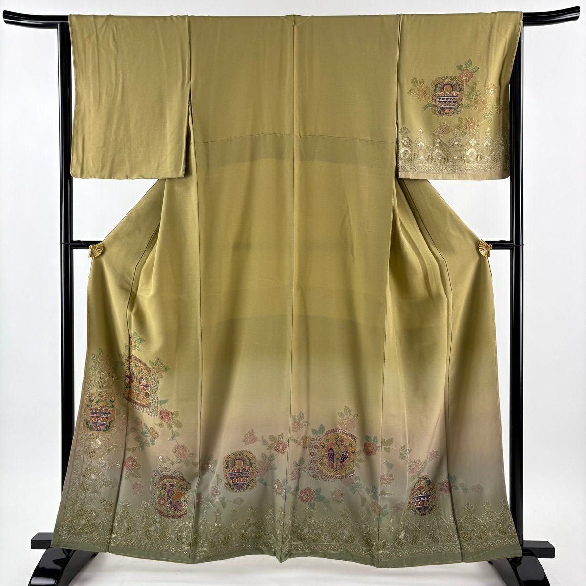 【美品】 付下げ 身丈156.5cm 裄丈63cm S 袷 宝尽くし 草花 刺繍 金銀彩 灰緑 正絹 秀品