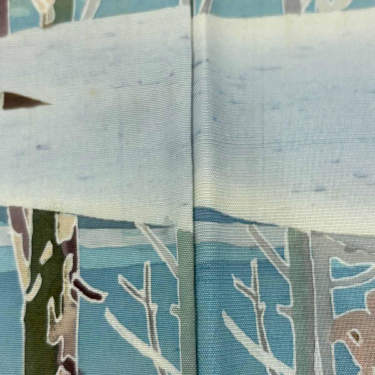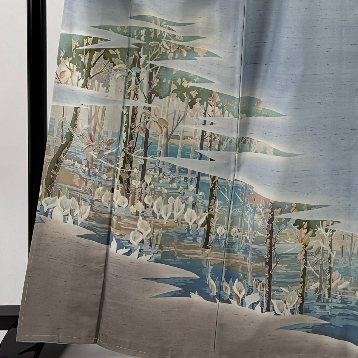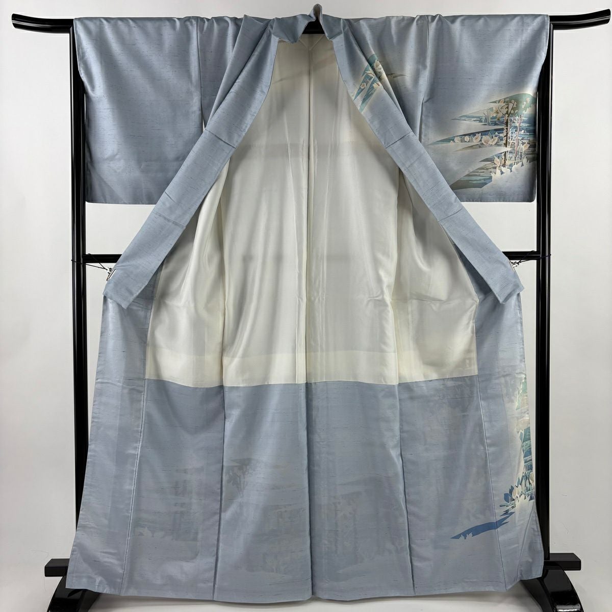 訪問着 身丈166.5cm 裄丈67.5cm L 袷 紬地 落款あり 水辺の風景 水芭蕉 ぼかし 水色 正絹 秀品
