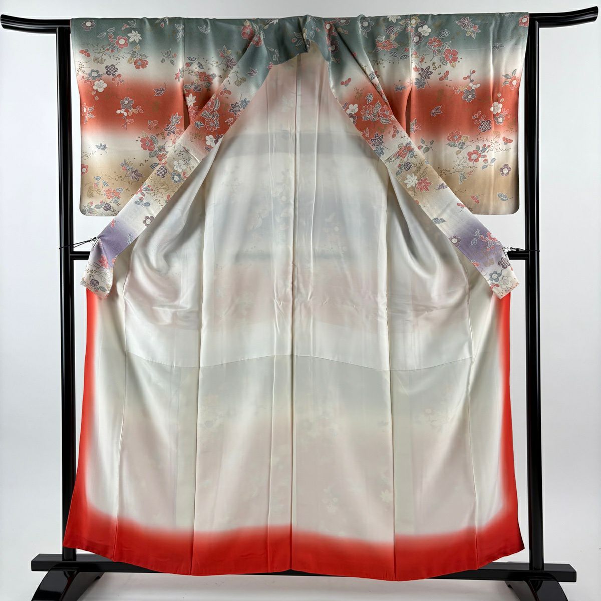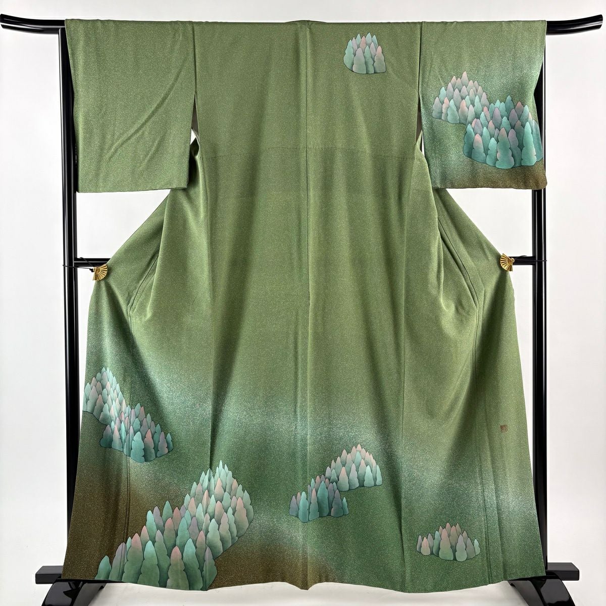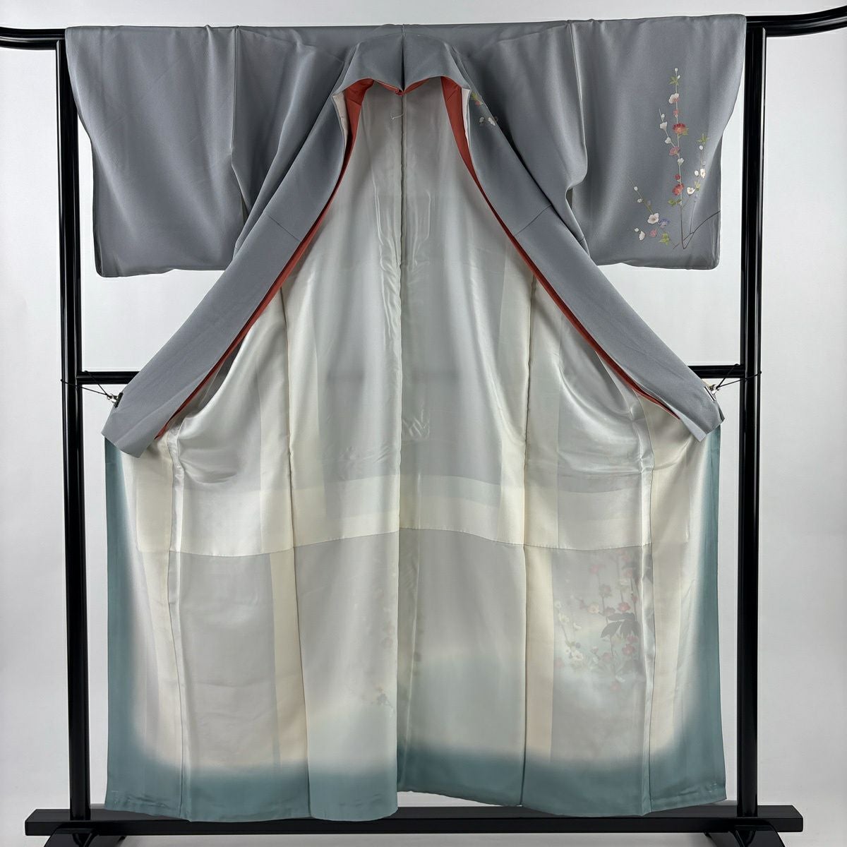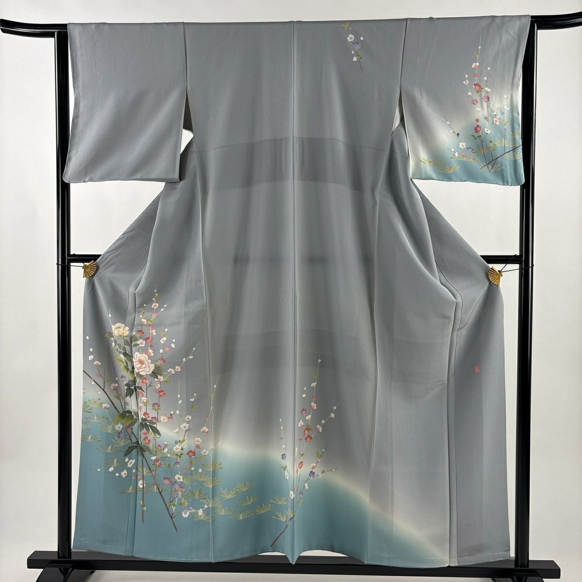 訪問着 身丈158cm 裄丈63.5cm S 袷 落款あり 枝花 若松 染め分け ぼかし 灰色 正絹 秀品