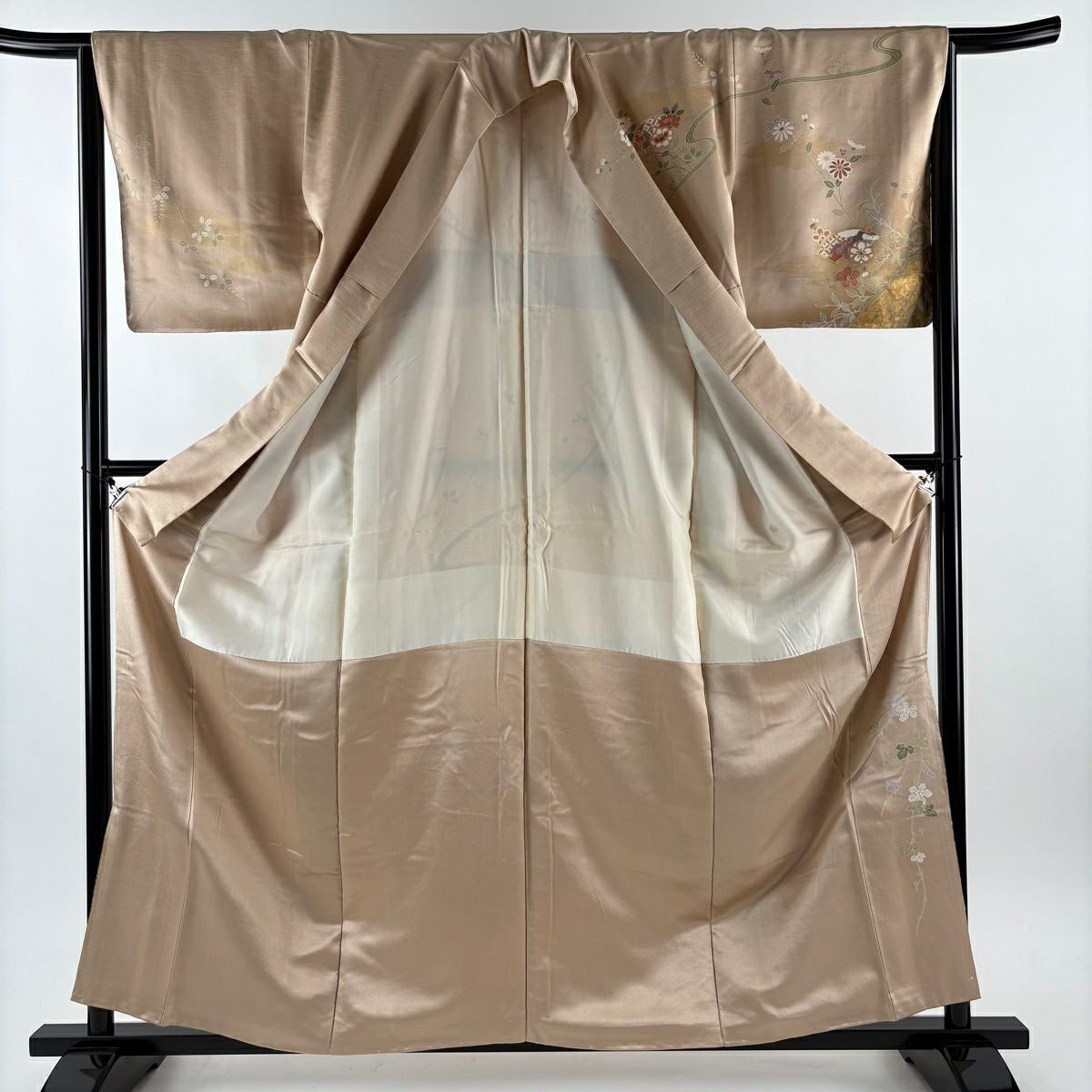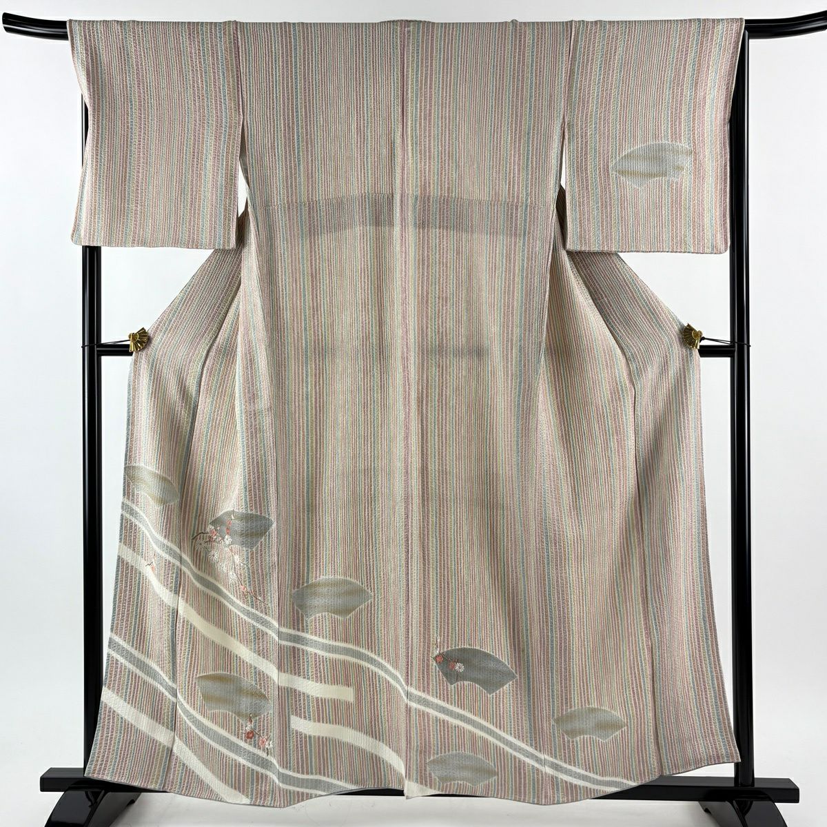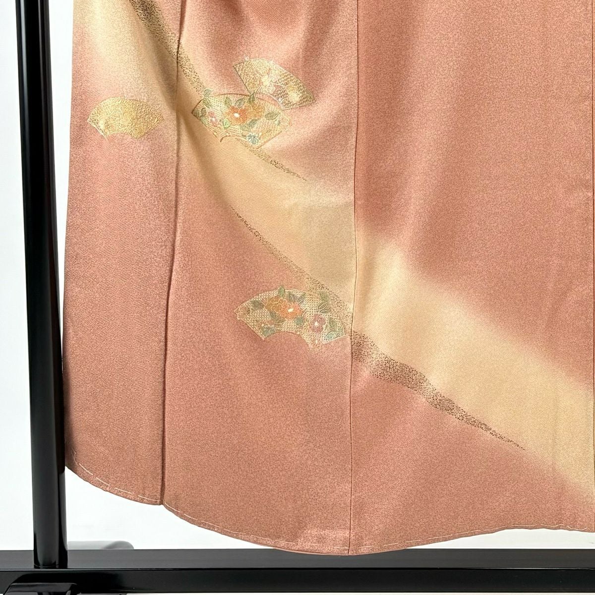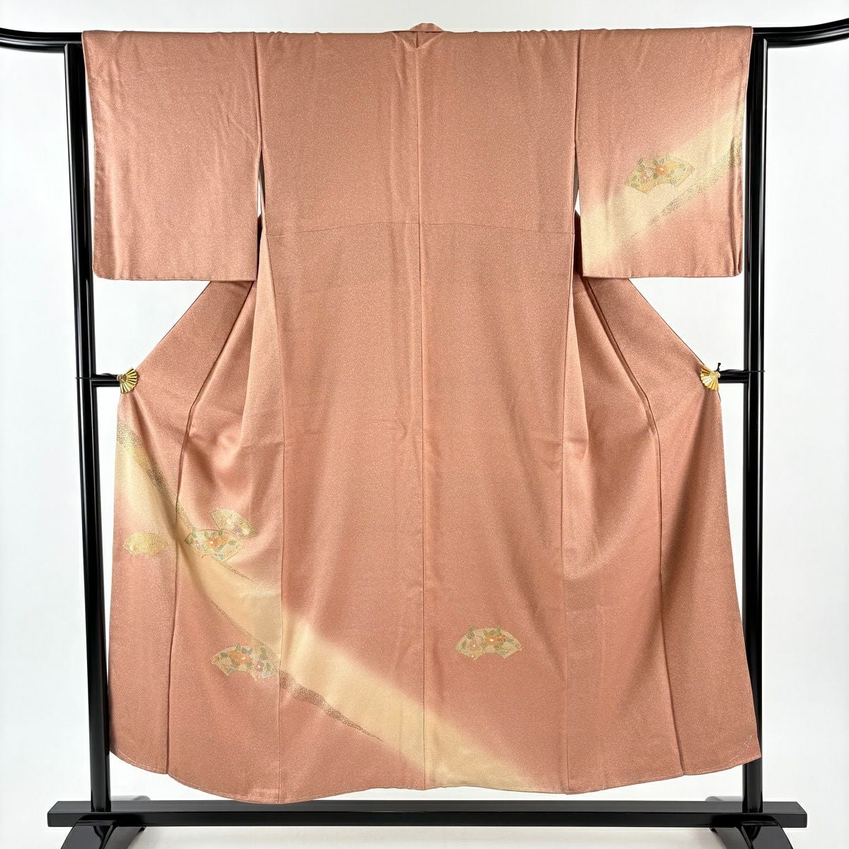 訪問着 身丈159cm 裄丈64.5cm M 袷 扇面 草花 金糸 金銀彩 ピンクベージュ 正絹 秀品