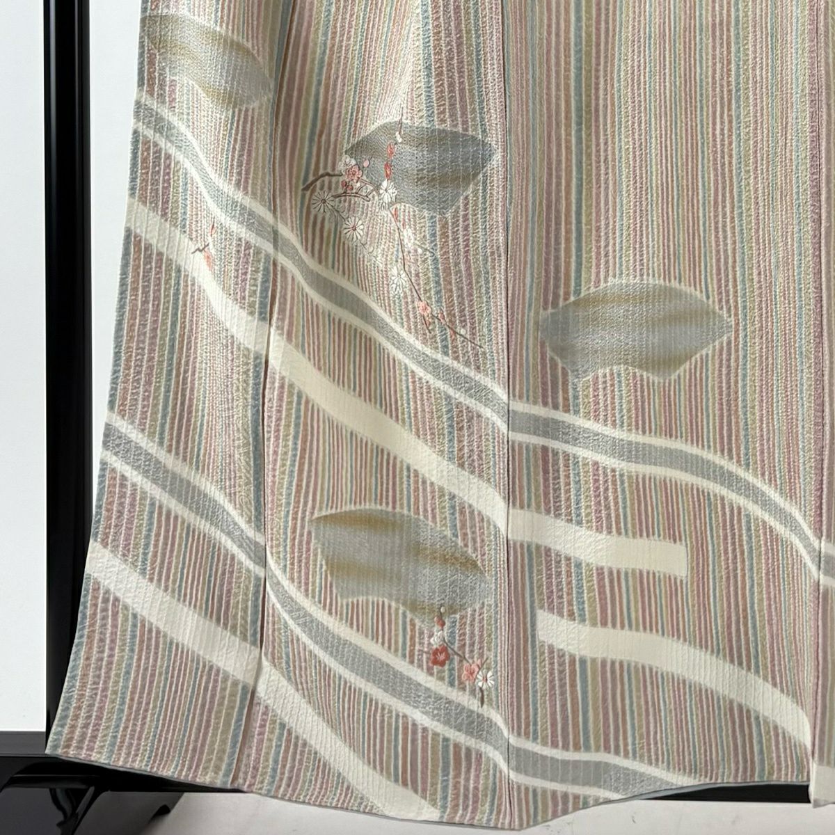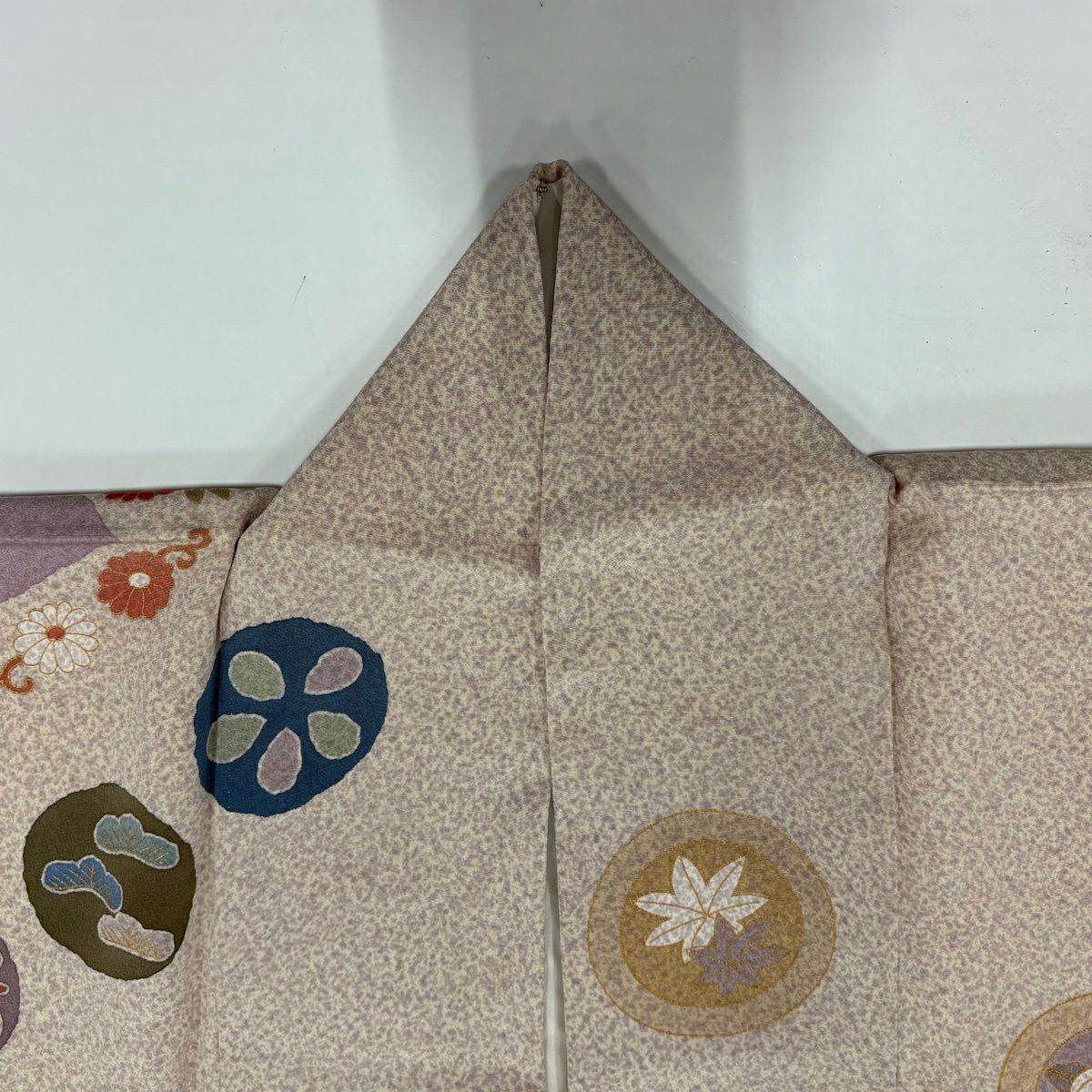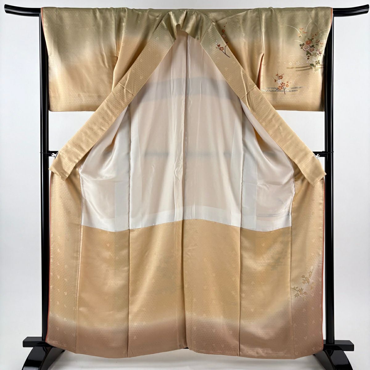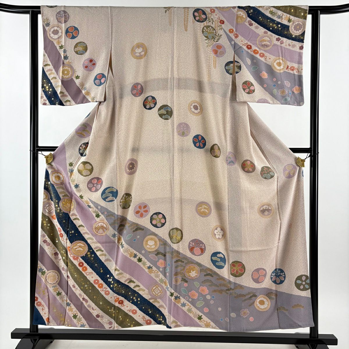 訪問着 身丈159cm 裄丈64.5cm M 袷 扇面 草花 金糸 金銀彩 ピンクベージュ 正絹 秀品