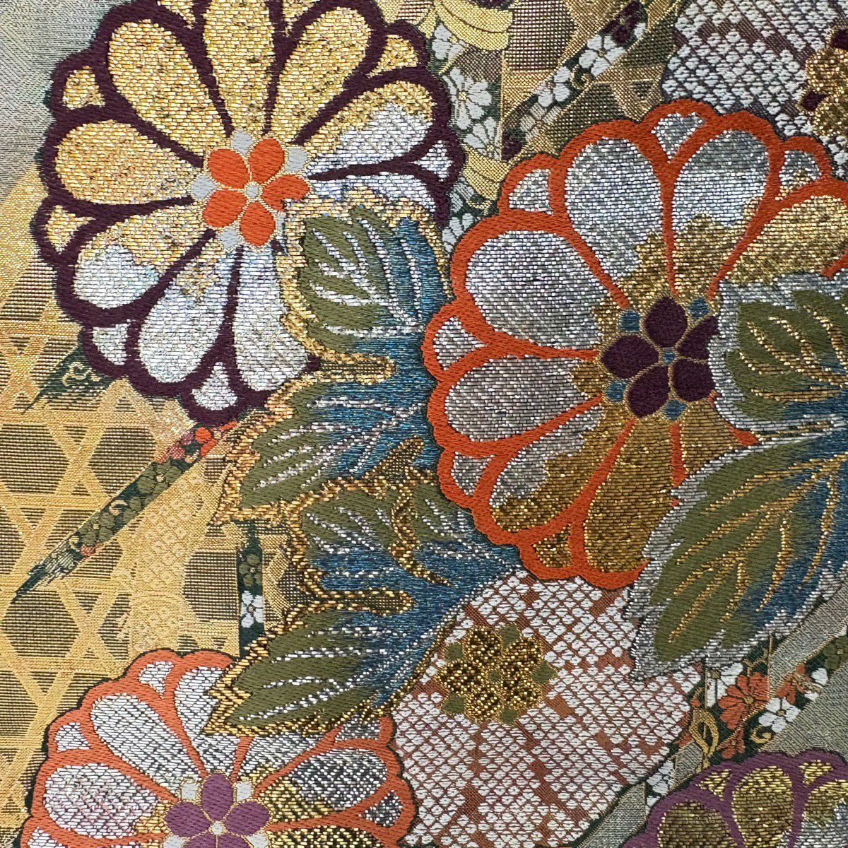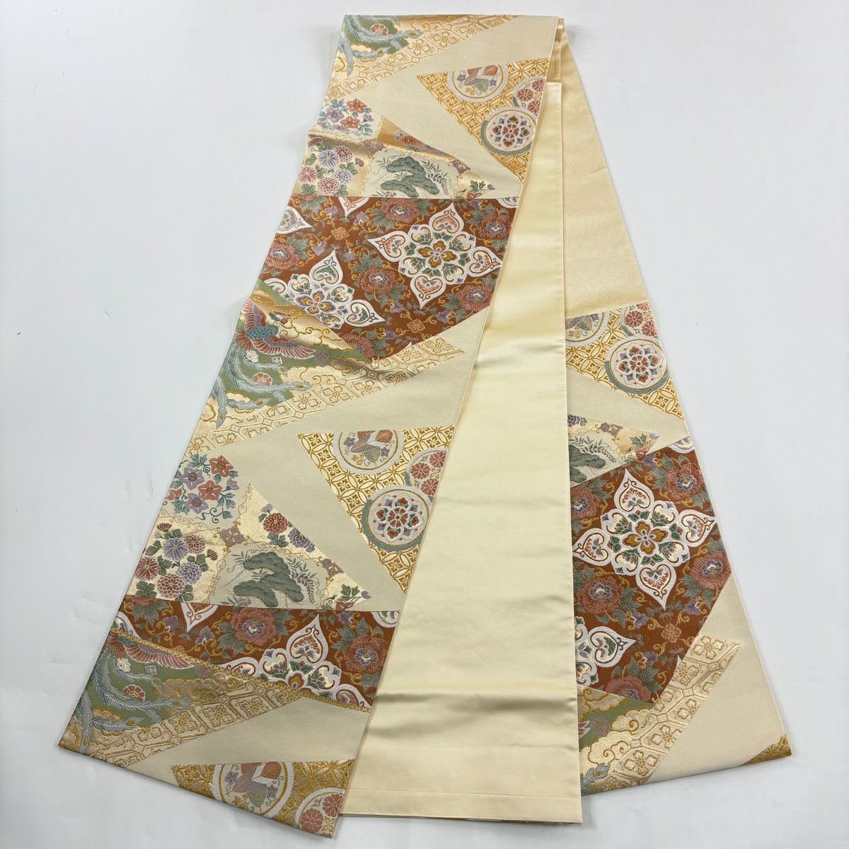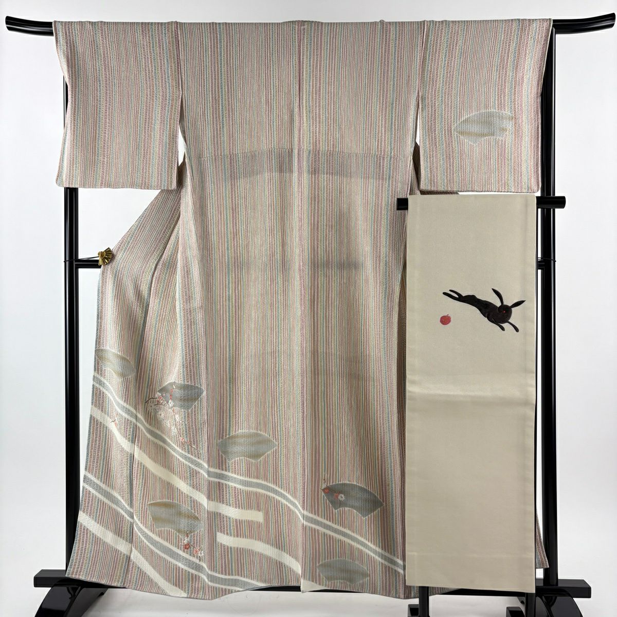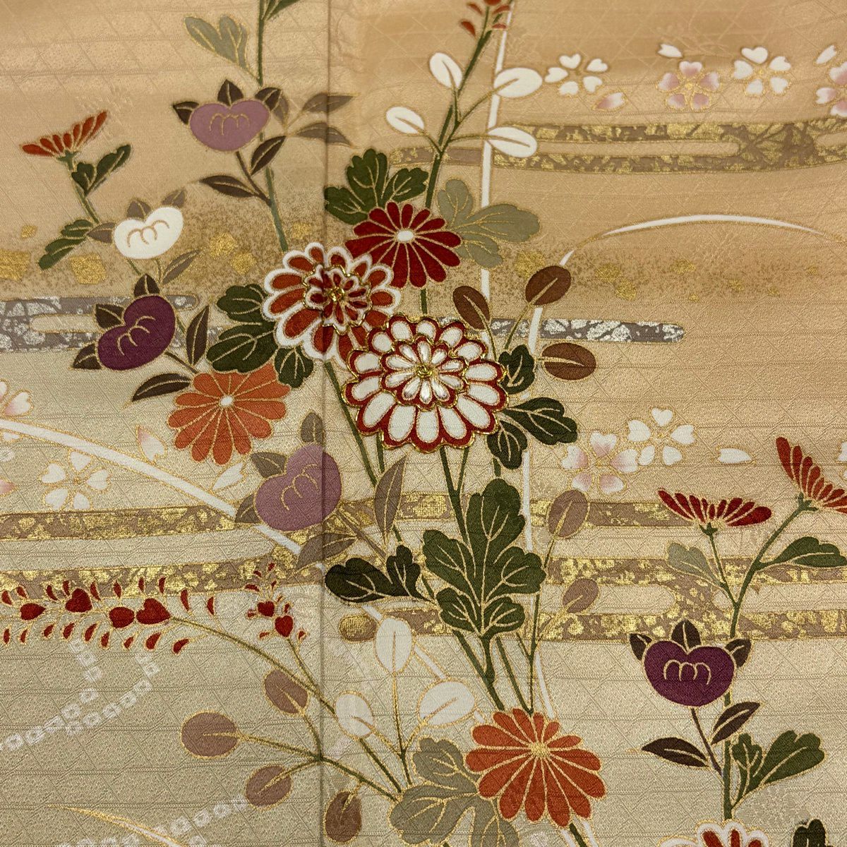 訪問着 身丈159cm 裄丈64.5cm M 袷 扇面 草花 金糸 金銀彩 ピンクベージュ 正絹 秀品
