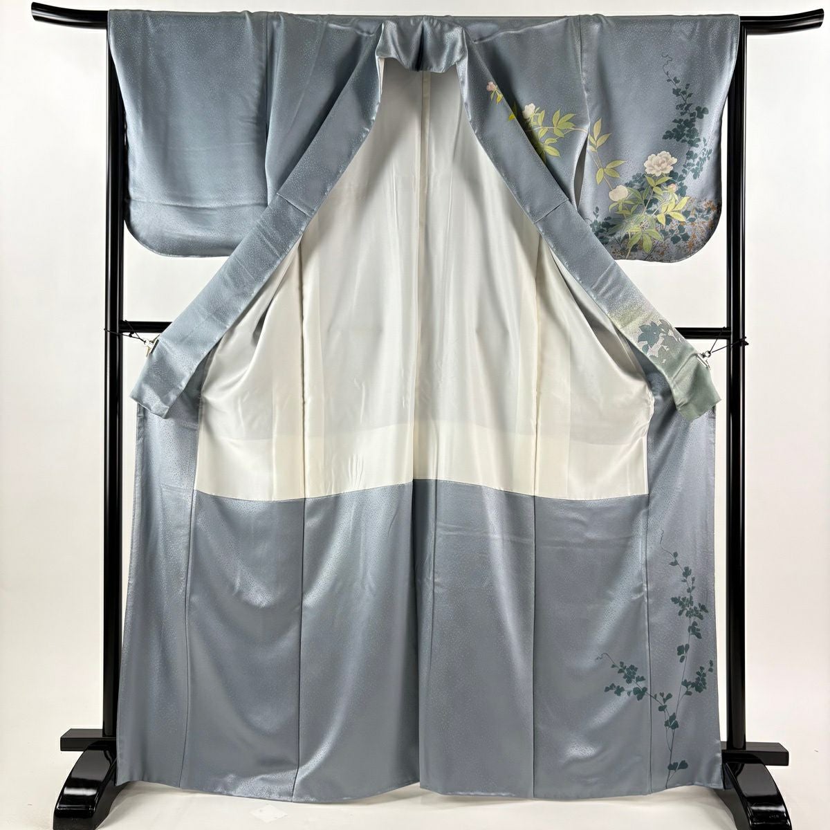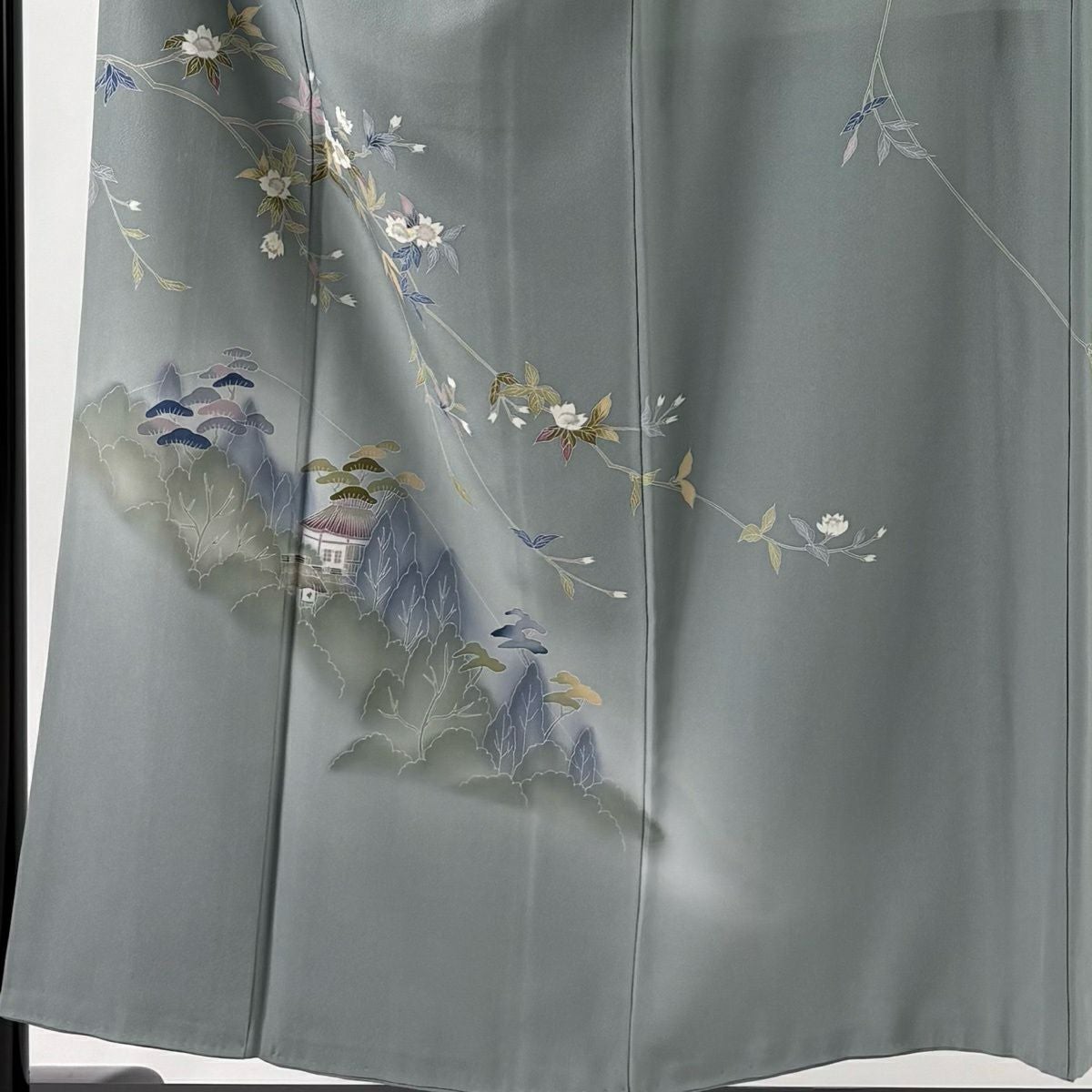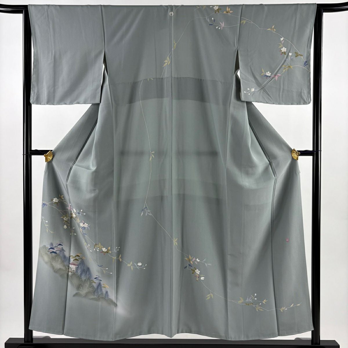 訪問着 身丈153.5cm 裄丈64cm M 袷 落款あり 枝花 家屋 ぼかし 青灰色 正絹 秀品 一つ紋