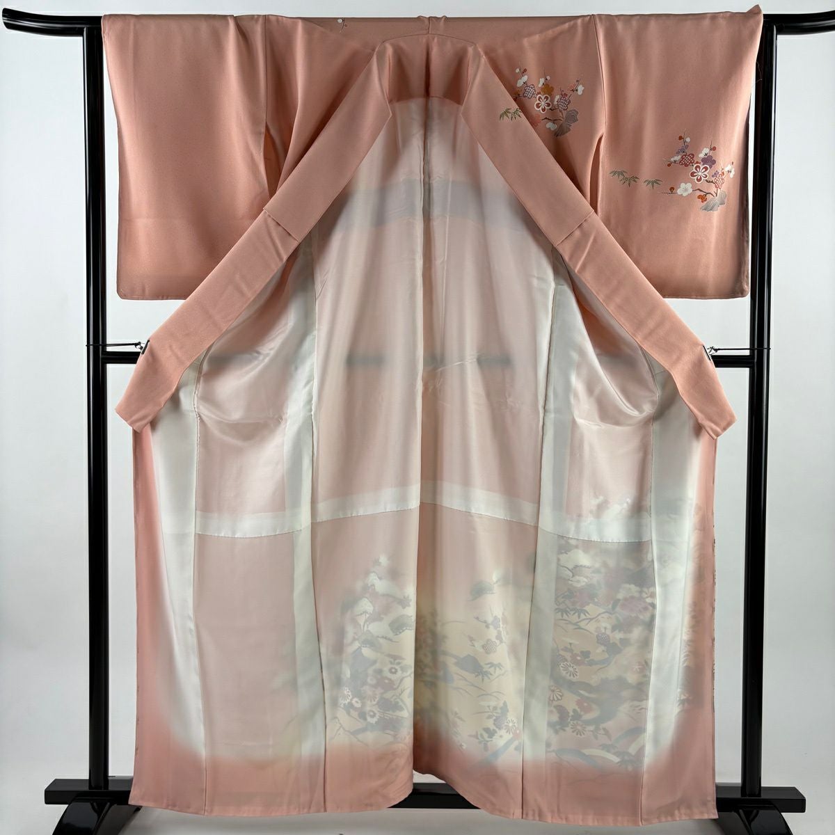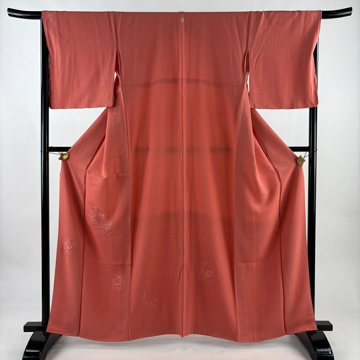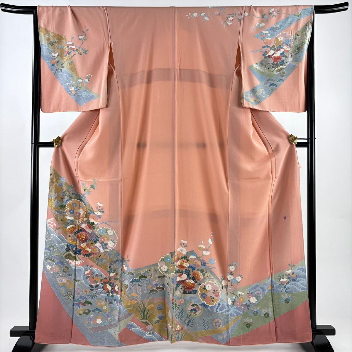 訪問着 身丈164cm 裄丈67cm M 袷 落款あり 雪輪 菊 金糸 金銀彩 サーモンピンク 正絹 秀品