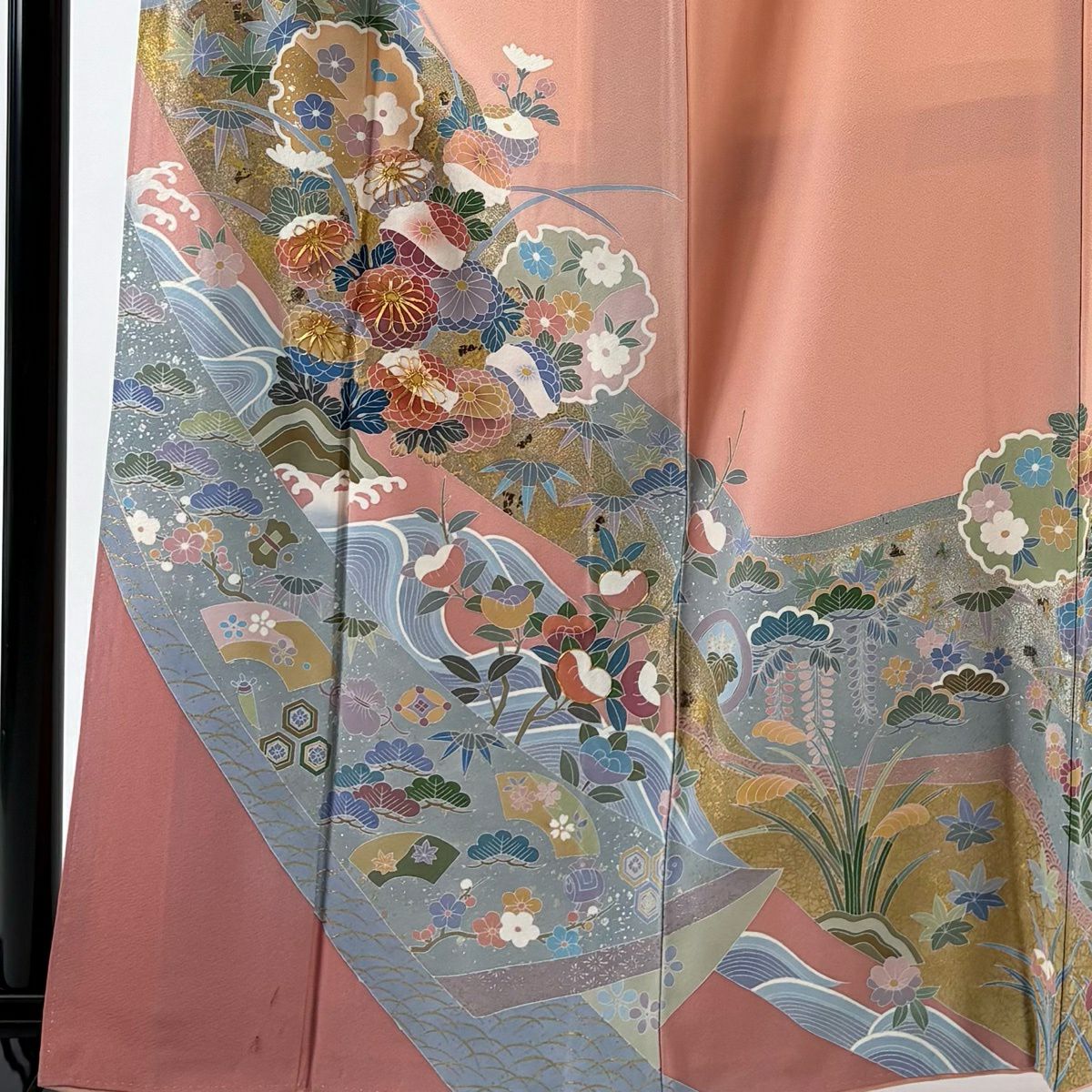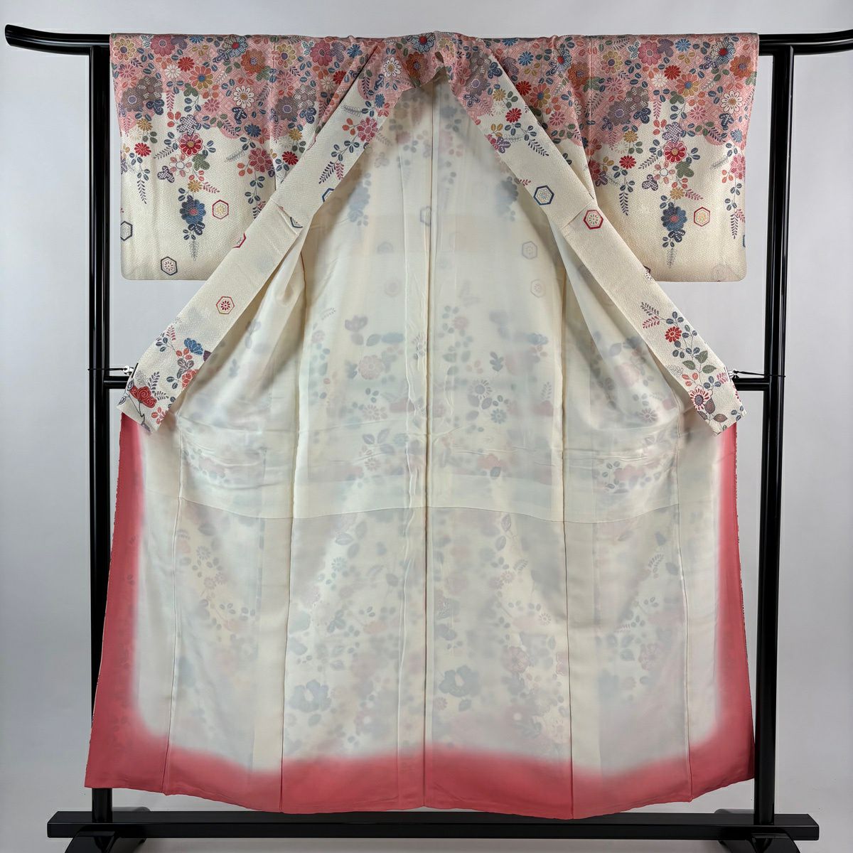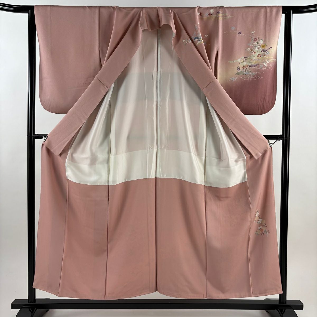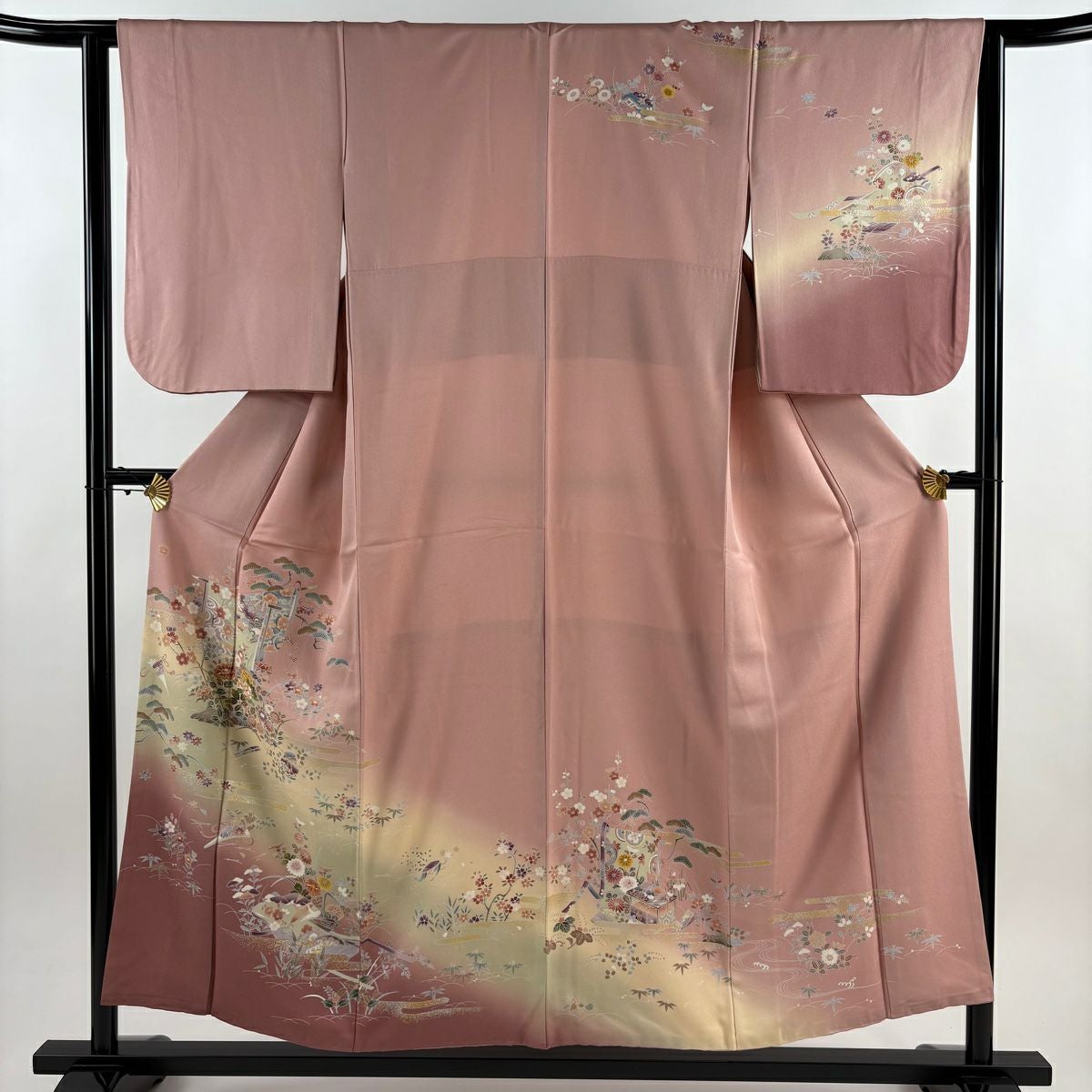 【在庫一掃】 訪問着 身丈154cm 裄丈63cm S 袷 誰が袖 草花 金糸 金銀彩 ピンク 正絹 秀品
