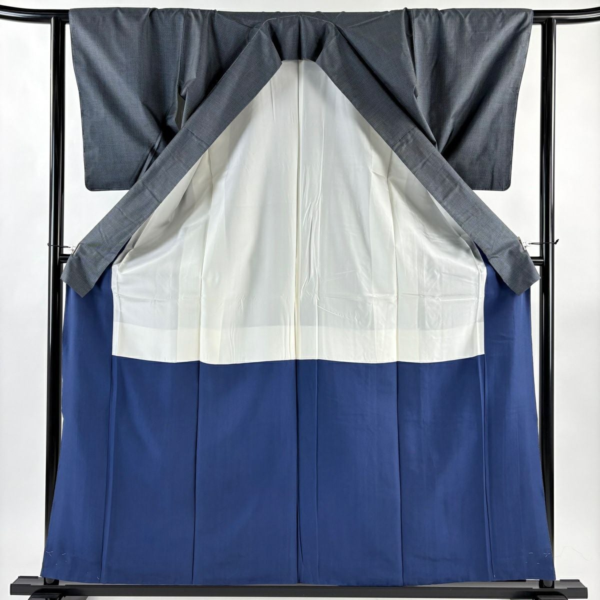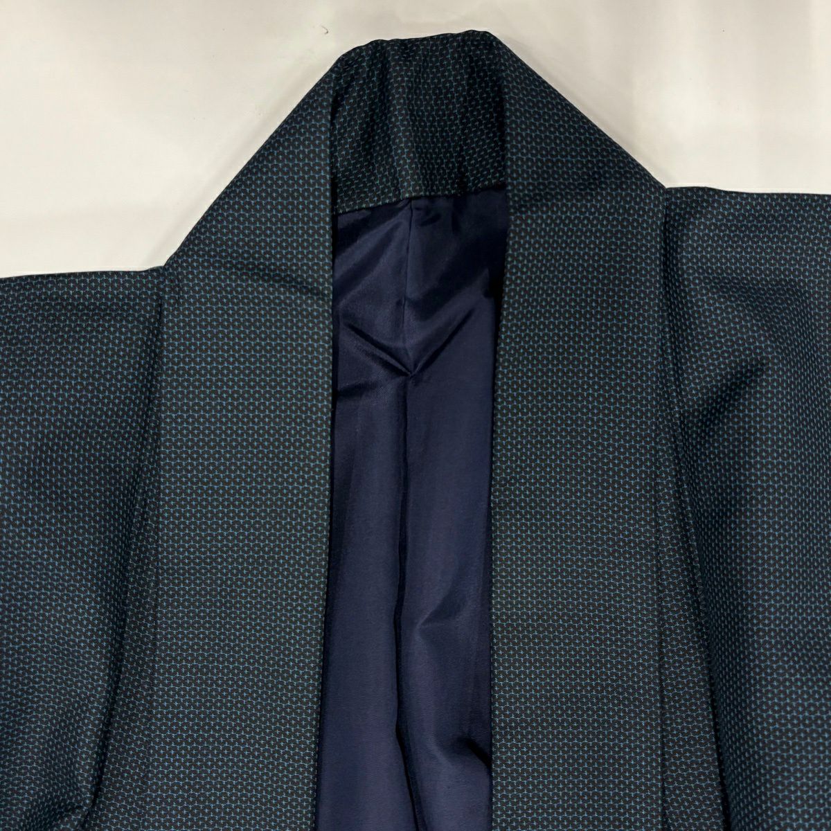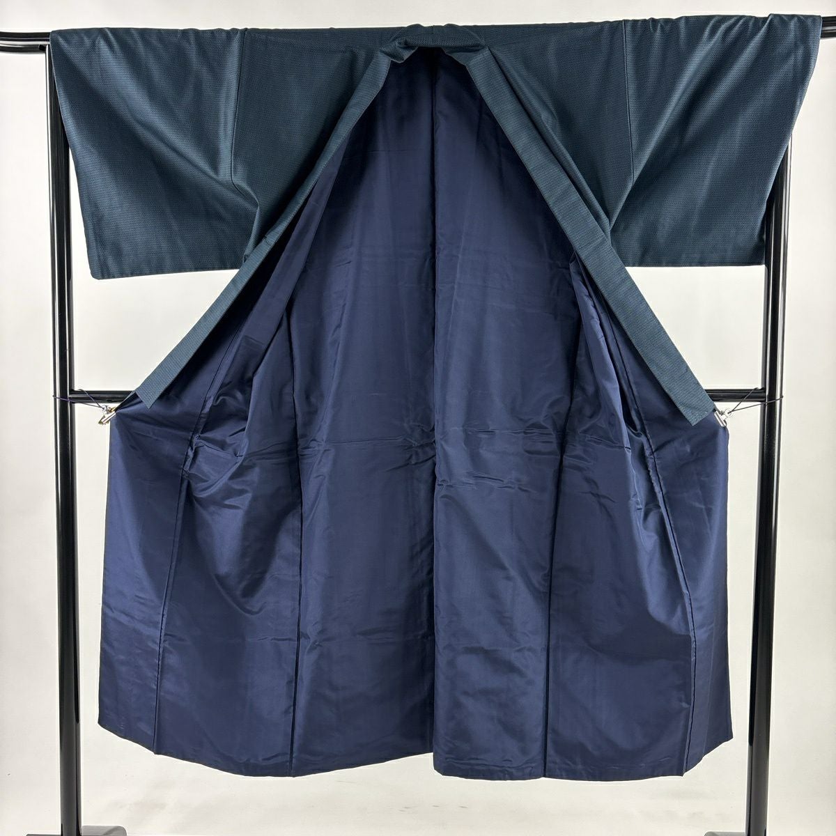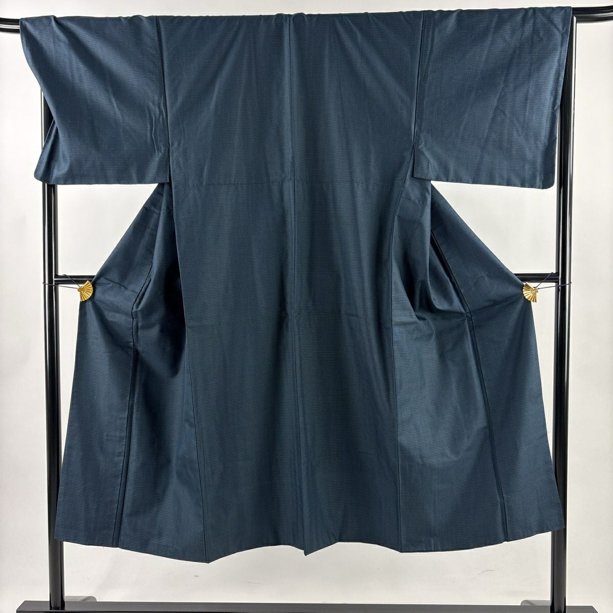 【美品】 男着物 身丈140.5cm 裄丈69cm S 袷 アンサンブル 紬地 幾何学 紺色 正絹 秀品
