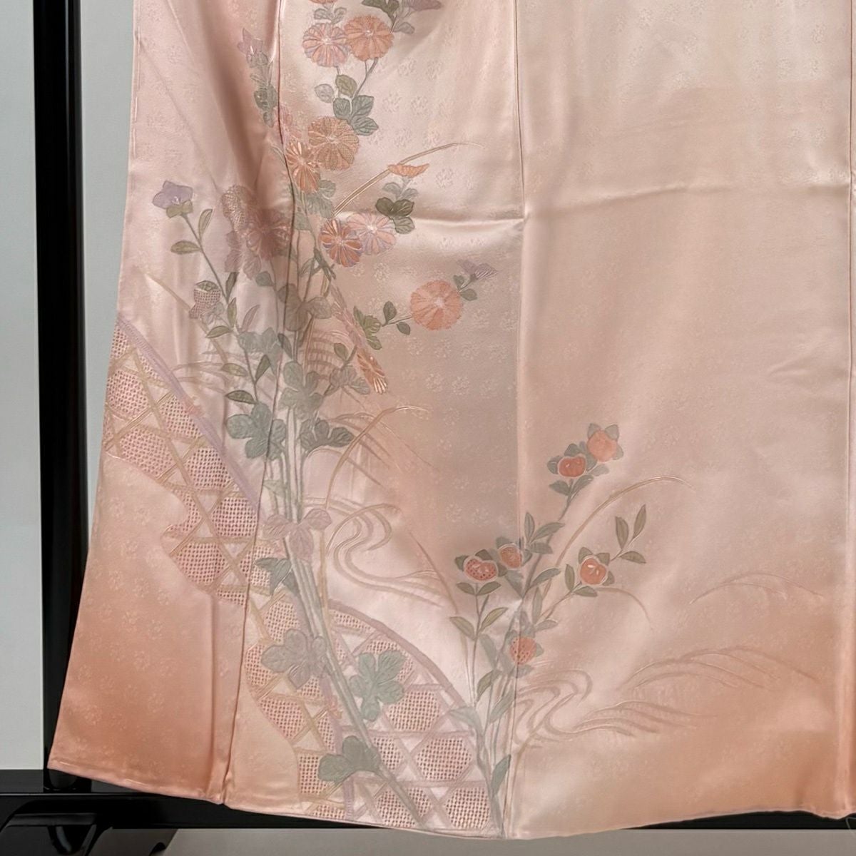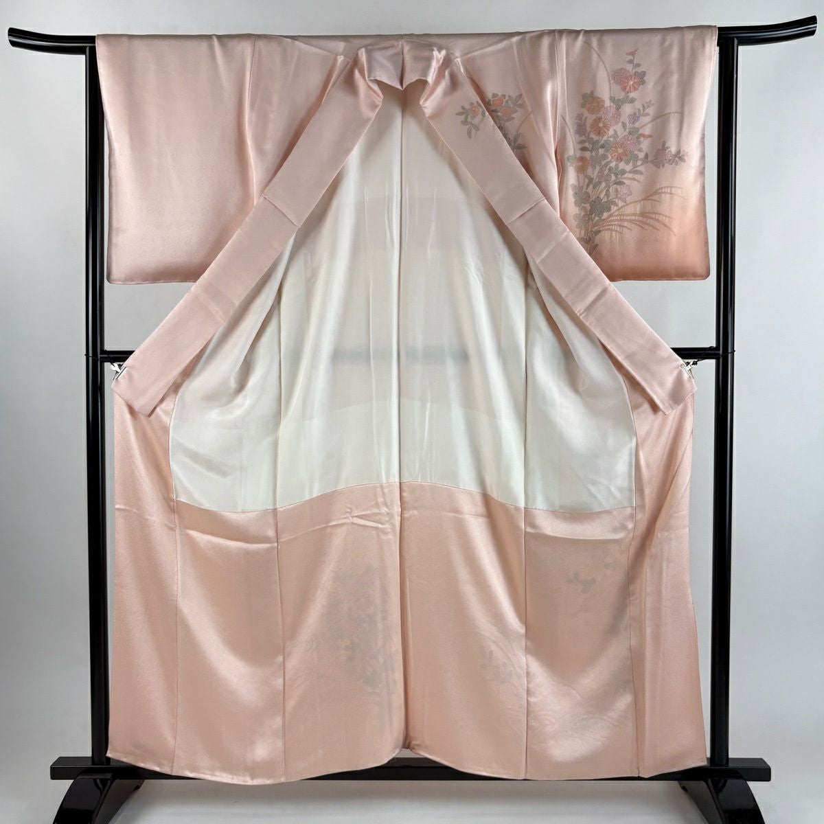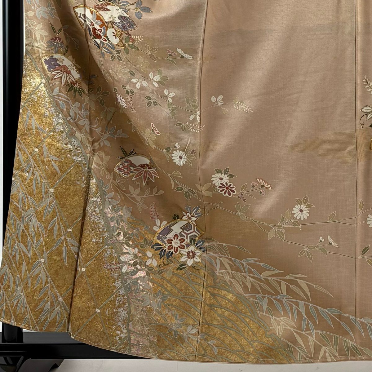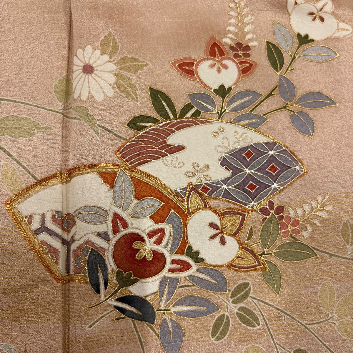 付下げ 身丈152.5cm 裄丈64cm M 袷 扇面 草花 金彩 刺繍 ピンクベージュ 正絹 秀品