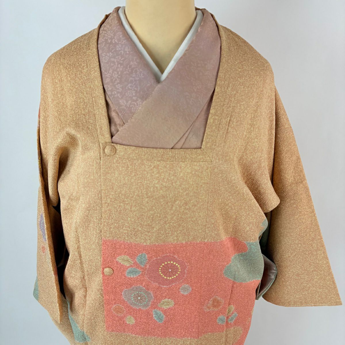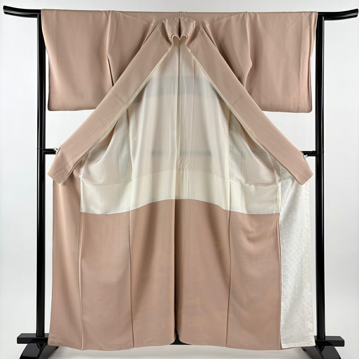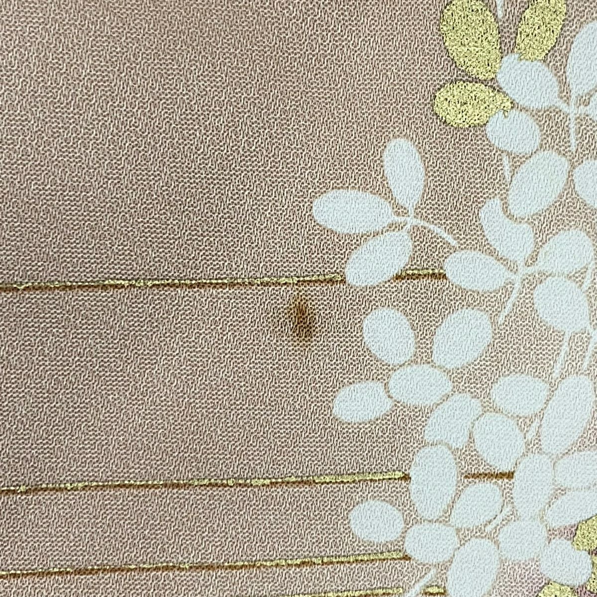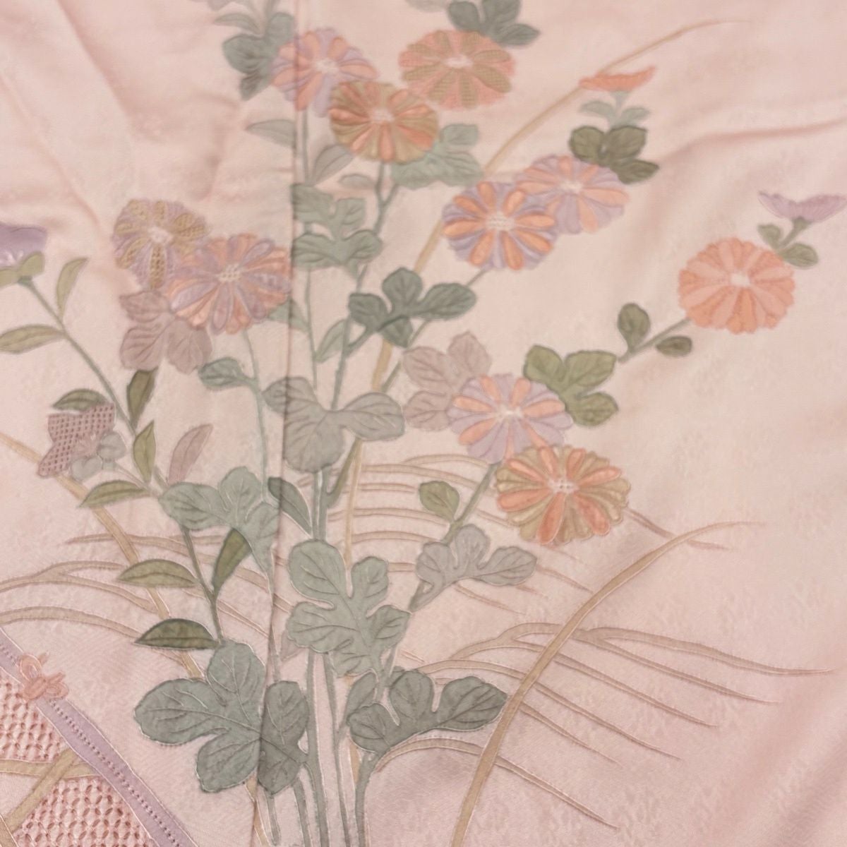 付下げ 身丈152.5cm 裄丈64cm M 袷 扇面 草花 金彩 刺繍 ピンクベージュ 正絹 秀品