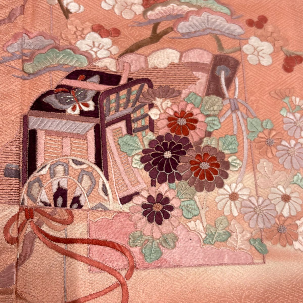 【美品】 付下げ 身丈159cm 裄丈62.5cm S 袷 御所車 草花 刺繍 銀糸 ピンク 正絹 秀品