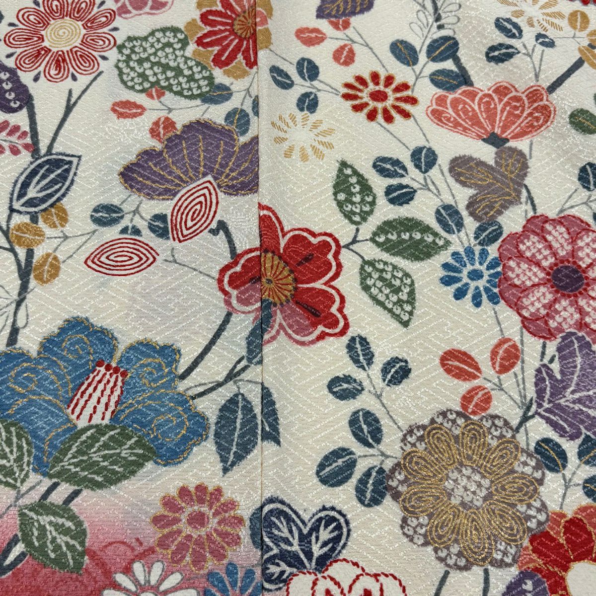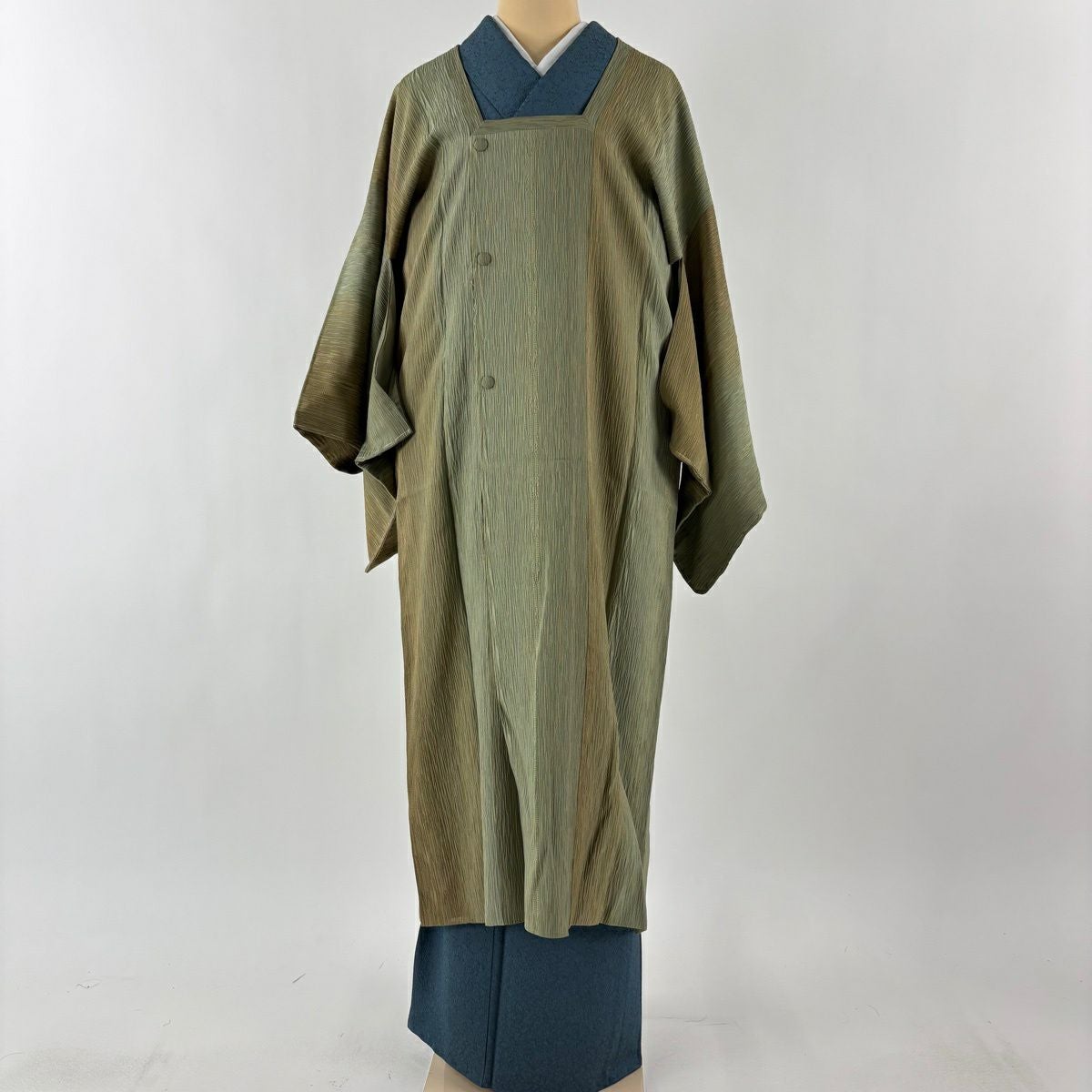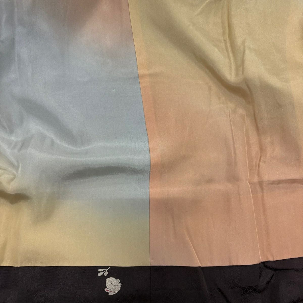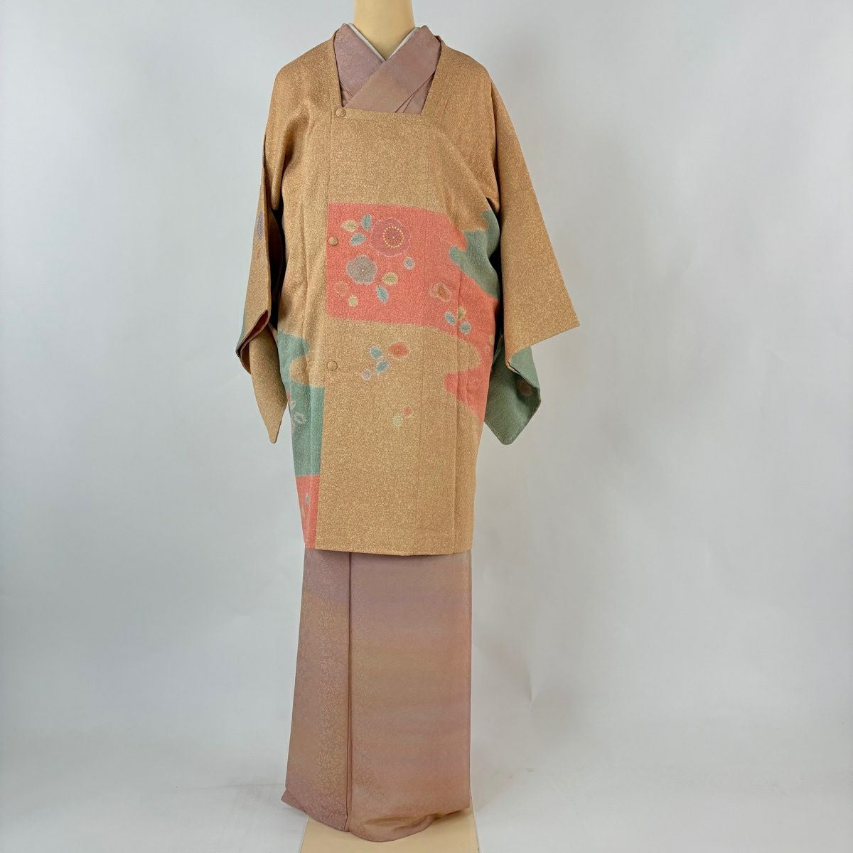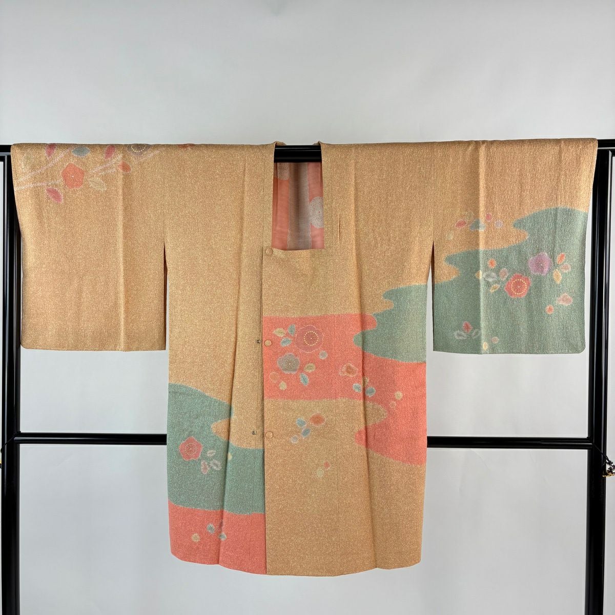 道行 身丈92cm 裄丈66cm M 和装コート 角衿 草花 霞 金彩 染め分け ベージュ 正絹 秀品