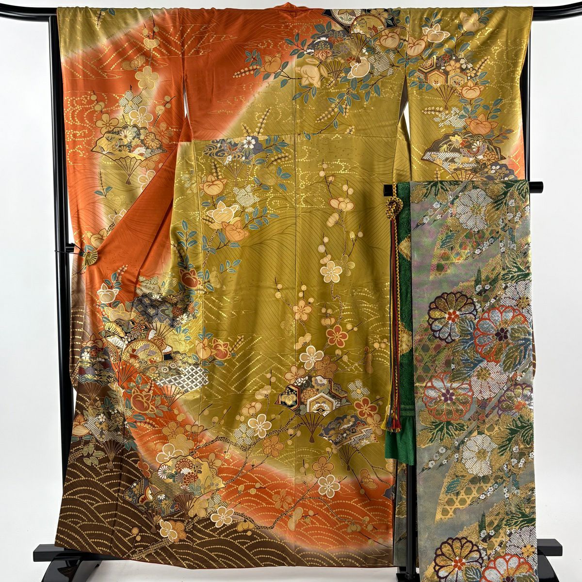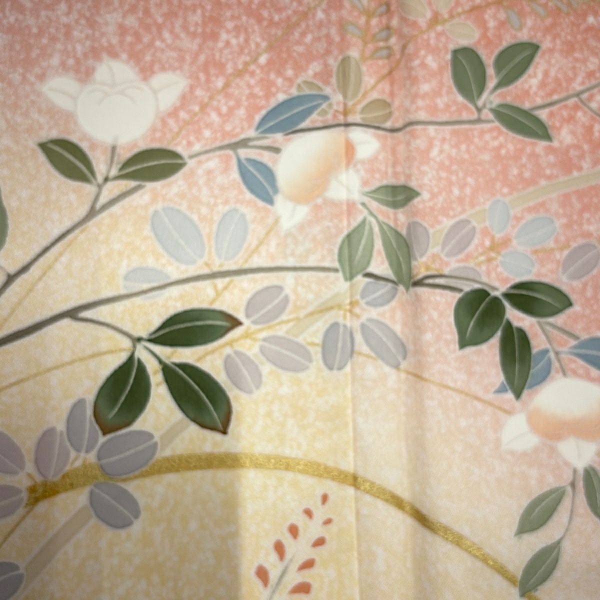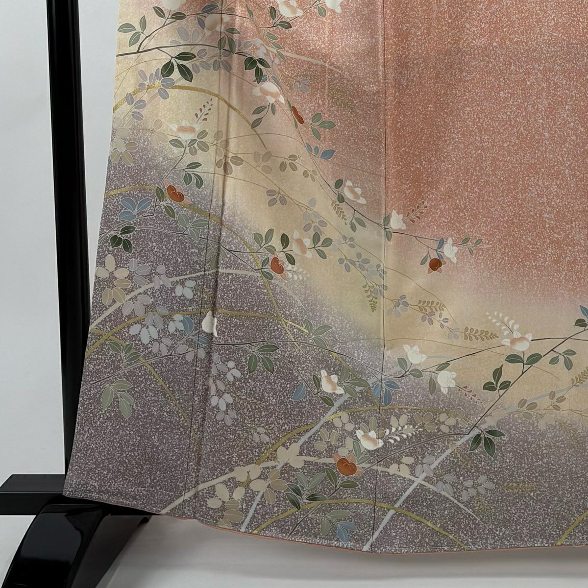 訪問着 身丈162.5cm 裄丈67cm M 袷 やまと 草花 ヱ霞 金糸 金銀彩 薄オレンジ 正絹 秀品