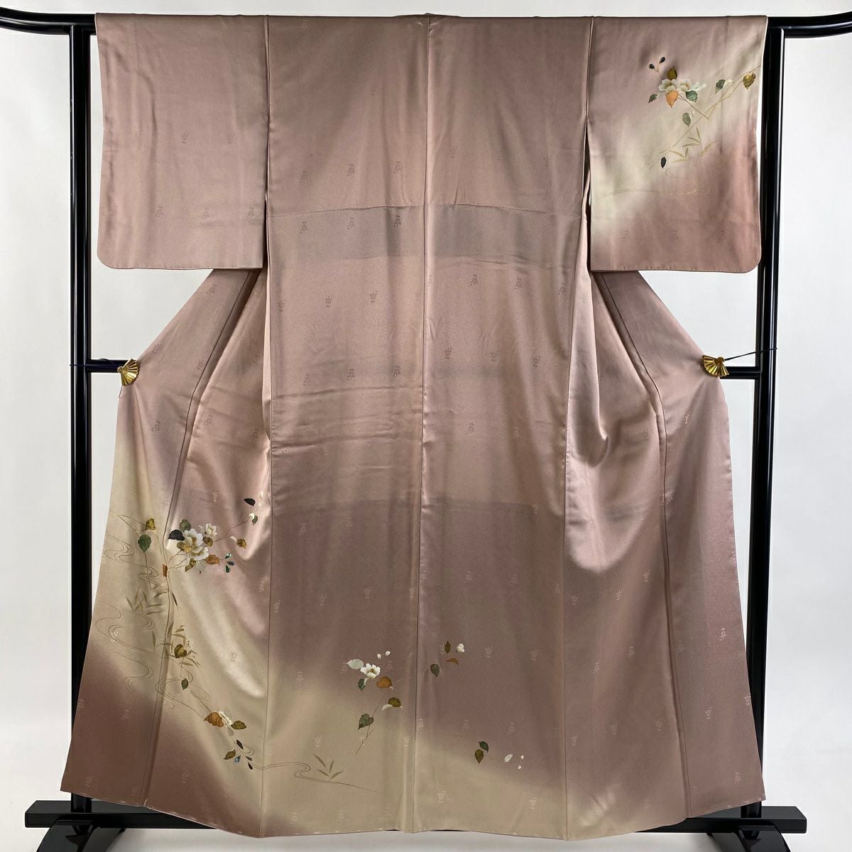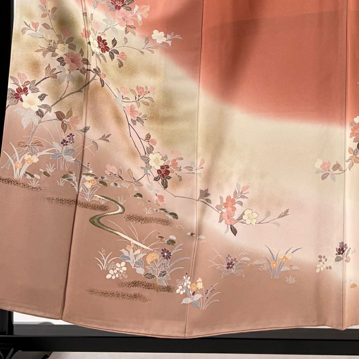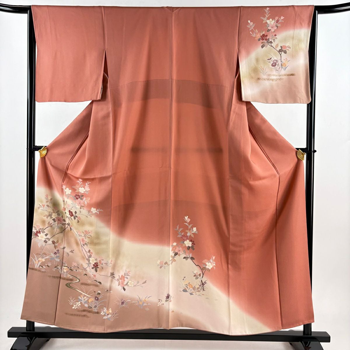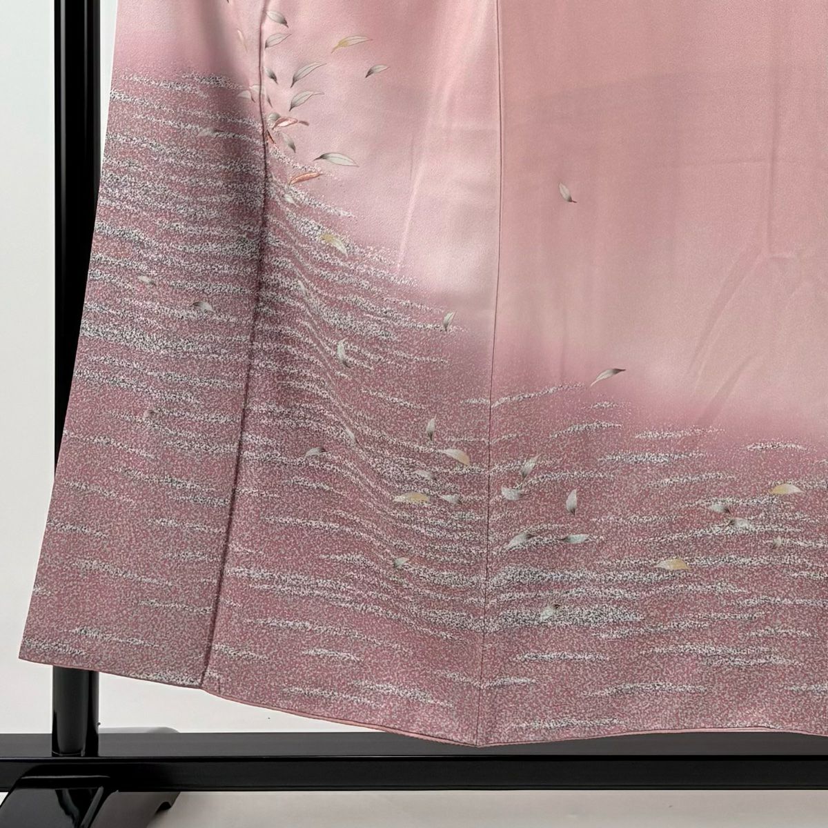【在庫一掃】 訪問着 身丈156cm 裄丈64cm M 袷 草花 流水 金彩 ぼかし ピンク 正絹 秀品