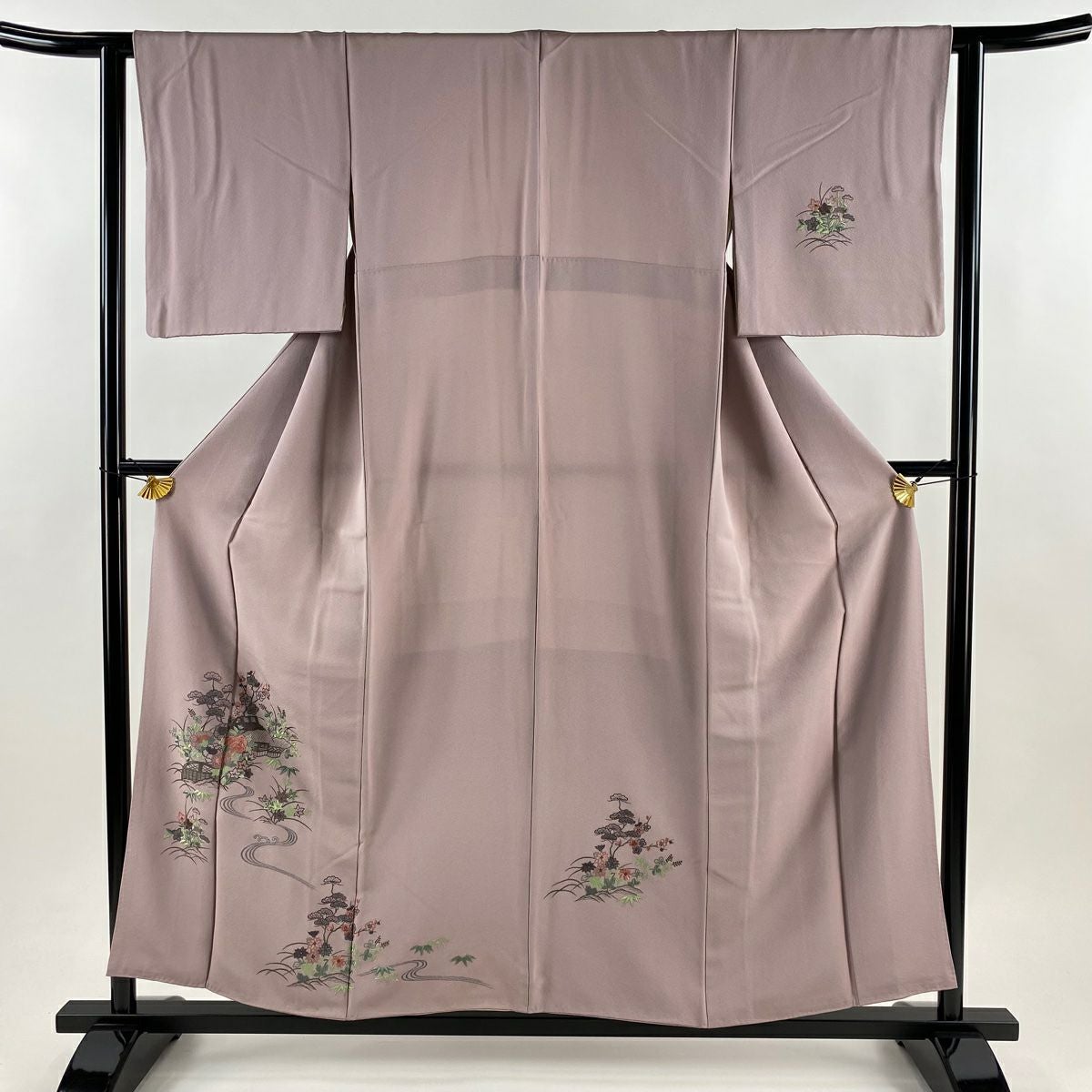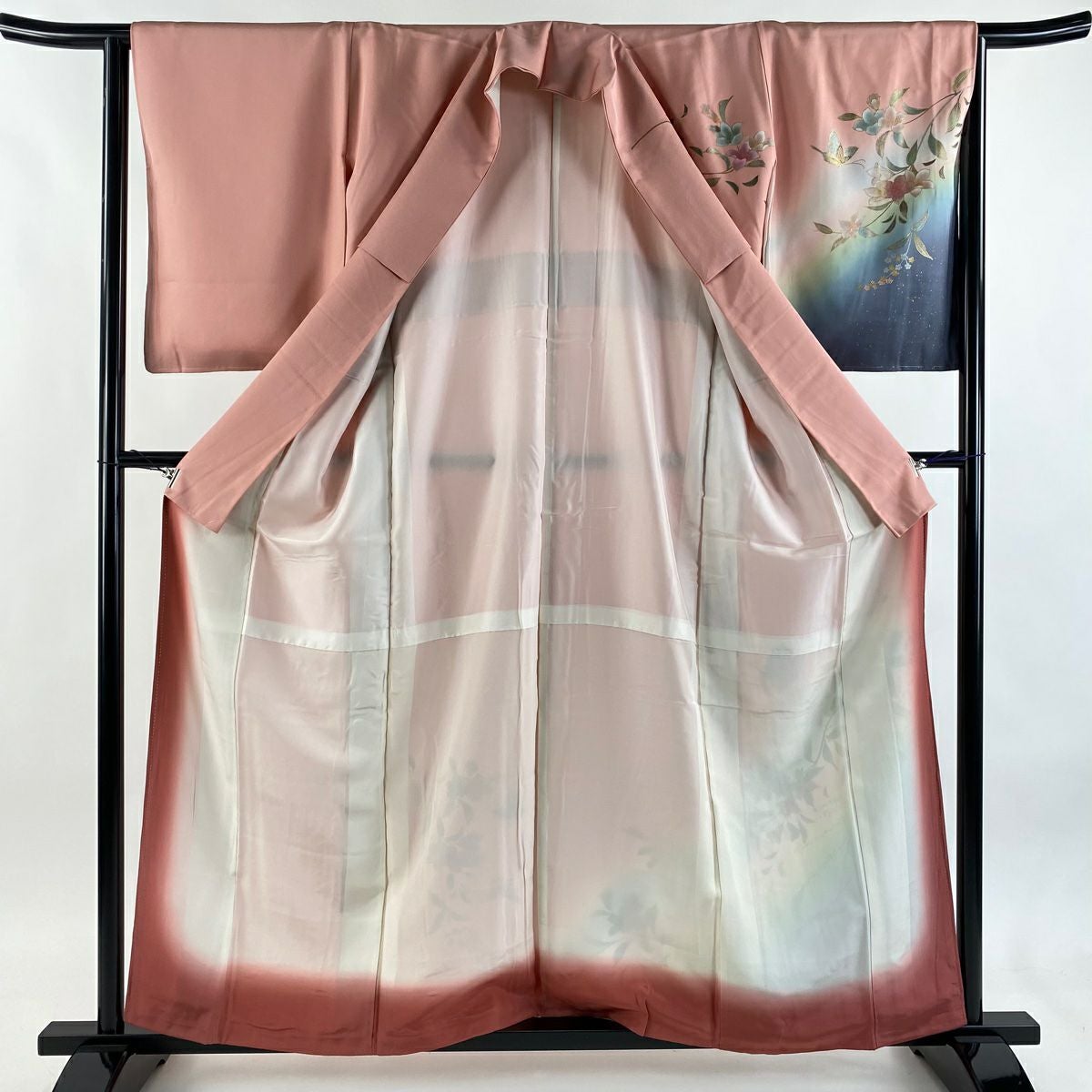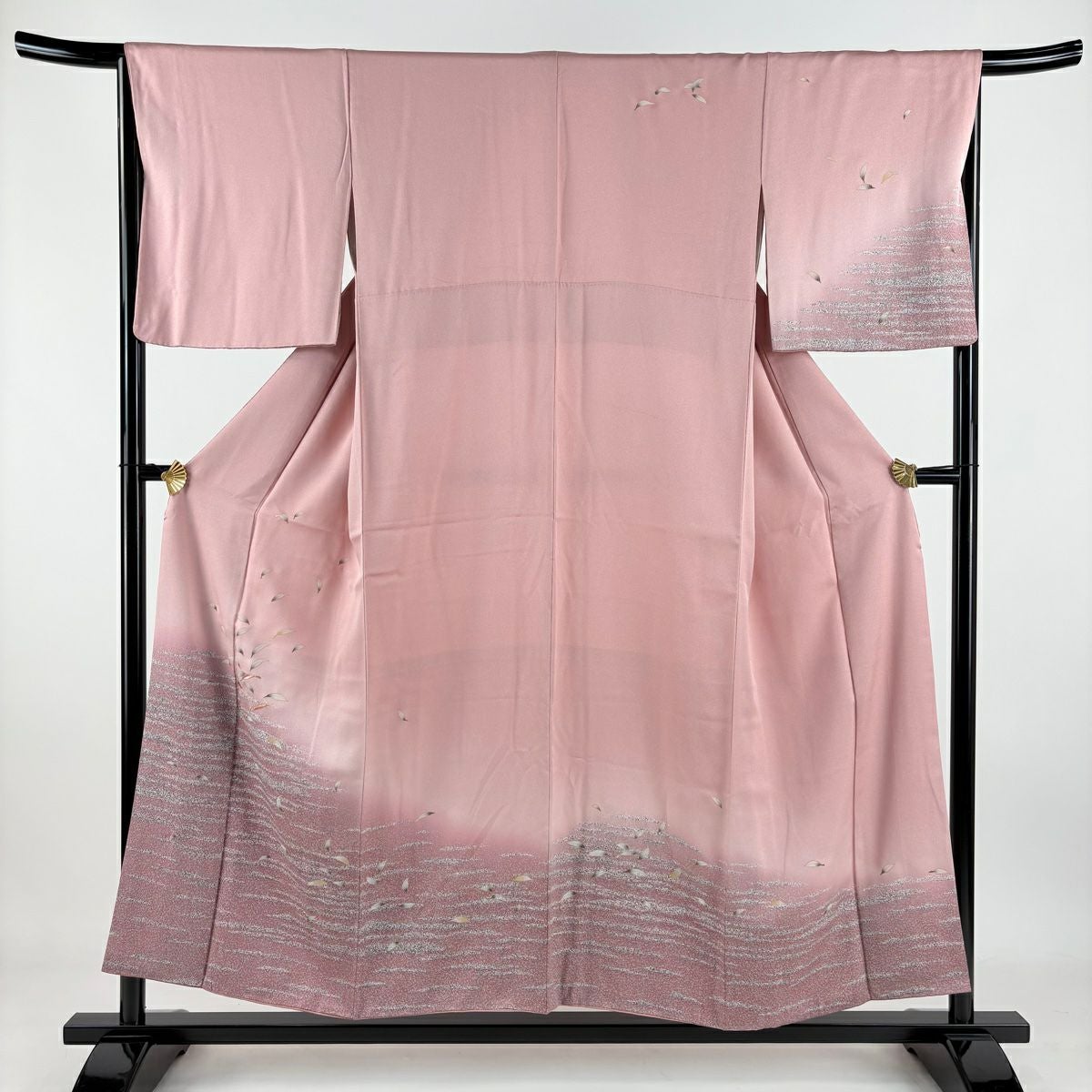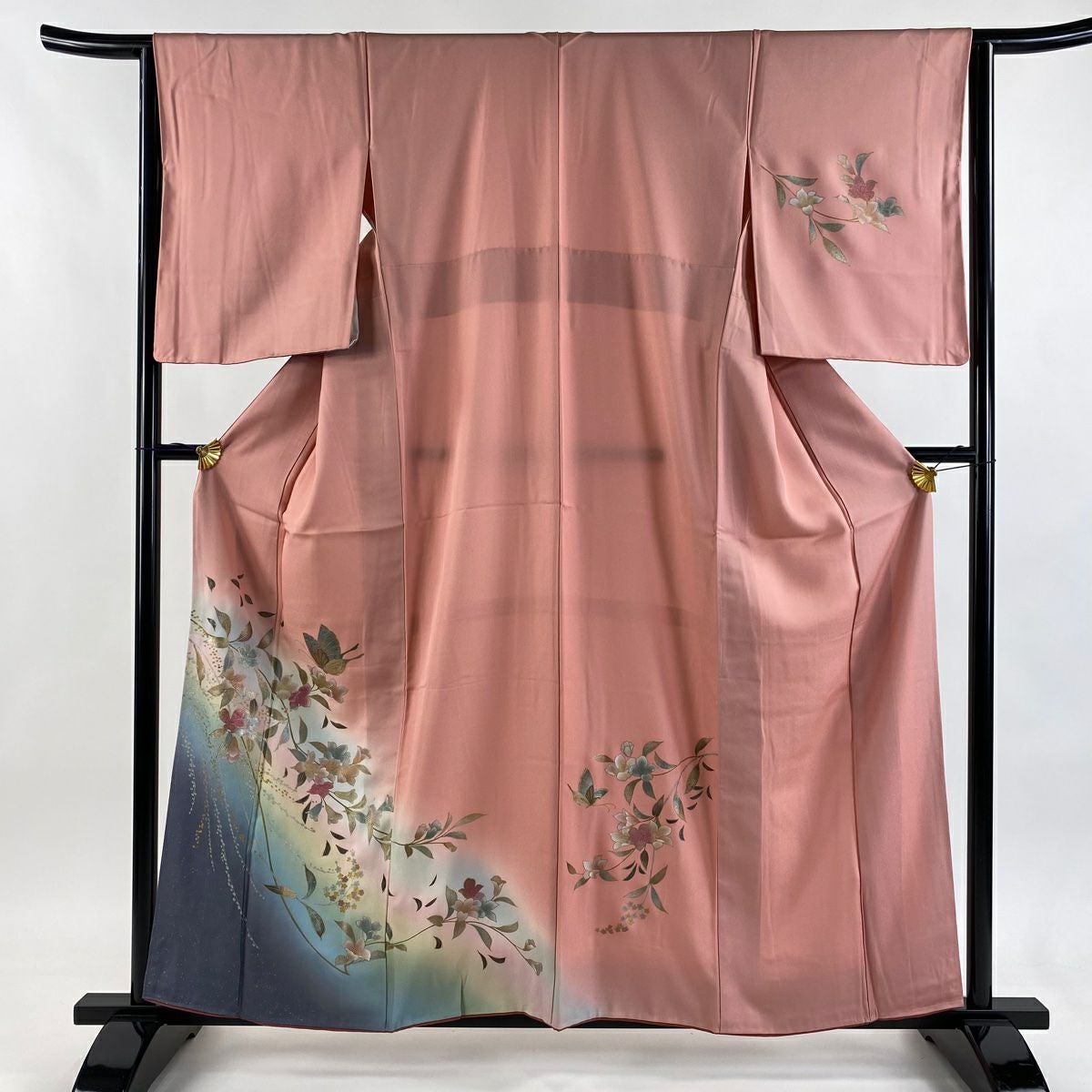 【在庫一掃】 訪問着 身丈156cm 裄丈64cm M 袷 草花 流水 金彩 ぼかし ピンク 正絹 秀品