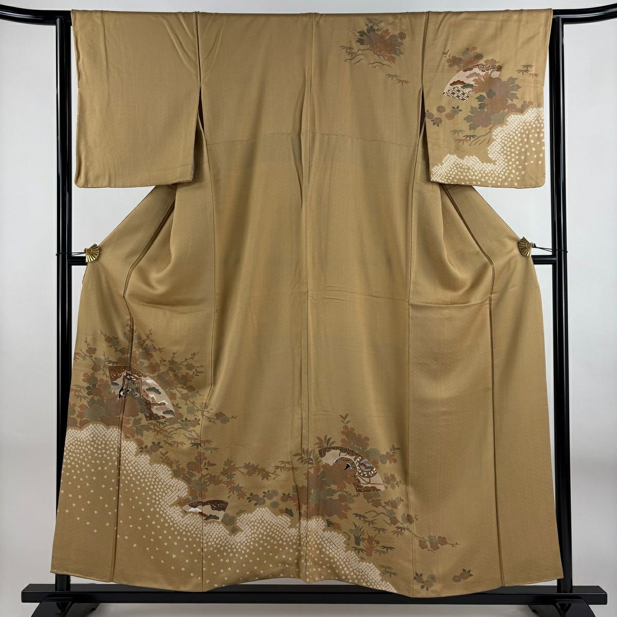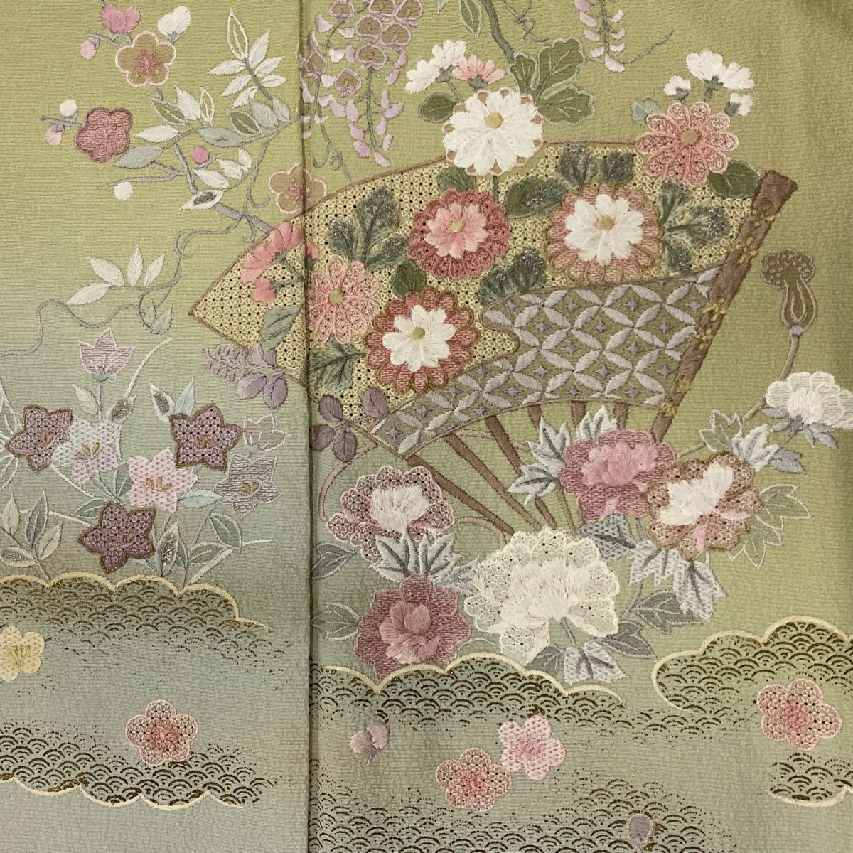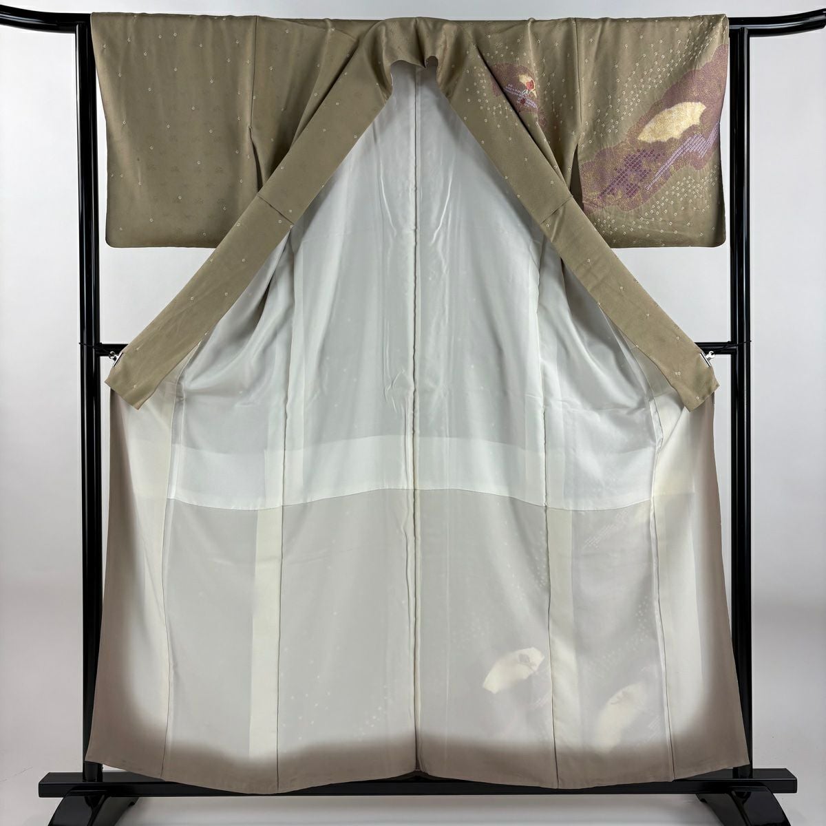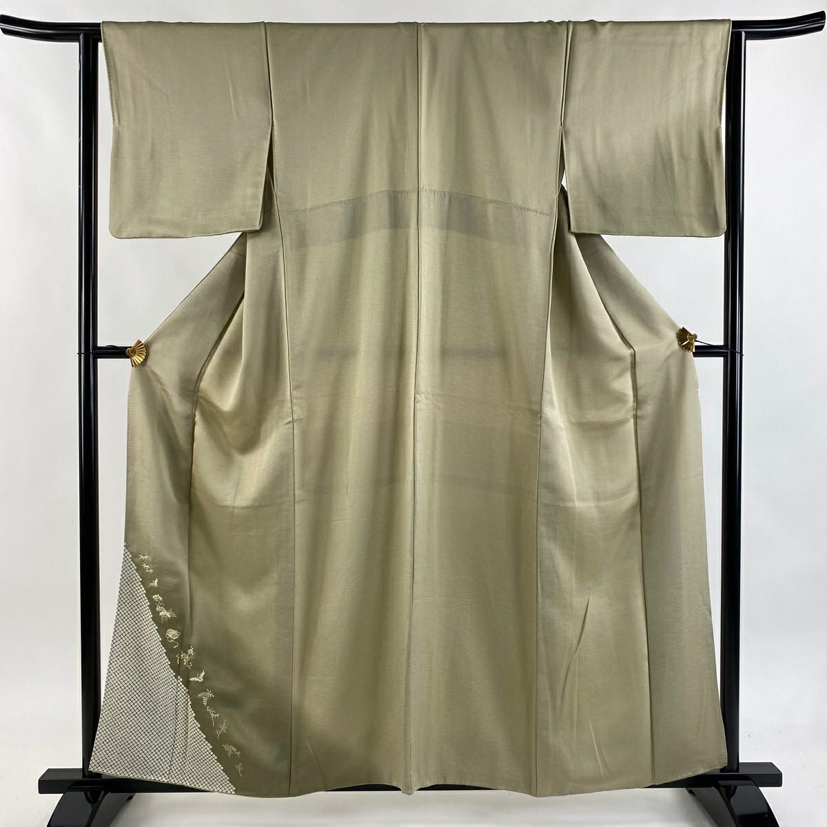 【在庫一掃】 付下げ 身丈154.5cm 裄丈62.5cm S 袷 扇 草花 刺繍 金銀彩 抹茶色 正絹 秀品